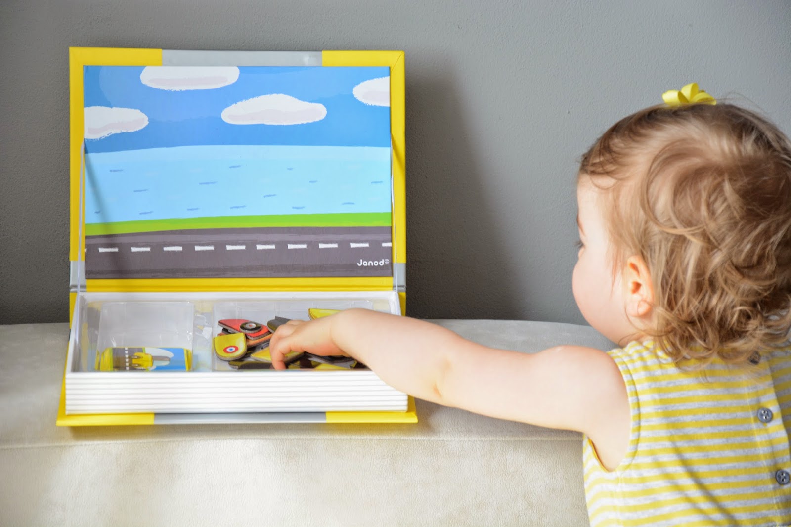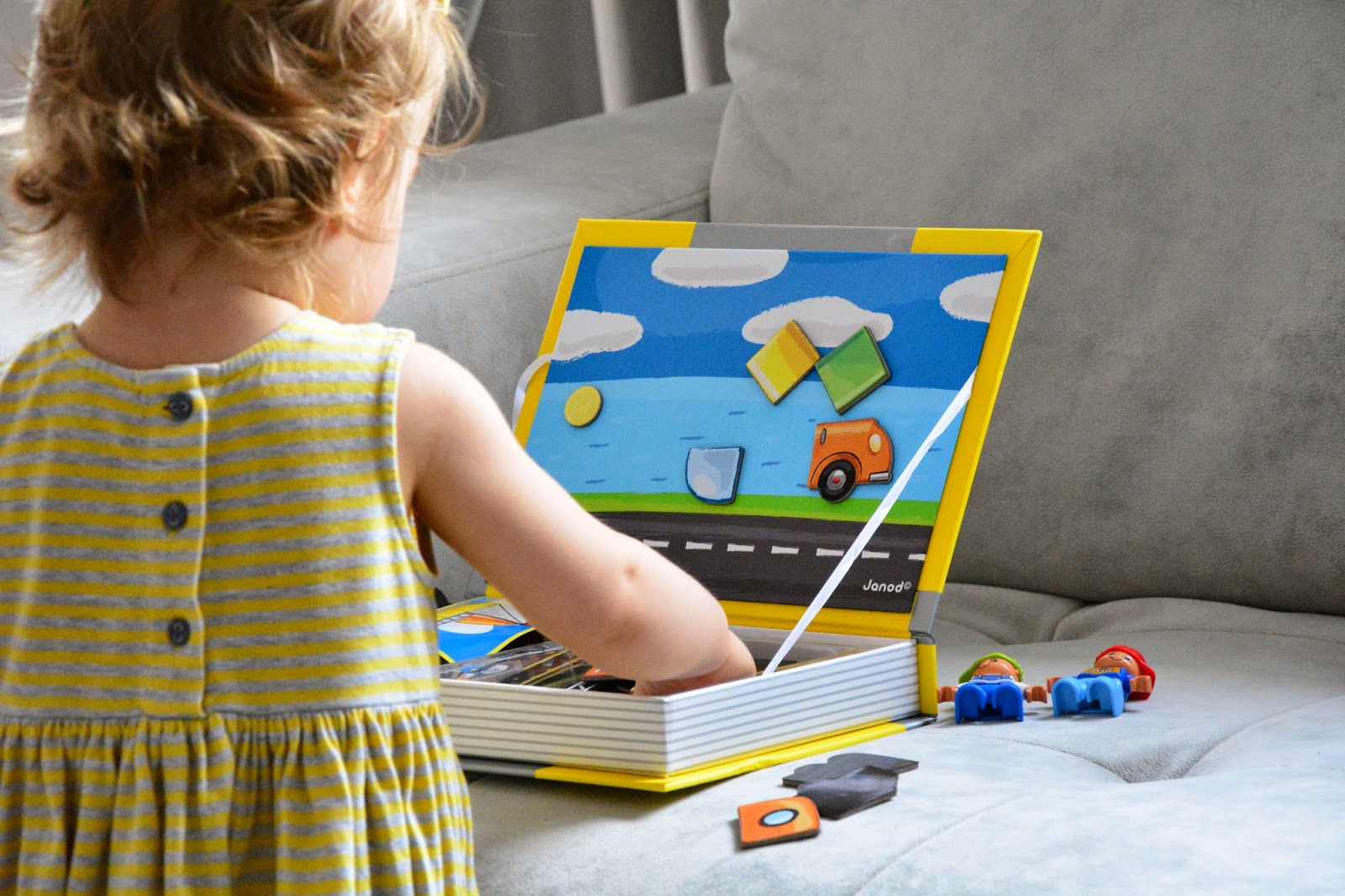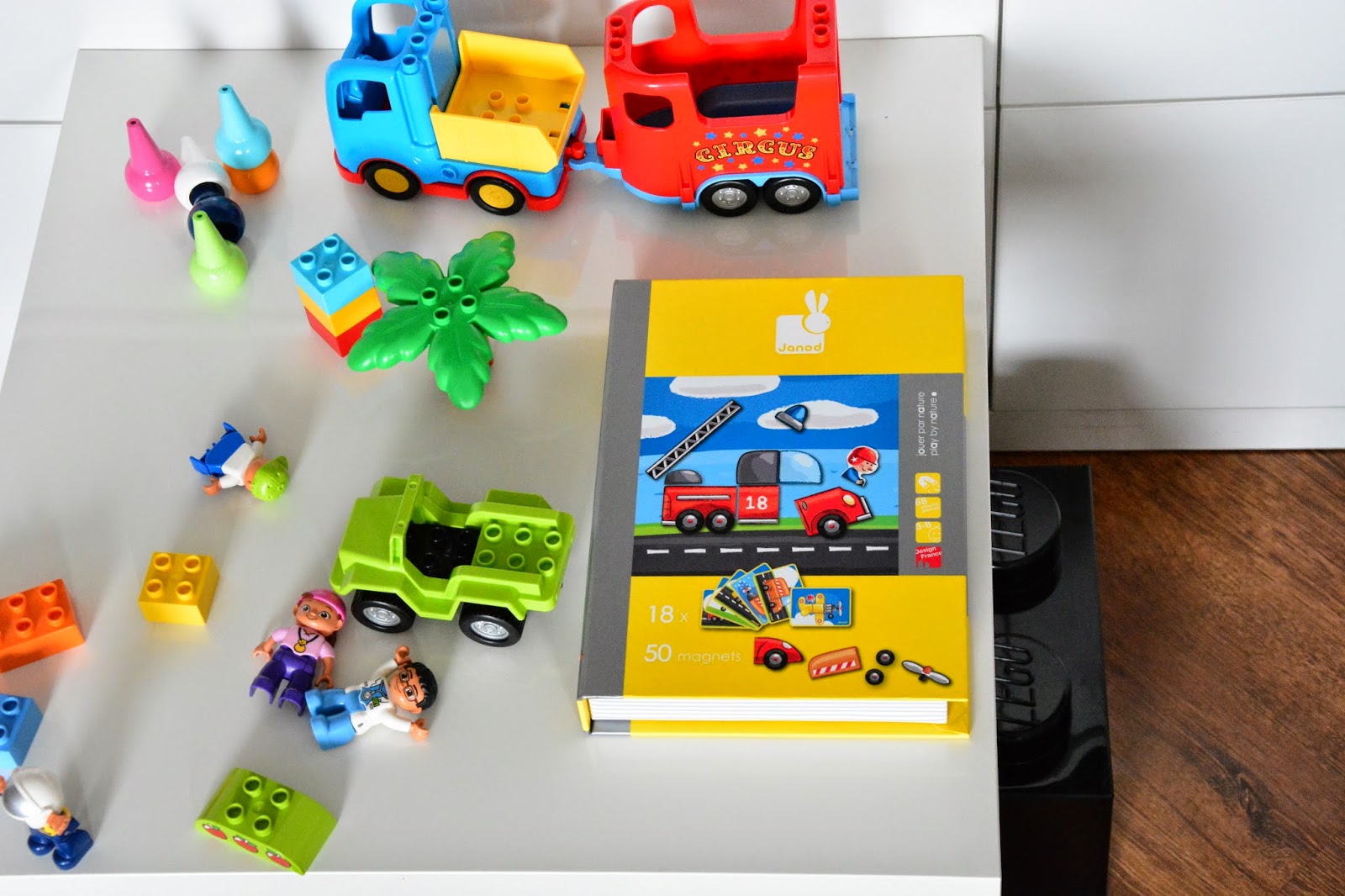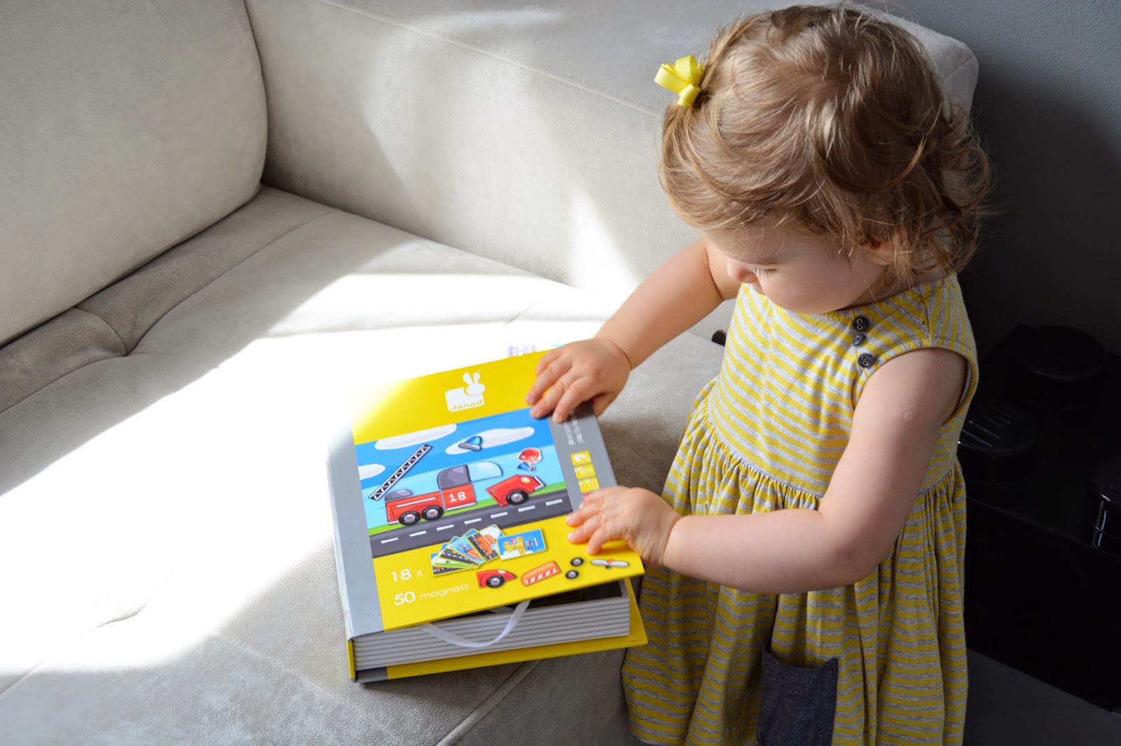 U nas są takie zabawki, które zawsze ratują sytuację, kiedy potrzeba żeby dziecko zajęło się chwilę sobą. Oczywiście Lego i od niedawna Magnetibook Janod. Nie da się ukryć, że mała Bubulinka podkrada zabawki bratu, nie da rady czasem żeby on mógł pobawić się czymś sam bez zamykania drzwi pokoju. Dlatego muszę uważać, żeby zabawek typowo niebezpiecznych dla półtoraroczniaka nie było w domu lub stały wysoko na półce. Czasem zadziwia mnie, że mała wykazuje nawet większe zainteresowanie, ma więcej cierpliwości, chęci odkrywania. Wiadomo, nie dorówna starszemu w układaniu kształtów samolotów czy wyścigówek ale czas jaki poświęci na przyczepianiu, odczepianiu, segregowaniu i wyrzucaniu magnesów pozwoli mi spokojnie wypić popołudniową kawę.