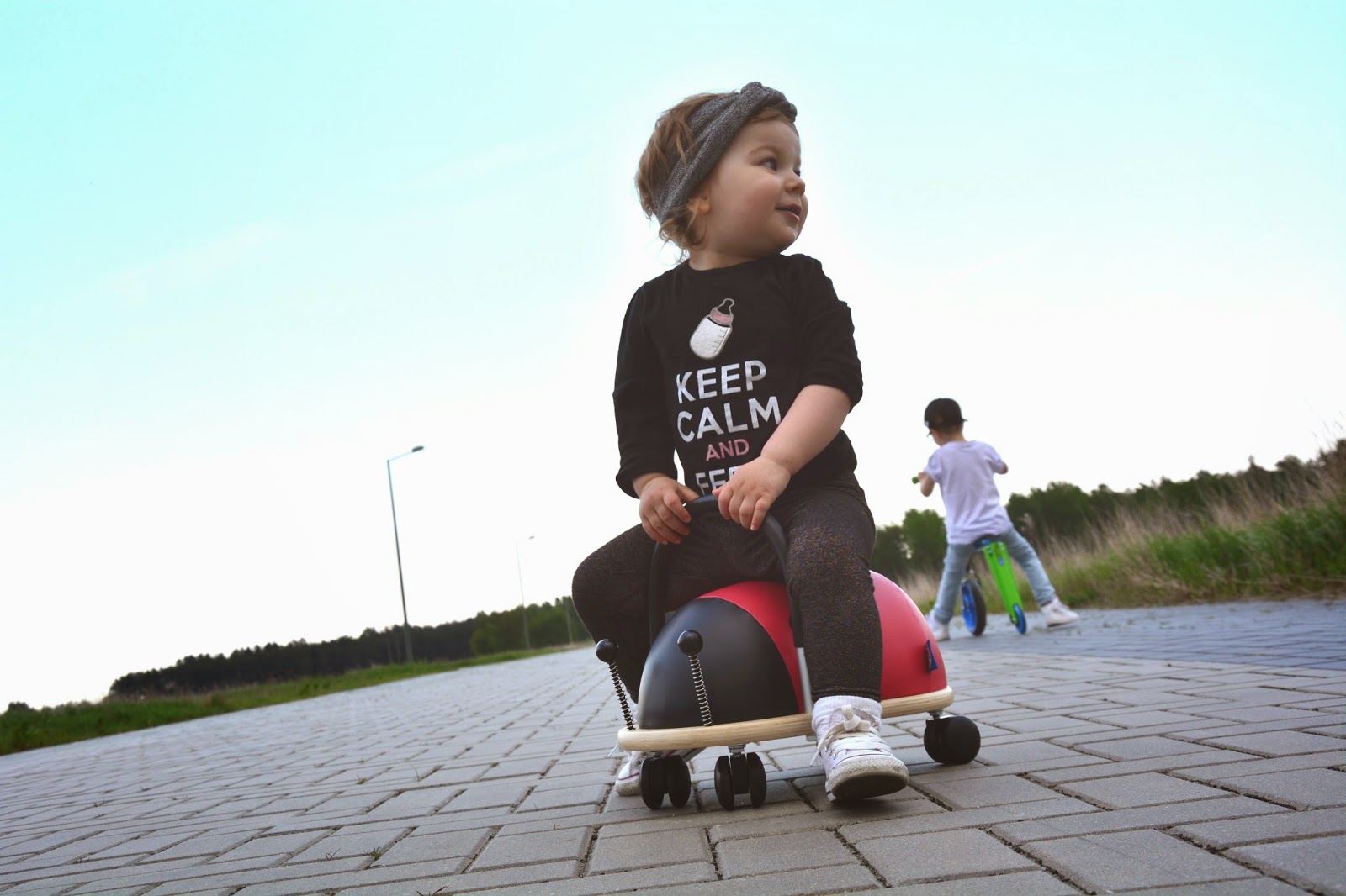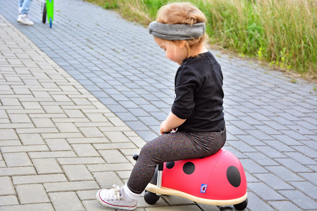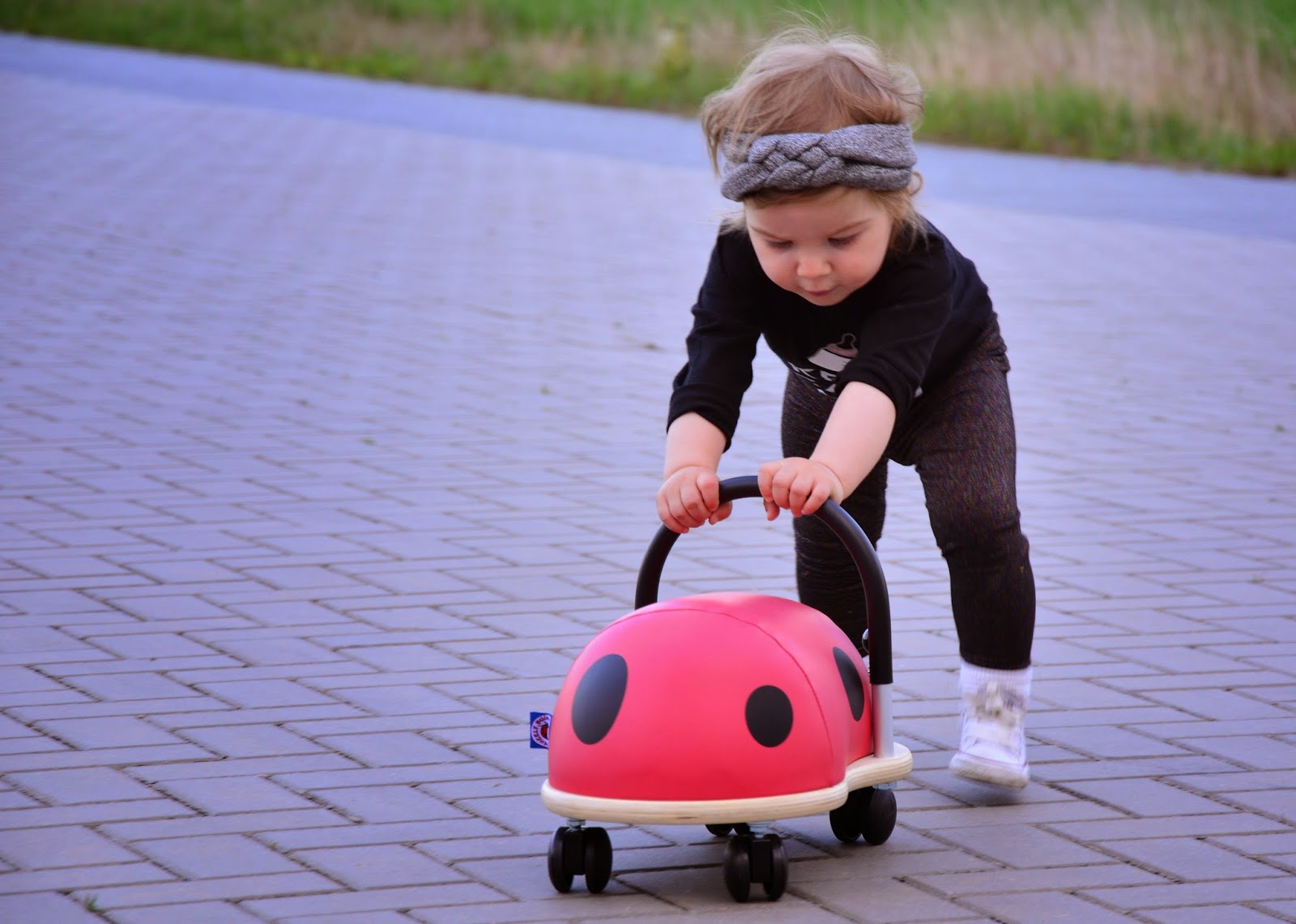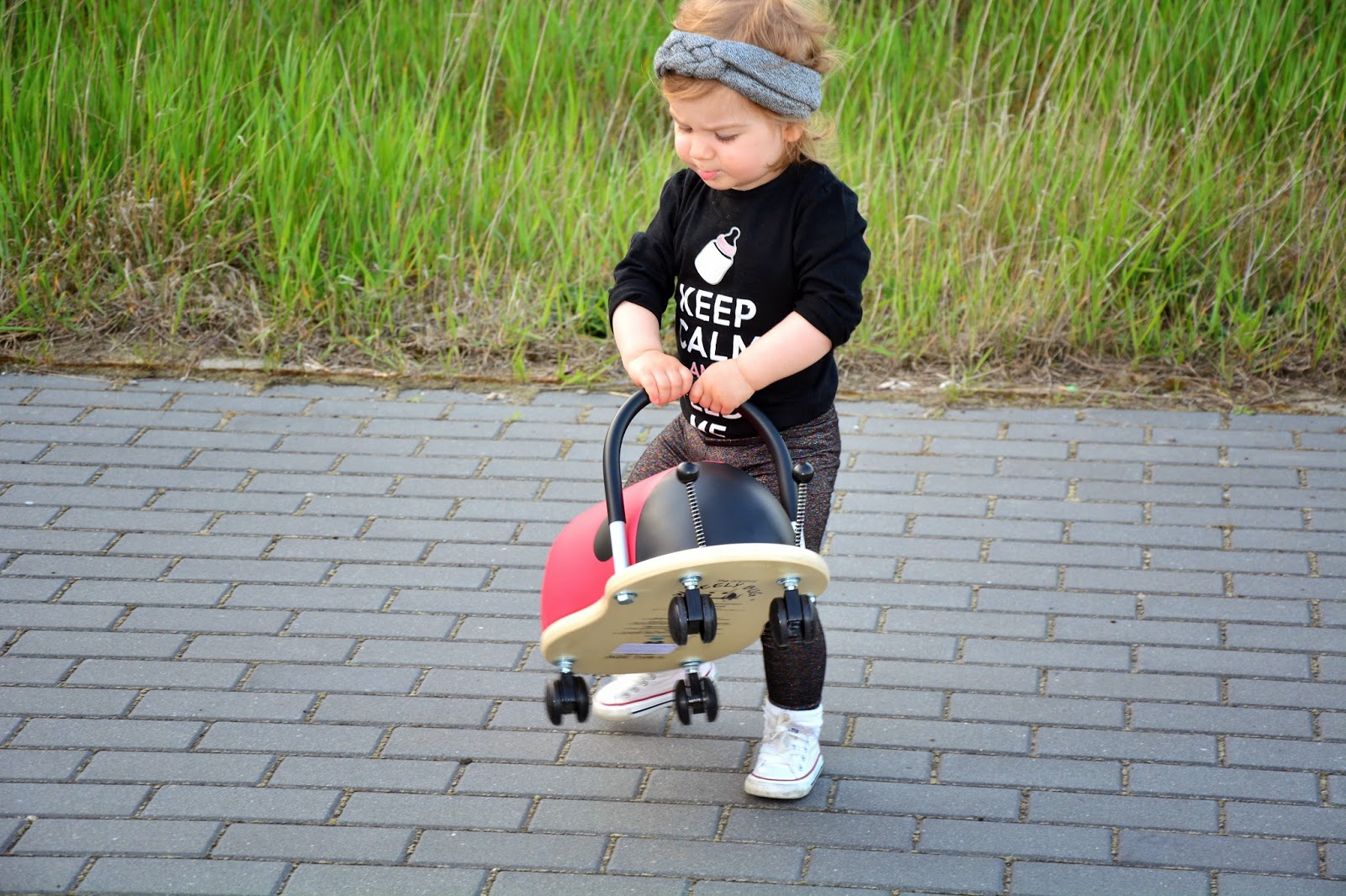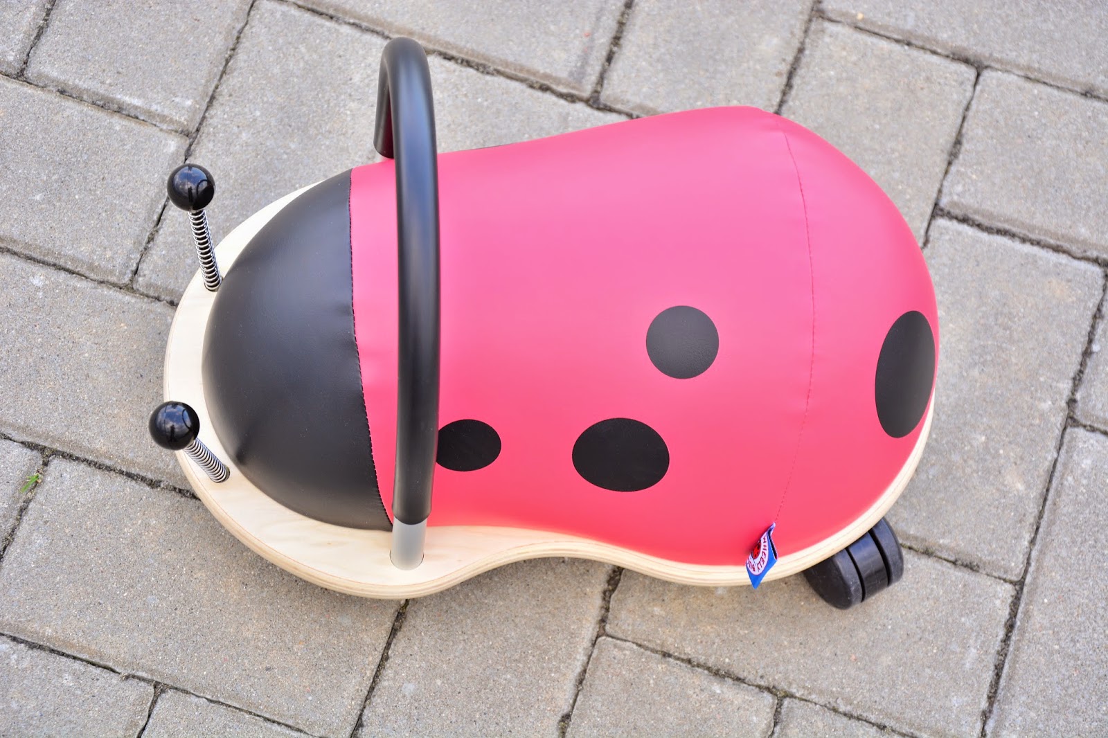 Jeździki, chodziki, wózeczki, pchacze, jest niesamowity wybór kolorowych, grających sprzętów ale tego jeszcze nie mieliśmy. Nie przydały nam się najnowsze wynalazki do nauki chodzenia, moi mali geniusze zaczęli chodzić wcześnie, pięknie, samodzielnie. Młody miał 9 miesięcy jak pofrunął na swoich silnych nóżkach, mała trochę później a przysłowiowy roczek przemaszerowała dumnie. Miłość do jeżdżenia widać u niej już od dłuższego czasu jak już wsiądzie na jakieś małe autko to strach podejść bo zejść nie chce, szukałam czegoś fajnego, zwinnego, Ładnego i ciekawego. Moja naturalna potrzeba wszystkiego innego, nie szablonowego wepchnęła mnie prosto na tę Biedronę – Wheely Bug. Drewno, aluminium, ekoskóra, czerwona w czarne kropy – Gaston z Bajki Małe Królestwo Bena i Holly ;D Oglądacie? Przesłodka jest ta Bubulinka jak kręci się z nim w kółko! Ma nawet jakieś szanse w wyścigach z bratem na hulajnodze, zasuwa nóżeczkami po bokach czerwonego stwora a obrotowe kółeczka zaprowadzą ją w każdą stronę. Jest super zwrotny i stabilny, można na nim jeździć, pchać z przodu i z tyłu, dla 16sto miesięcznego brzdąca rozmiar w sam raz, myślę, że byłby też super towarzyszem w tych najwcześniejszych pierwszych wycieczkach i przy nauce chodzenia!