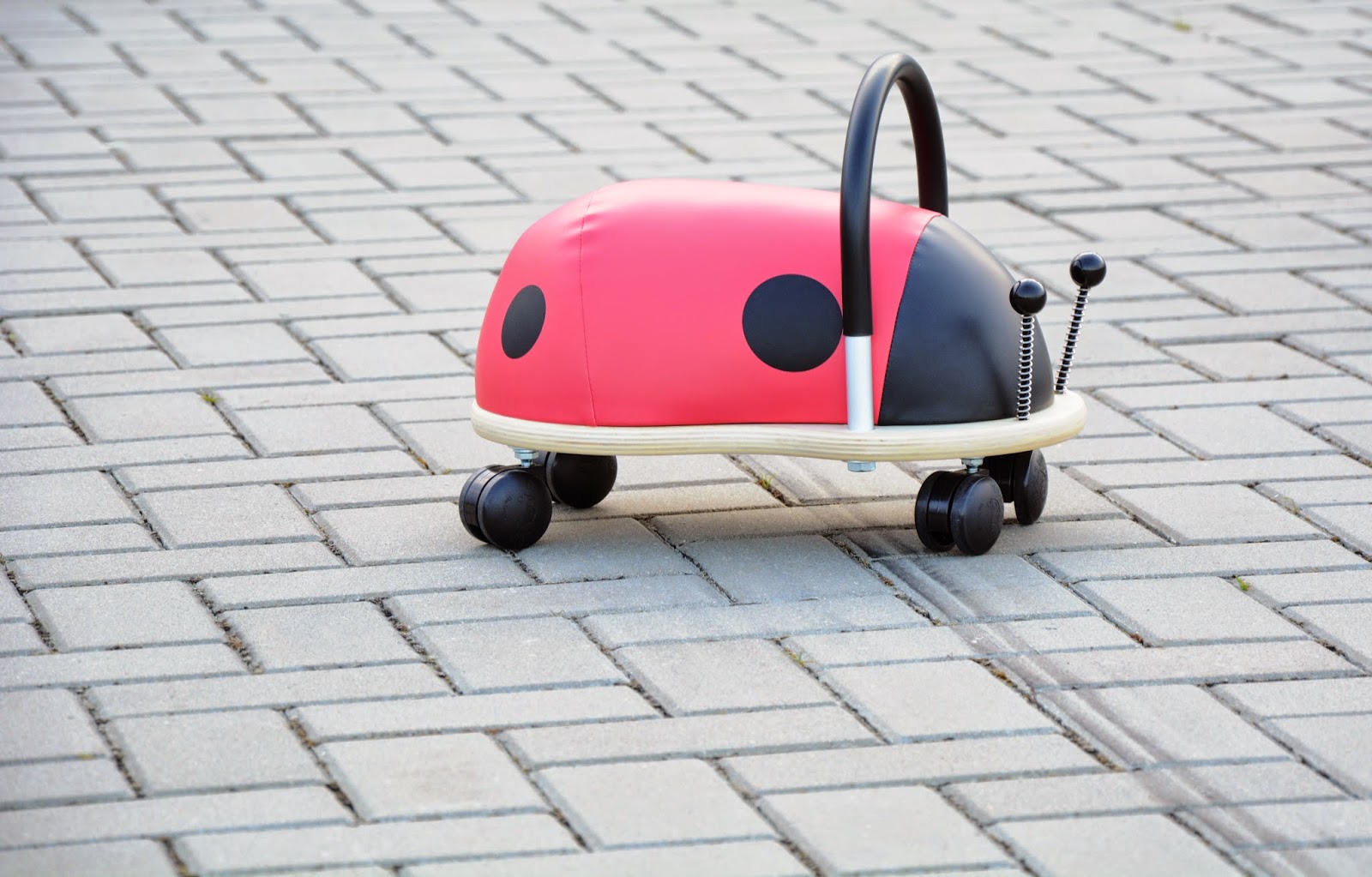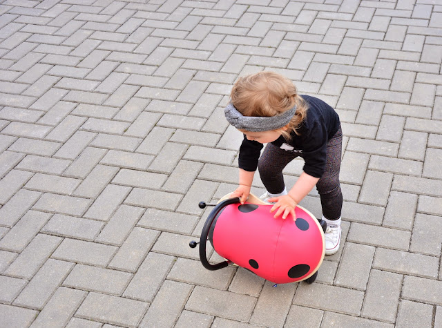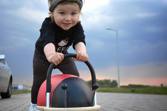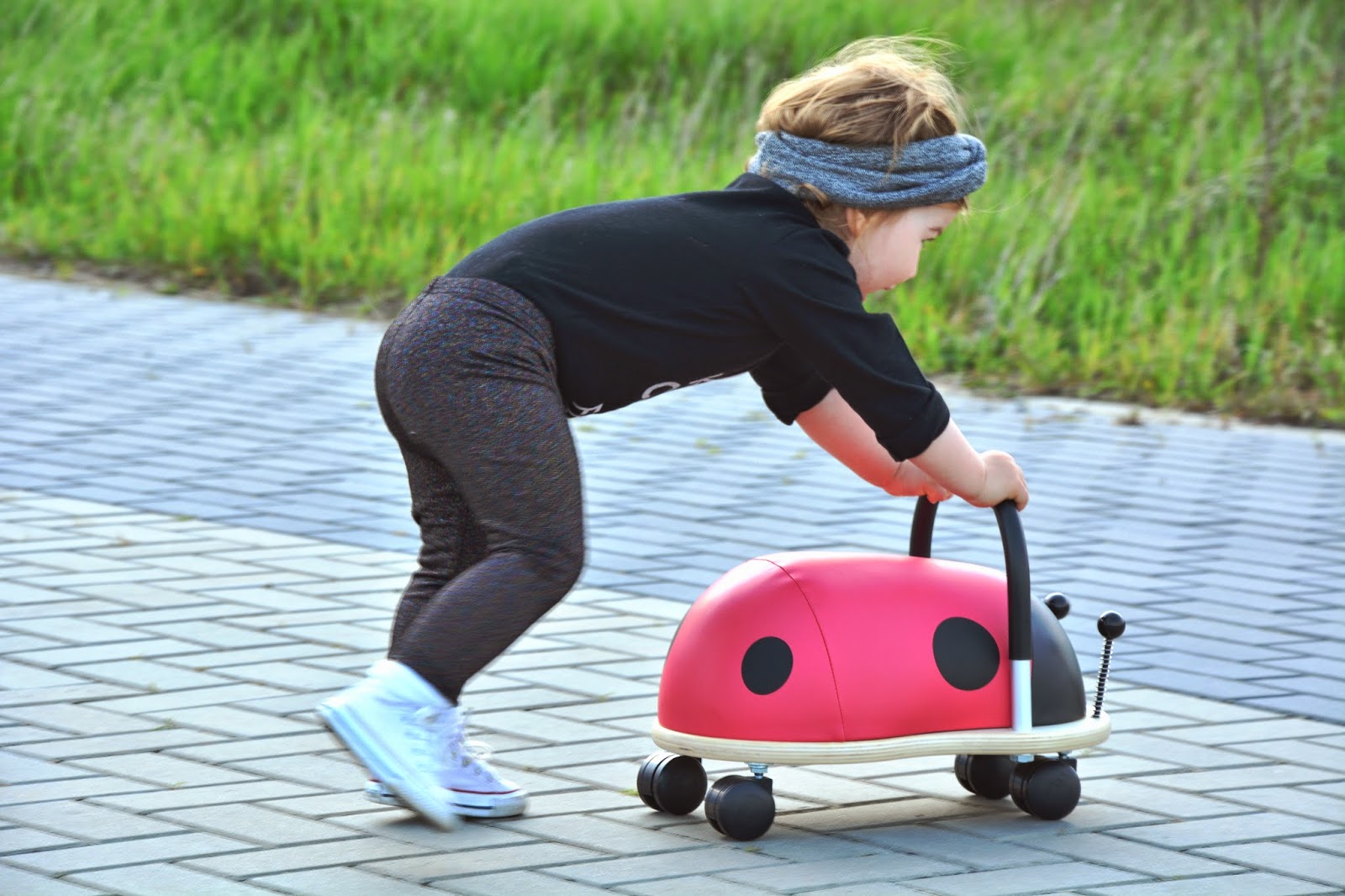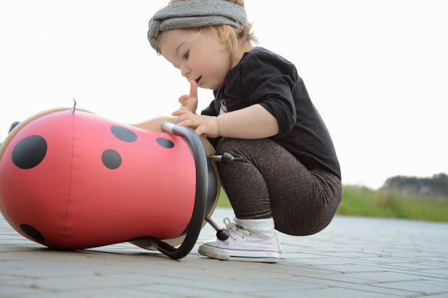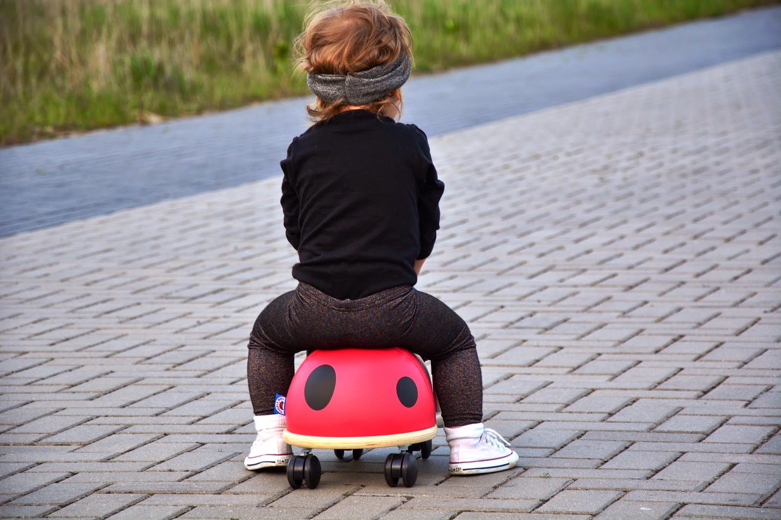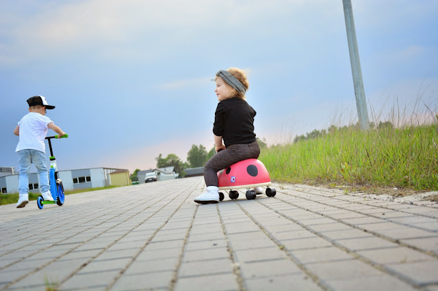 Jeździki, chodziki, wózeczki, pchacze, jest niesamowity wybór kolorowych, grających sprzętów ale tego jeszcze nie mieliśmy. Nie przydały nam się najnowsze wynalazki do nauki chodzenia, moi mali geniusze zaczęli chodzić wcześnie, pięknie, samodzielnie. Młody miał 9 miesięcy jak pofrunął na swoich silnych nóżkach, mała trochę później a przysłowiowy roczek przemaszerowała dumnie. Miłość do jeżdżenia widać u niej już od dłuższego czasu jak już wsiądzie na jakieś małe autko to strach podejść bo zejść nie chce, szukałam czegoś fajnego, zwinnego, Ładnego i ciekawego. Moja naturalna potrzeba wszystkiego innego, nie szablonowego wepchnęła mnie prosto na tę Biedronę – Wheely Bug. Drewno, aluminium, ekoskóra, czerwona w czarne kropy – Gaston z Bajki Małe Królestwo Bena i Holly ;D Oglądacie? Przesłodka jest ta Bubulinka jak kręci się z nim w kółko! Ma nawet jakieś szanse w wyścigach z bratem na hulajnodze, zasuwa nóżeczkami po bokach czerwonego stwora a obrotowe kółeczka zaprowadzą ją w każdą stronę. Jest super zwrotny i stabilny, można na nim jeździć, pchać z przodu i z tyłu, dla 16sto miesięcznego brzdąca rozmiar w sam raz, myślę, że byłby też super towarzyszem w tych najwcześniejszych pierwszych wycieczkach i przy nauce chodzenia!