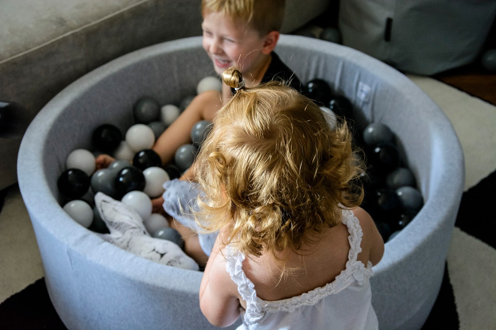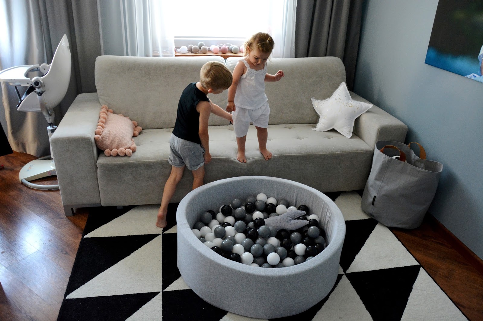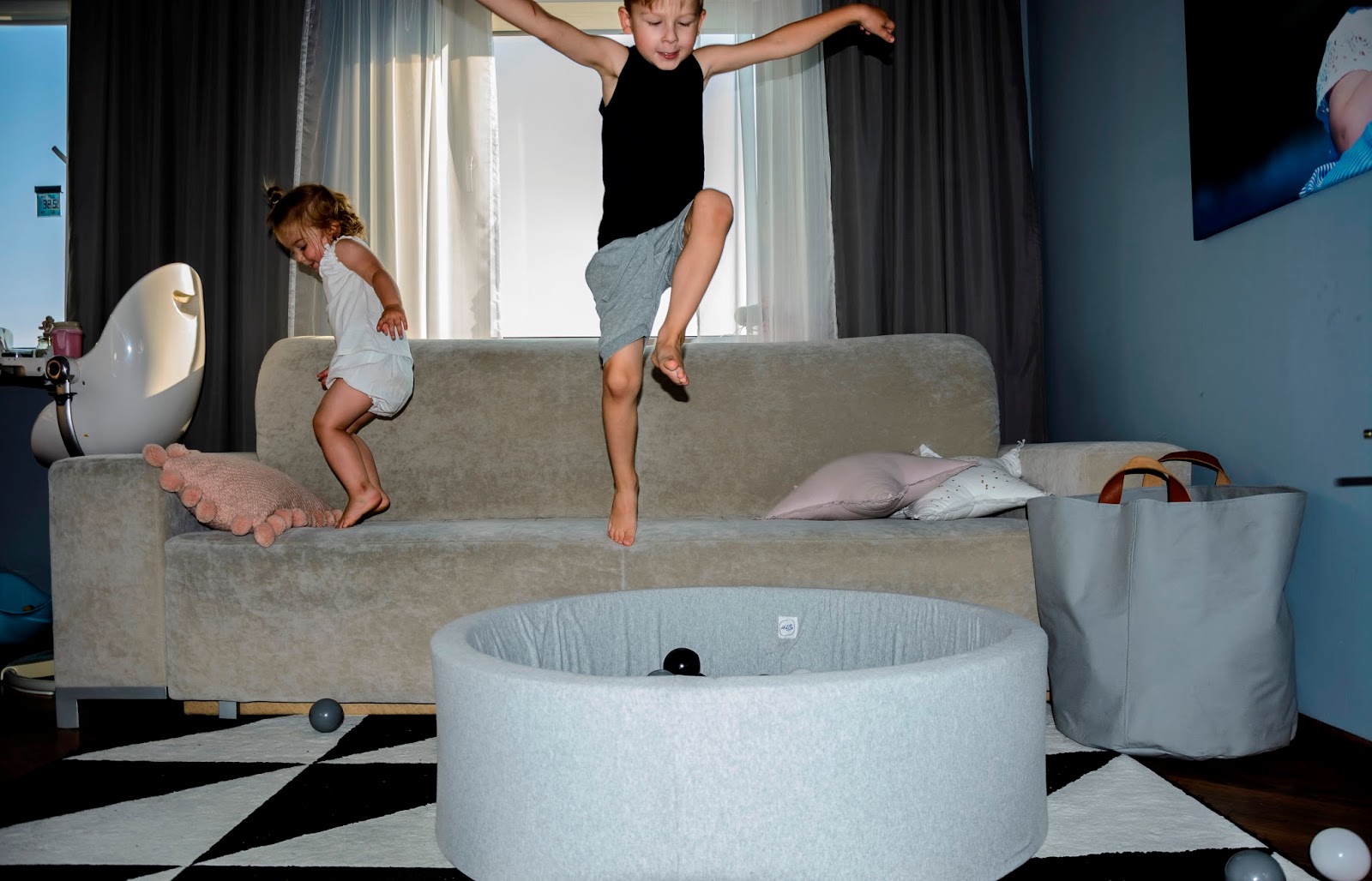 Rodzice tak często o tym zapominają, chcąc mieć grzeczne dziecko i spokój w domu. Sama się czasem na tym łapię, kiedy zmęczona odczuwam dosłownie fizyczny ból w uszach od pisków, tupania nogami i wyścigów urządzanych w mieszkaniu. Nie zawsze potrafię wytrzymać wymachiwanie rękami i niekończące się trzęsienie ziemi kiedy dzieci są w pobliżu. Ale to ich prawo i ich potrzeba. Dlatego nie zdziwiłam się zbytnio kiedy rozłożyłam im ten wspaniały basenik z kulkami i pierwsze co zrobili to skoczyli do niego z kanapy. A widok tych skoków z bezpieczeństwem niewiele miał wspólnego. Raz, drugi, dziesiąty i tak do kilku dni non stop. Szykowałam się raczej może na bitwę na kulki? Może na wylegiwanie na przyjemnie chłodnych piłeczkach, czy przegarnianie ich rączkami? Tak na spokojnie, wiesz? Nie, nie one, nie moje. Te jak zaczęły skakać, tak musiałam sukcesywnie pozbywać ich coraz to innych części garderoby przemoczonych od potu. Trudno było też tę zabawę przerwać, uwaga! graniczy z cudem. Nie bez powodu basen Mini.be nazywają zabawką wszechczasów. Masz taki mini park rozrywki we własnym domu.