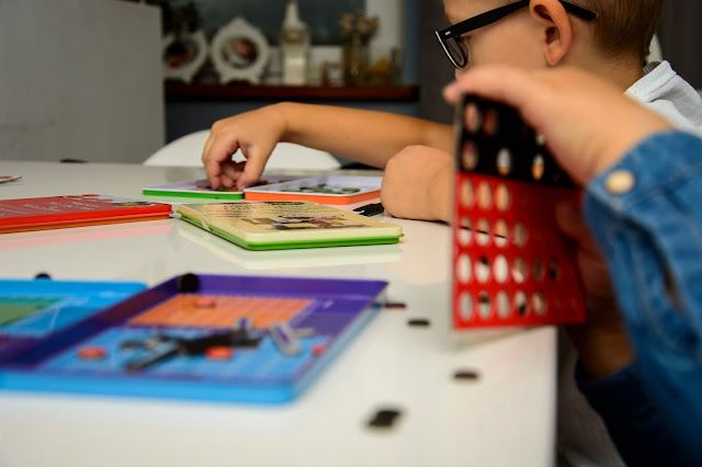 A są, znalazłam takie sposoby. Niezapomniane i ponadczasowe – gry. Zaczęliśmy od najprostszych – kółko-krzyżyk, warcaby a później statki i drogowe korki. Byłam ciekawa jak młody je przyjmie, małe metalowe opakowania zaciekawiły go od razu, zabawa przy wypikiwaniu elementów z szablonów, żeby poznać zasady i zacząć grę wciągnęła tez Natkę. Ona na tym skończyła a on zaczął na całego! Spodobało mu się, wieczór był nasz i jeszcze nie jeden będzie a mi dość szybko przypomniały się wszystkie zasady mimo, że nie grałam tak od lat!