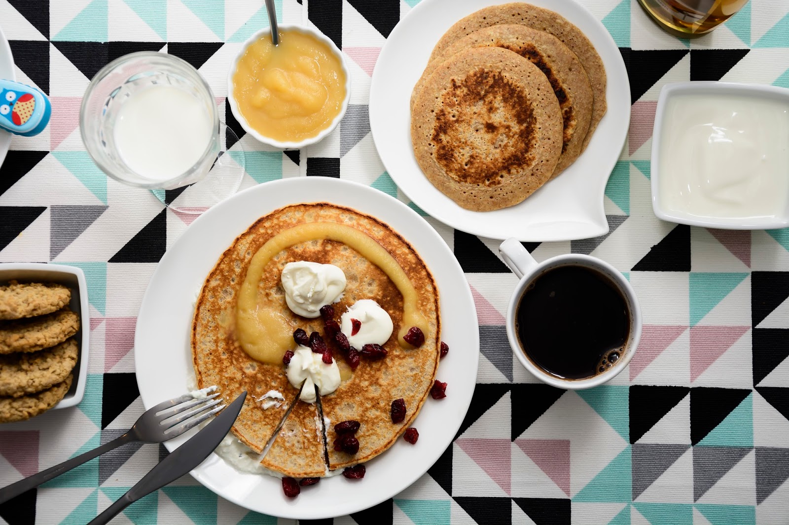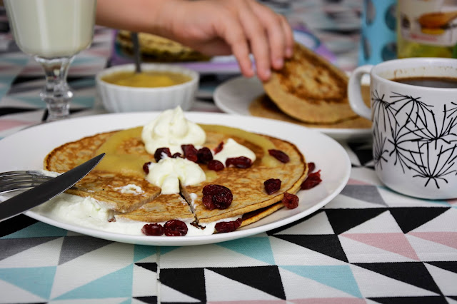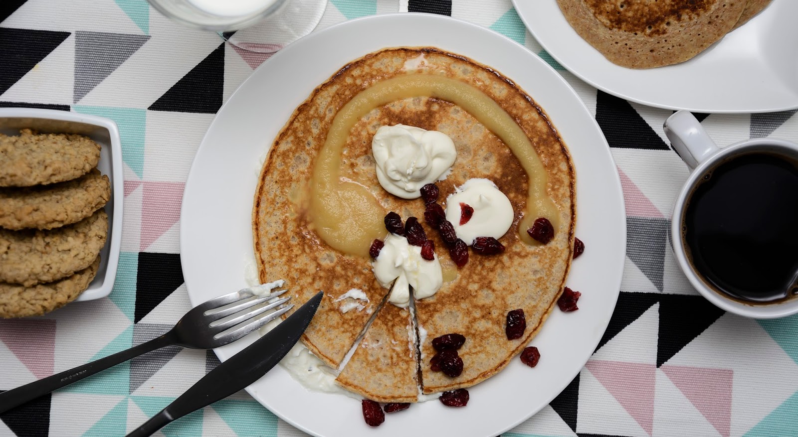 Na śniadanie zaserwowałam naleśniki z mąki razowej z serem, musem jabłkowym i żurawiną.