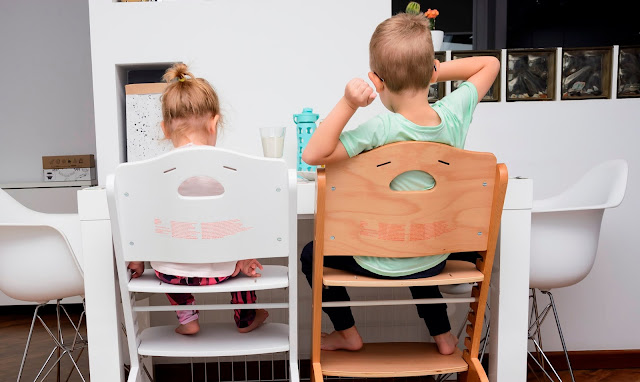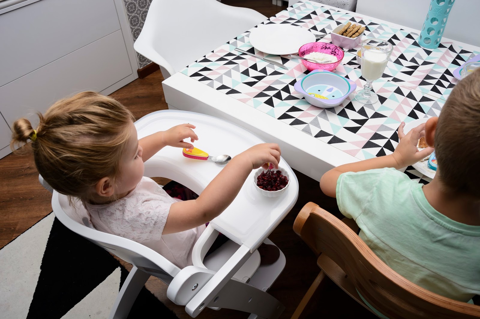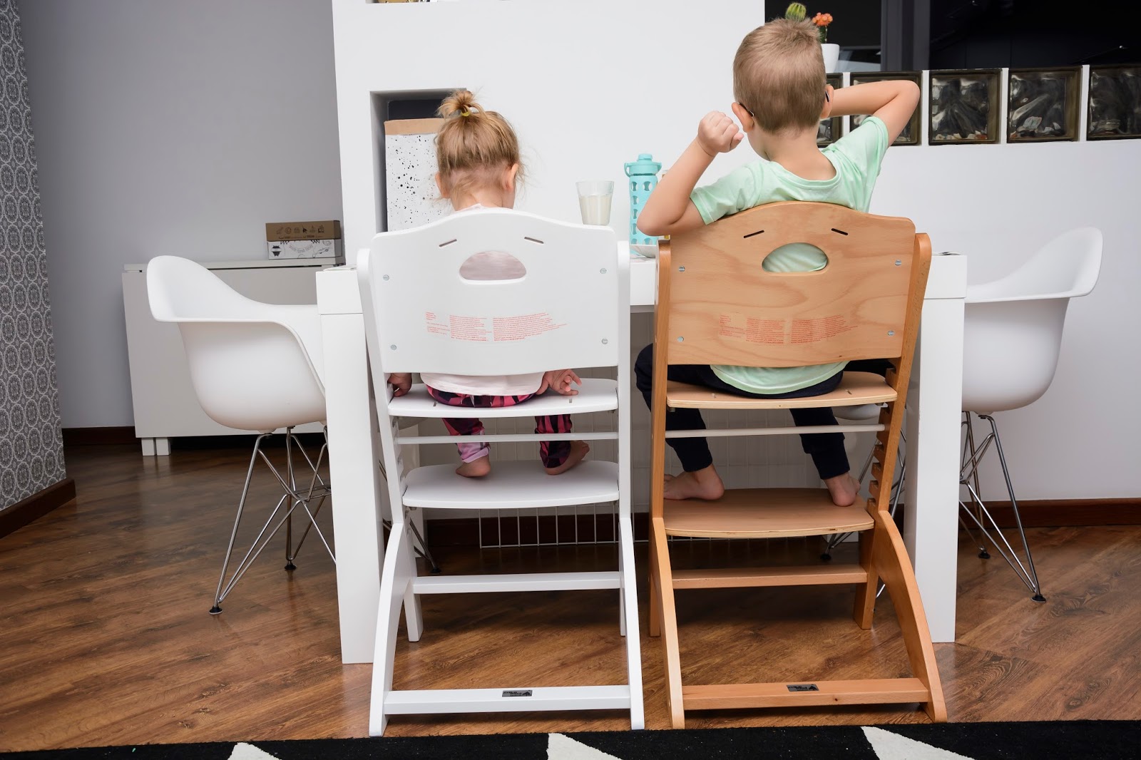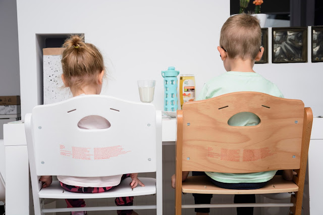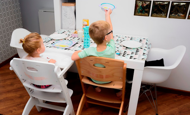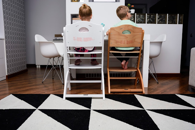 Nasz wspólny obiad wygląda teraz zupełnie inaczej i częściej mamy na niego ochotę. Krzesełka stoją dwa takie same, nie ma kłótni o to kto gdzie siedzi i które jest czyje. Rozmontowaliśmy już obydwa do wersji dla starszego dziecka, czyli bez szelek, bez zabezpieczenia i bez tacki, żeby można było je wsunąć pod stół i zajmują minimum miejsca. Do śniadania, obiadu, do rysowania i grania teraz mamy wymarzone warunki, a plecki proste i dzieciom wygodnie.