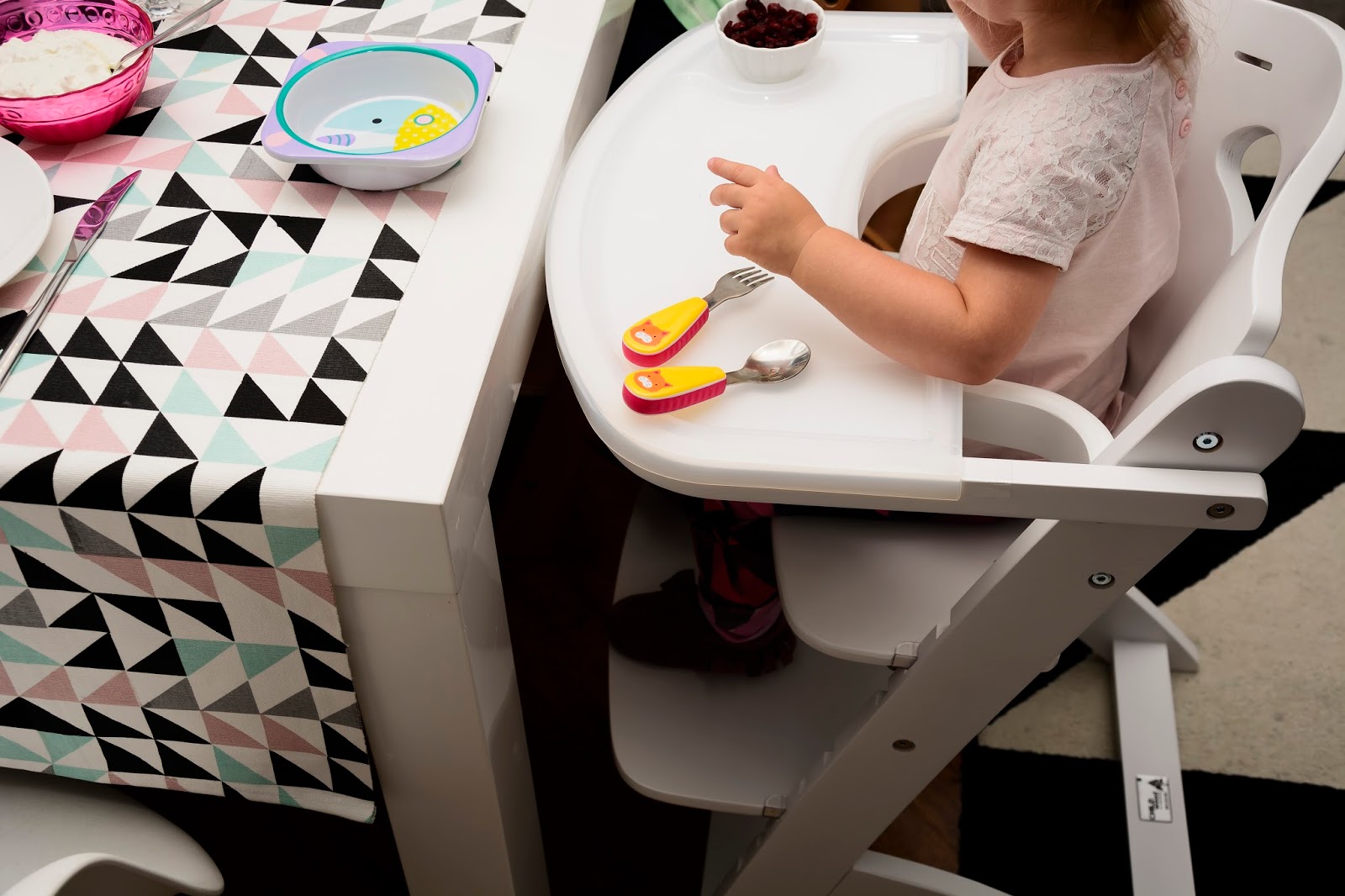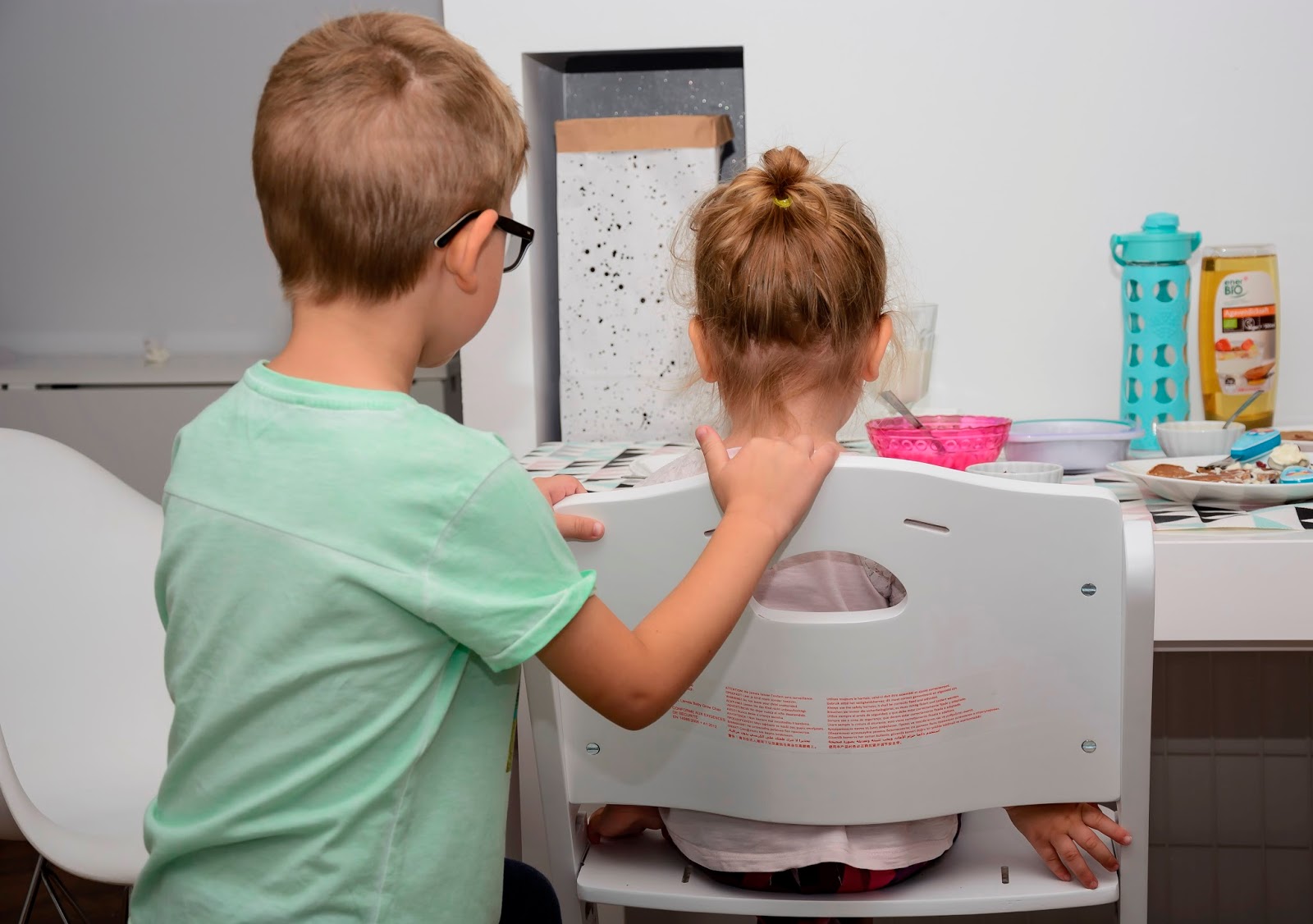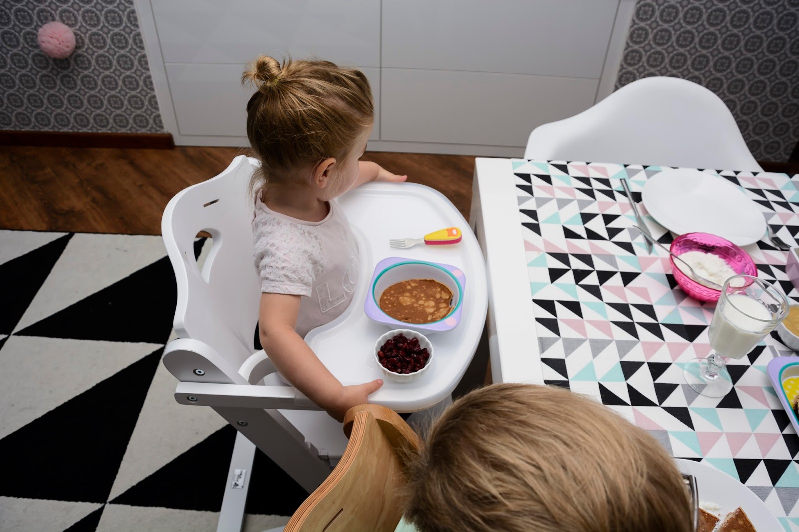Nasz wspólny obiad wygląda teraz zupełnie inaczej i częściej mamy na niego ochotę. Krzesełka stoją dwa takie same, nie ma kłótni o to kto gdzie siedzi i które jest czyje. Rozmontowaliśmy już obydwa do wersji dla starszego dziecka, czyli bez szelek, bez zabezpieczenia i bez tacki, żeby można było je wsunąć pod stół i zajmują minimum miejsca. Do śniadania, obiadu, do rysowania i grania teraz mamy wymarzone warunki, a plecki proste i dzieciom wygodnie.