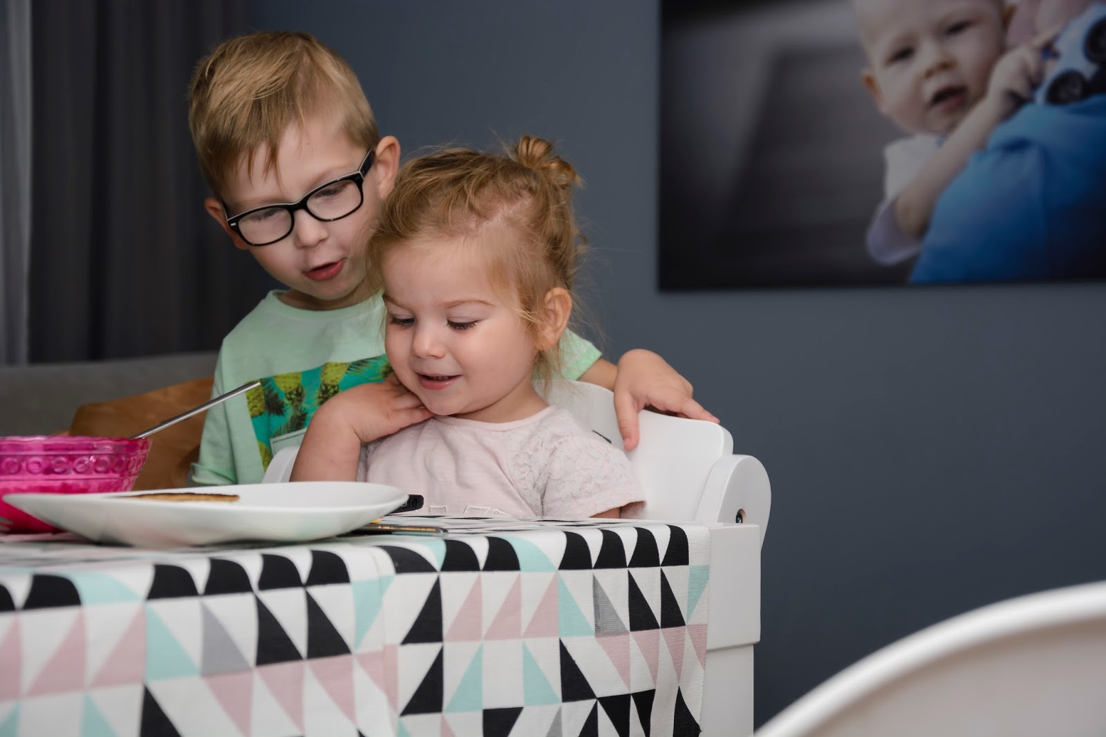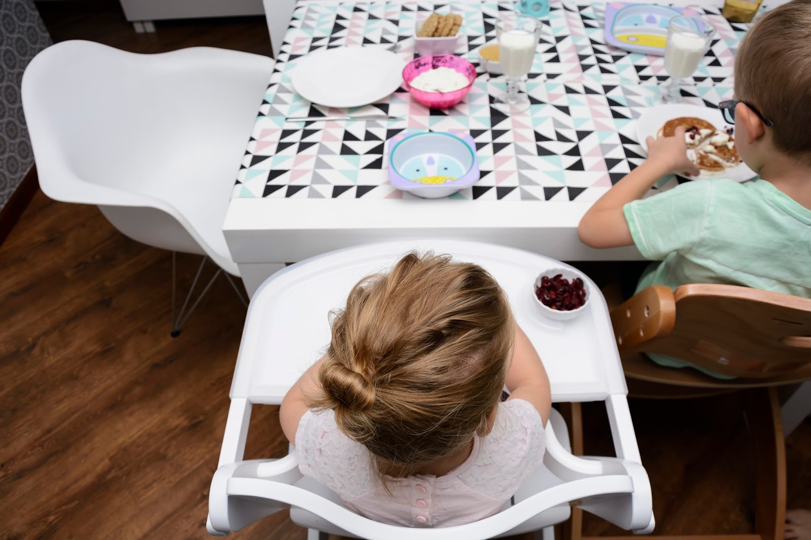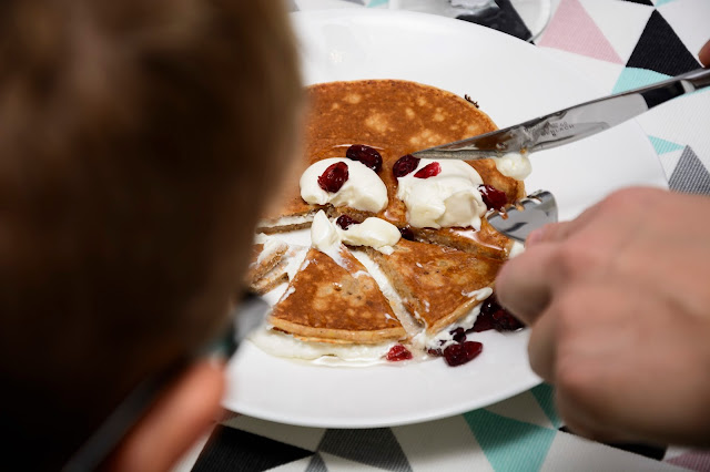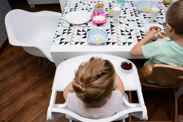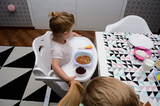 Weekend więc, to zdecydowanie ten czas kiedy na śniadanie mamy więcej niż pół godziny a ja mogę przygotować naleśniki lub wypasioną jajecznicę, zastępując zwykłe kanapki czy owsiankę kolorowo zastawionym stołem. To ten czas, kiedy już wszyscy zasiadamy wspólnie do śniadania, a nie jak do tej pory każdy w swoim kącie. Dzieci mają krzesełka dopasowane wysokością do dużego stołu i jest im teraz dużo wygodniej. Dlaczego ja na to wcześniej nie wpadłam i marząc o wspólnym posiłku wkładałam małą do oddzielnego fotelika do karmienia w kącie, a młodego na dorosłe krzesło, na którym siedział jak przekrzywiony z nogą pod brodą? Dziwiłam się, że krzywo siedzi, że się bawi i nie skupia na jedzeniu, teraz siedzi prosto, nogi ma oparte, jest mu wygodnie i dostaje na stole do wszystkiego czego zapragnie.