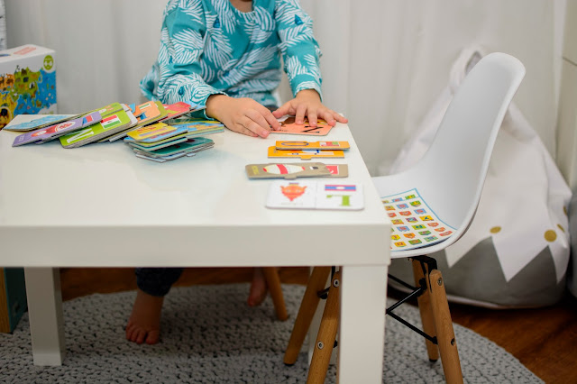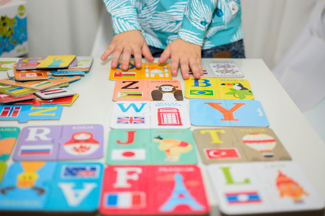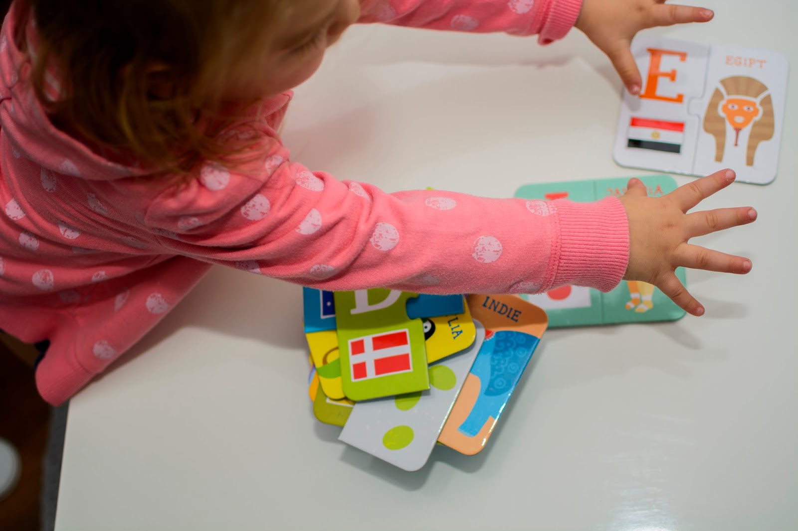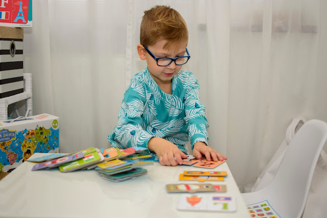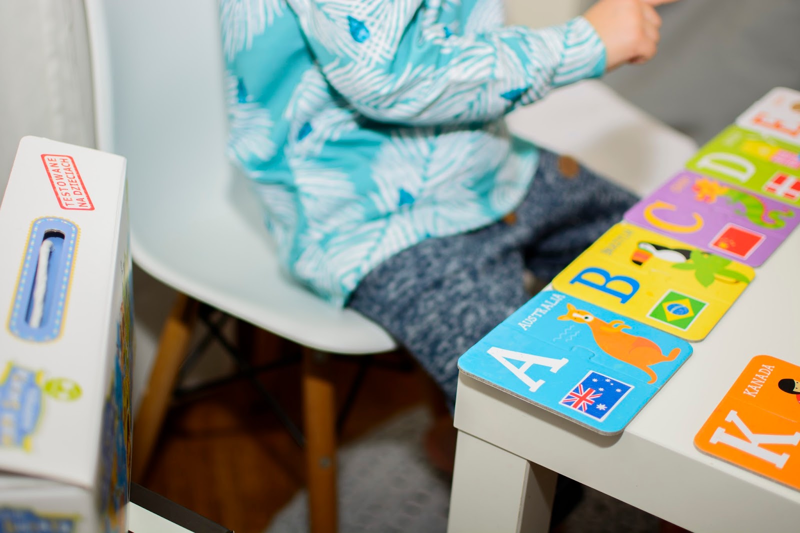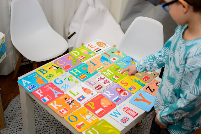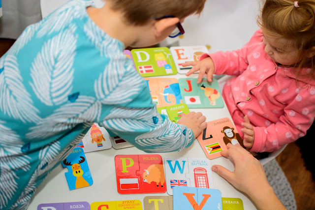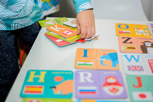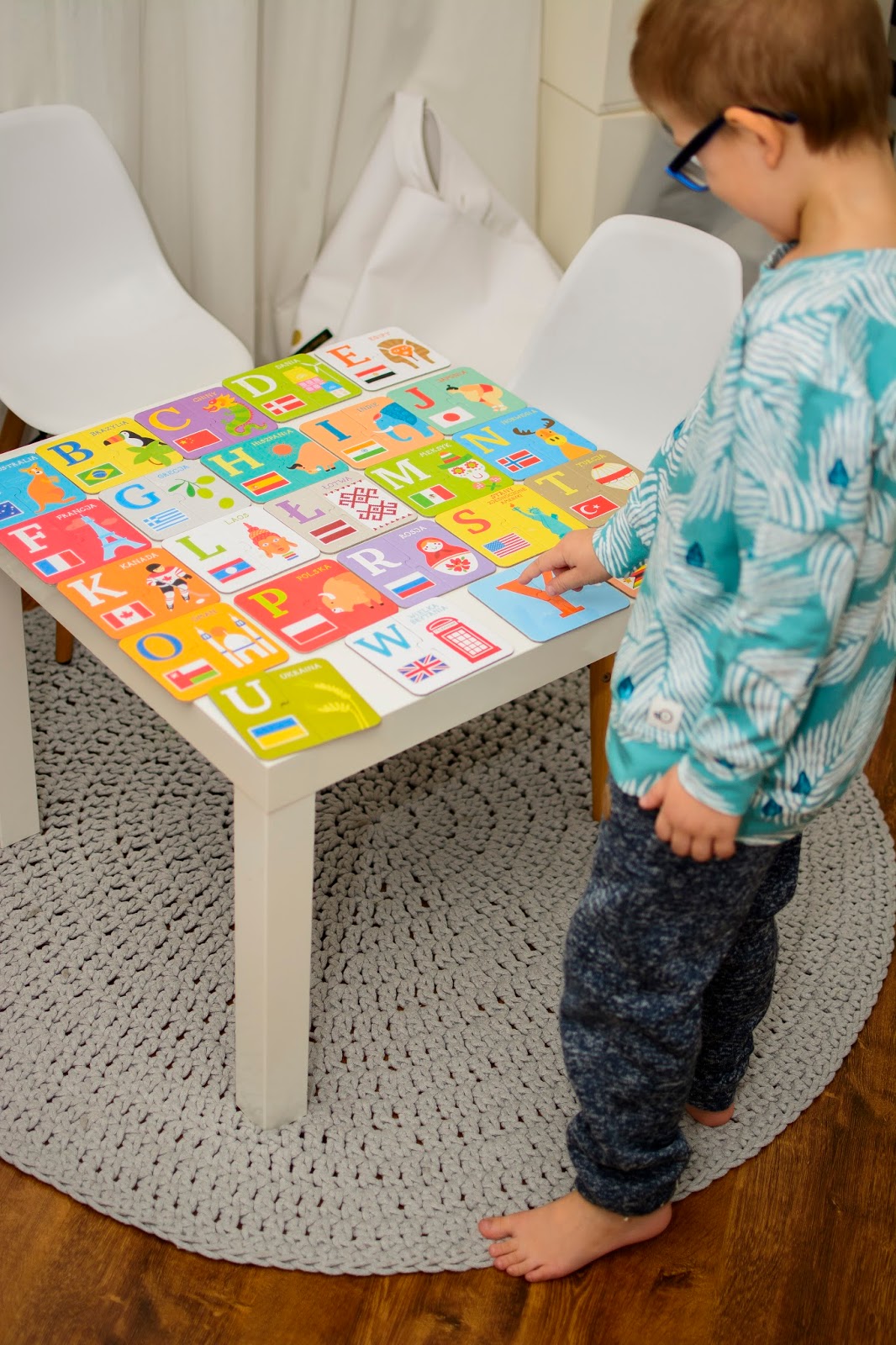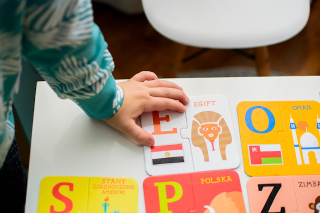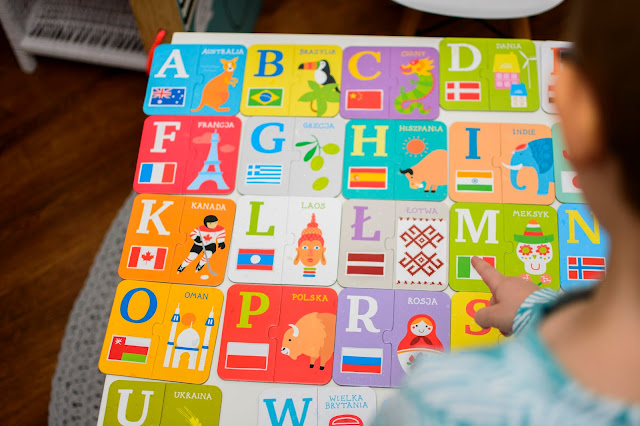 Ten od CzuCzu jest w wersji wspaniale przygotowującej do pierwszych lekcji geografii. Kiedy dziecko zaczyna kojarzyć literki szuka wszelkich sposobów aby tę umiejętność wykorzystać i się nią pochwalić. Licząc na uznanie Tomik złapał puzzle i z zapałem dopasowywał literki z nazwami państw, które tak zawzięcie próbował odczytywać. Okazało się również jak wielką frajdą jest dla niego ułożenie wszystkich liter z flagami w odpowiedniej kolejności alfabetycznej. Zadanie zajmujące i ze świetnym finałem – alfabet można przeczytać kilkanaście razy, zwracając uwagę kolejno na inne państwa, flagi czy obrazujące symbole. Po drodze milion pytań, na które dobrze byłoby znać odpowiedzi, dziecięca ciekawości nie znosi słowa „nie wiem” a nasz autorytet w oczach dziecka wymaga w sytuacji kryzysowej chociażby dokończenia „nie wiem, ale chętnie sobie przypomnę” i tu zaczyna się kolejny etap tzw. wujek google.