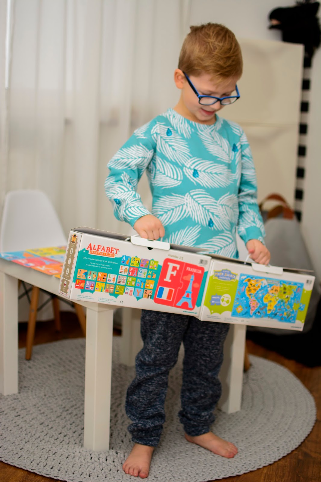 Rozwijająca funkcja puzzli, która poza możliwością ćwiczenia alfabetu przynosi wiele korzyści. W ten sposób można zainteresować zabawą również młodsze dzieci – np. dwuletnią Natkę, która z literek na chwilę obecna powtórzy po starszym bracie kilka pierwszych z alfabetu, ale kolory dobrać już da radę. Wielkość puzzli jest też idealna do jej małych rączek, wygodnie się je układa i rozkłada i układa i rozkłada i tak w kółko – jak na dwulatka przystało. Wygodna walizeczka, w której puzzle przechowujemy jest też pomocna przy jej zamiłowaniu do chowania wszystkiego na swoje miejsce.