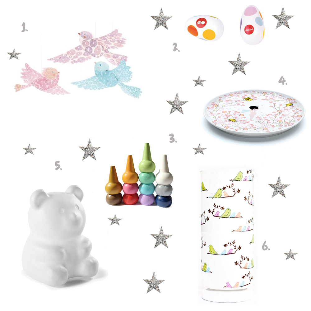 1. Brokatowe ptaszki do składania Djeco – śliczna ozdoba do pokoju, świetna zabawa, w której może uczestniczyć mama z córką, świetna dekoracja imprezy.