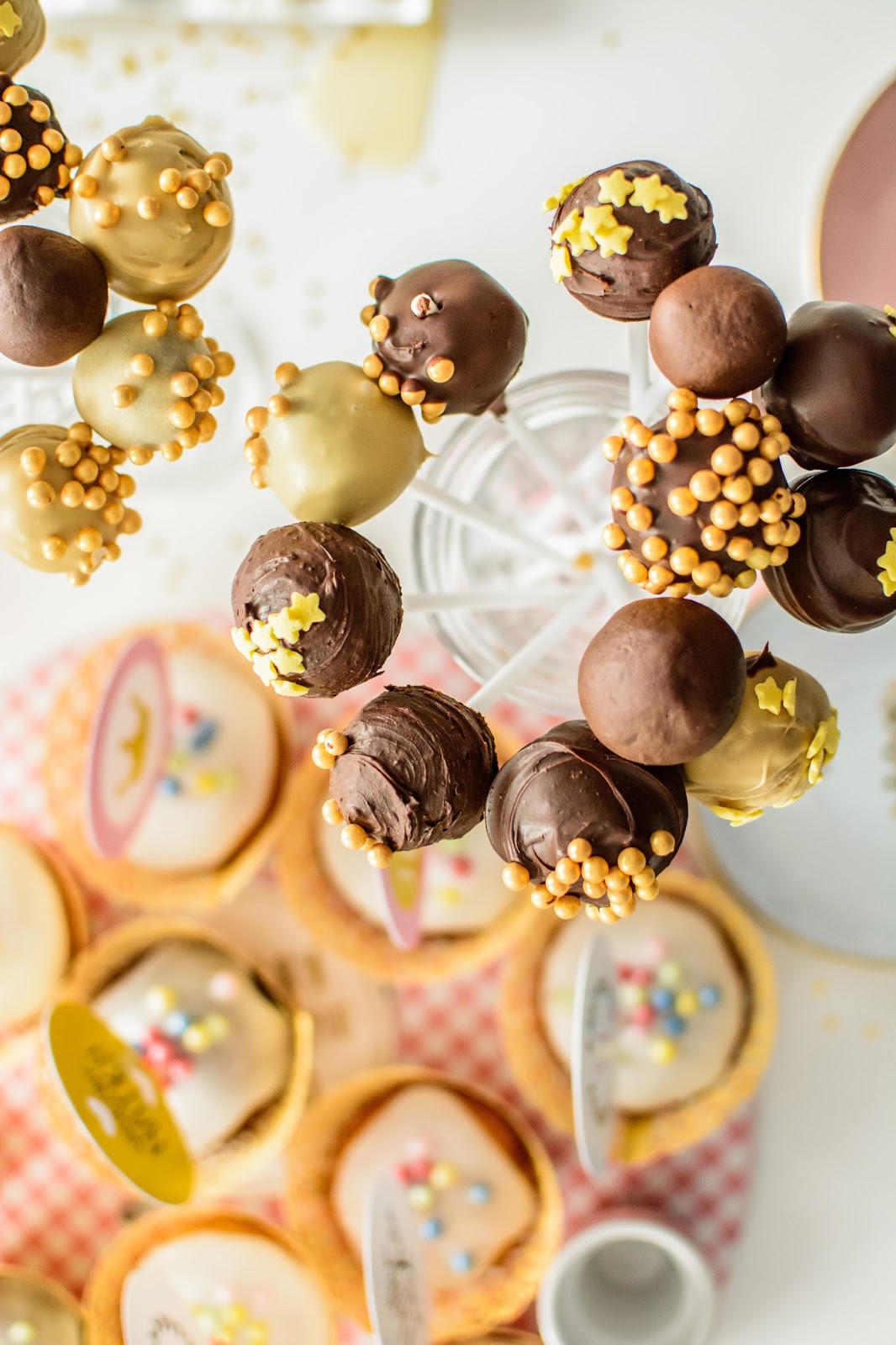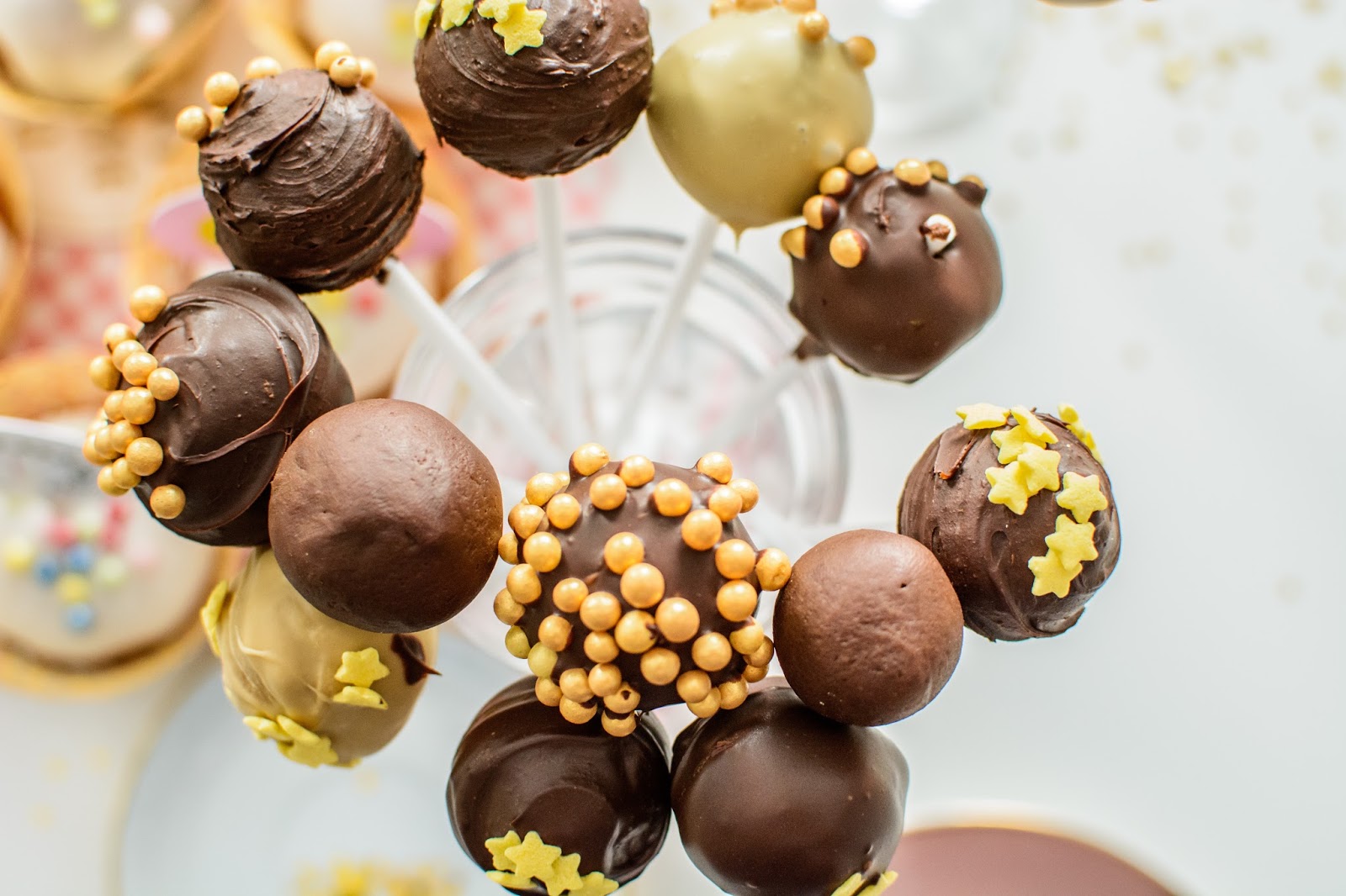 Teraz ważne: Zanim wyjmiesz kulki z zamrażarki przygotuj rozpuszczoną w kąpieli wodnej czekoladę, białą i gorzką po 2 tabliczki i przygotuj patyczki i miejsce do wkładania gotowych ciasteczek. Wystudź czekoladę, wyjmij kulki. Nabijaj po jednej na patyczek i mocz w czekoladzie, możesz od razu moczyć w ozdobnych perełkach lub posypce według uznania. Zanim podasz na stół przechowuj w lodówce, inaczej jest ryzyko, że spłyną z patyczka.