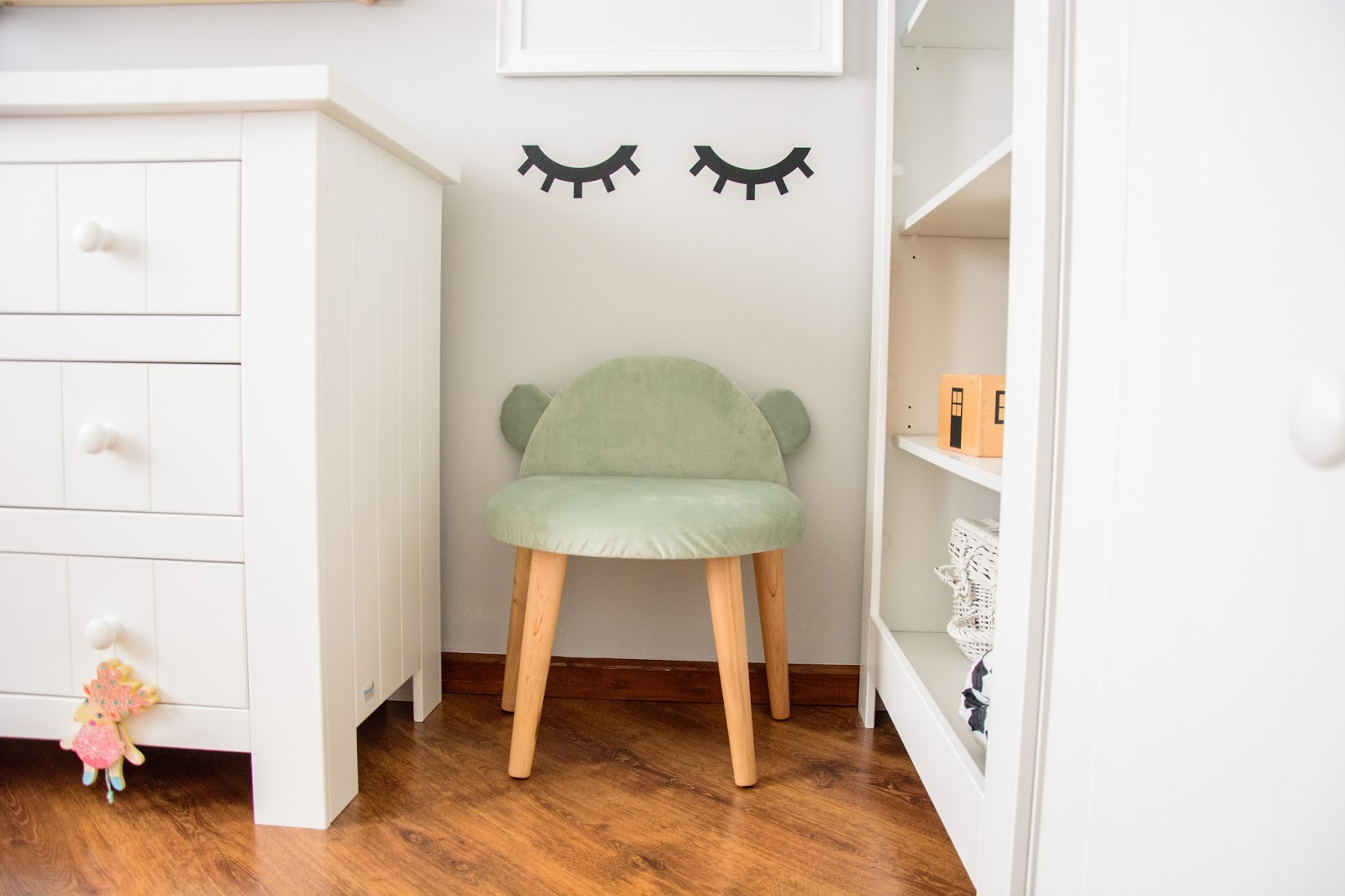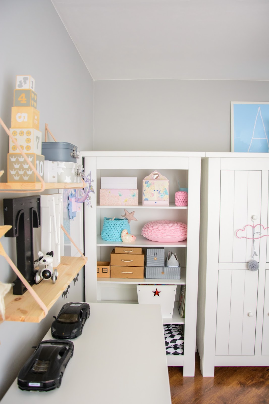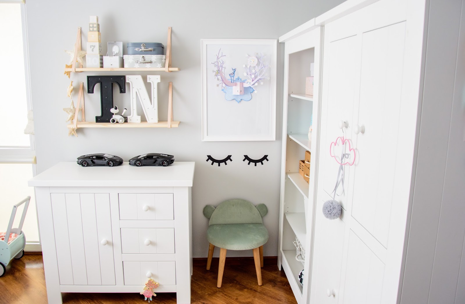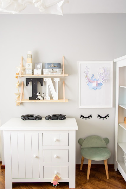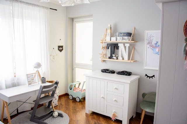 Na przeciwnej ścianie nad komodą stworzyliśmy własnoręcznie super półki z drewna i skóry. Traf chciał, że wzięłam sobie za męża Pana Złotą Rączkę, który wszystko naprawi (łącznie z pralką i zmywarką) wymieni żarówkę, gniazdko i żyrandol, pomaluje ściany i skręci meble. Nie! no pewnie, że nie sam! Co on by beze mnie zrobił? Ja wymyślam, on realizuje (z zapałem 😉 Taka półka więc to dla nas pikuś. Na półce goszczą dodatki w naturalnych kolorach i lampki literki. Obok w wielkiej białej ramie miał zagościć kolorowy plakat, nie dotarł jednak na czas, jego miejsce więc zajęła papierowa składanka Djeco, nareszcie doczekała się swojego miejsca! Pod plakatem nad misiowym krzesełkiem mrugają naklejki oczka od dziewczyn z Blacksis. Krzesełko służy nam jako dodatkowe do biurka w momentach kiedy młoda jednak nie opuszcza brata na krok i chce nadal robić dokładnie to co on. Jest dość ciężkie i super stabilne więc utrzymuje jej zwiercone nóżki i tyłeczek skutecznie broniąc przed upadkiem