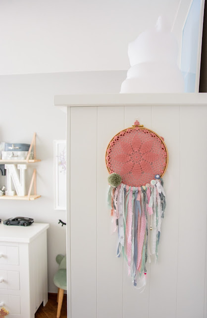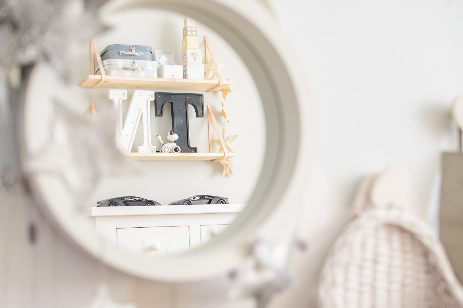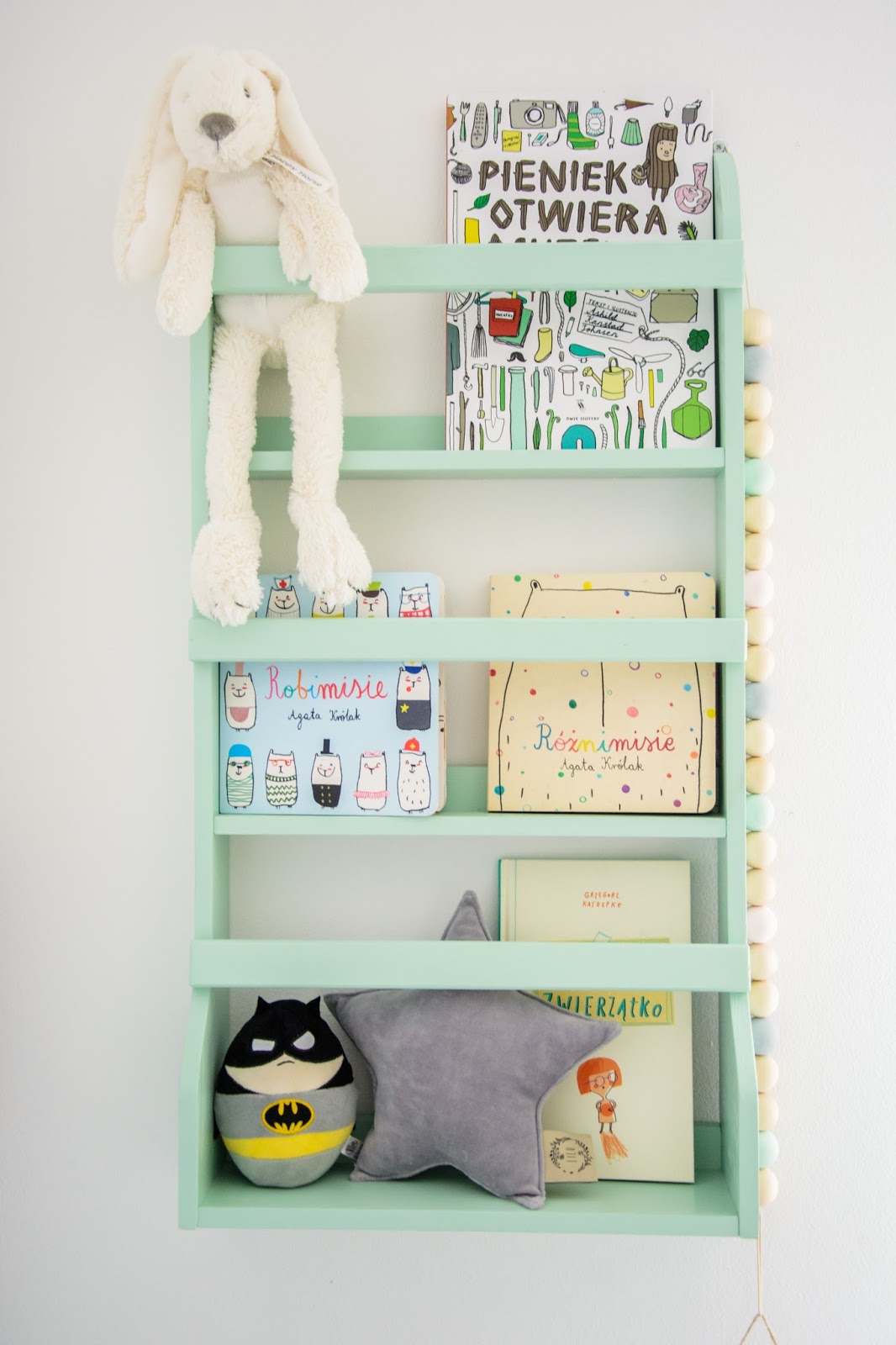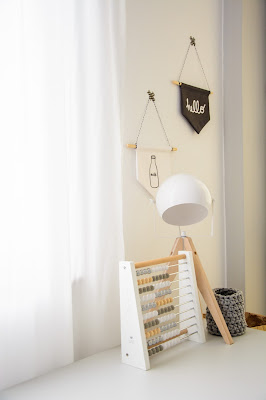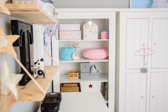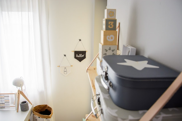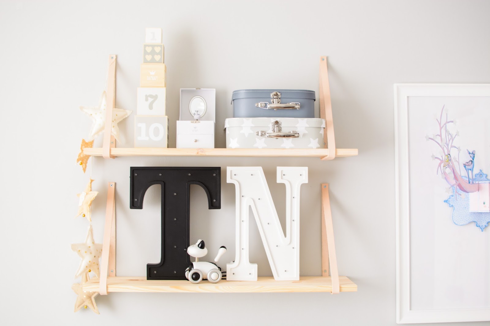 Na przeciwnej ścianie nad komodą stworzyliśmy własnoręcznie super półki z drewna i skóry. Traf chciał, że wzięłam sobie za męża Pana Złotą Rączkę, który wszystko naprawi (łącznie z pralką i zmywarką) wymieni żarówkę, gniazdko i żyrandol, pomaluje ściany i skręci meble. Nie! no pewnie, że nie sam! Co on by beze mnie zrobił? Ja wymyślam, on realizuje (z zapałem 😉 Taka półka więc to dla nas pikuś. Na półce goszczą dodatki w naturalnych kolorach i lampki literki. Obok w wielkiej białej ramie miał zagościć kolorowy plakat, nie dotarł jednak na czas, jego miejsce więc zajęła papierowa składanka Djeco, nareszcie doczekała się swojego miejsca! Pod plakatem nad misiowym krzesełkiem mrugają naklejki oczka od dziewczyn z Blacksis. Krzesełko służy nam jako dodatkowe do biurka w momentach kiedy młoda jednak nie opuszcza brata na krok i chce nadal robić dokładnie to co on. Jest dość ciężkie i super stabilne więc utrzymuje jej zwiercone nóżki i tyłeczek skutecznie broniąc przed upadkiem
