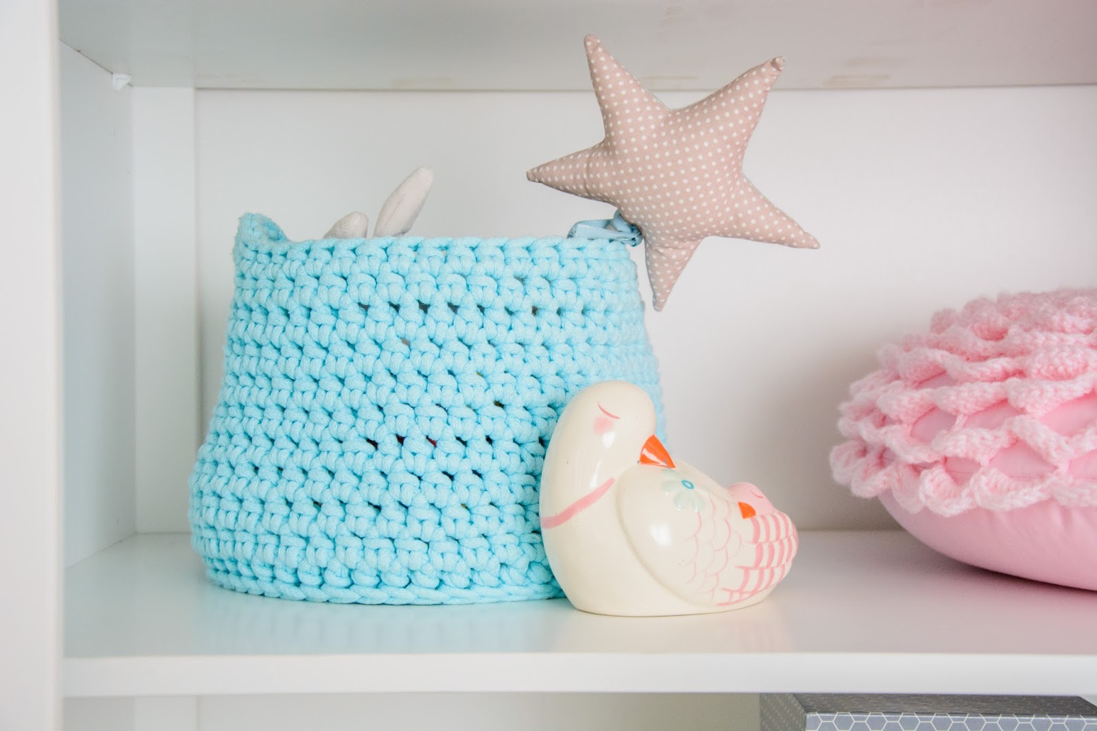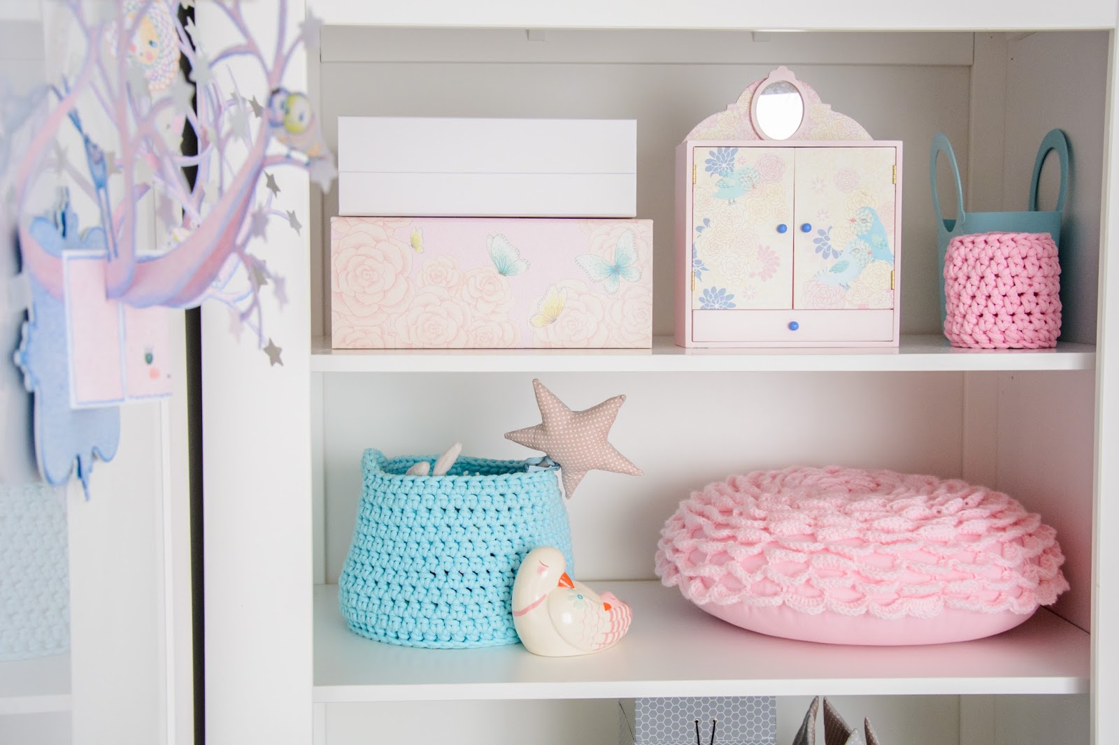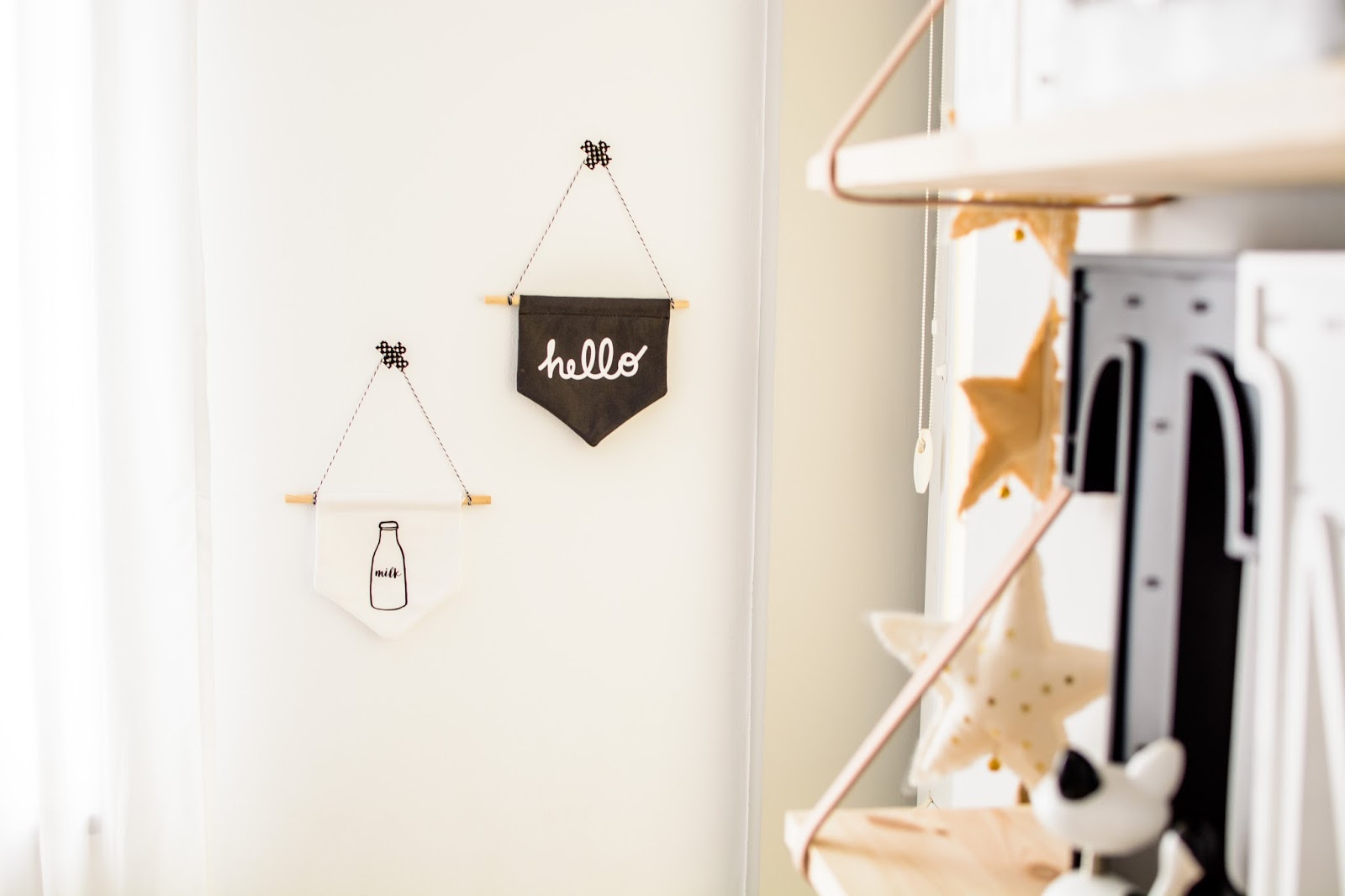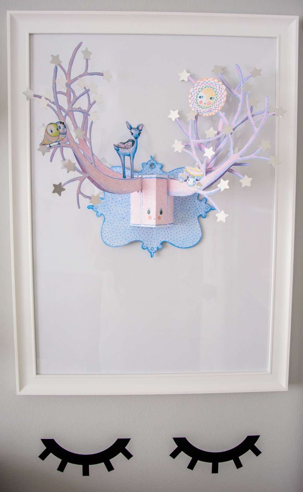 Na przeciwnej ścianie nad komodą stworzyliśmy własnoręcznie super półki z drewna i skóry. Traf chciał, że wzięłam sobie za męża Pana Złotą Rączkę, który wszystko naprawi (łącznie z pralką i zmywarką) wymieni żarówkę, gniazdko i żyrandol, pomaluje ściany i skręci meble. Nie! no pewnie, że nie sam! Co on by beze mnie zrobił? Ja wymyślam, on realizuje (z zapałem 😉 Taka półka więc to dla nas pikuś. Na półce goszczą dodatki w naturalnych kolorach i lampki literki. Obok w wielkiej białej ramie miał zagościć kolorowy plakat, nie dotarł jednak na czas, jego miejsce więc zajęła papierowa składanka Djeco, nareszcie doczekała się swojego miejsca! Pod plakatem nad misiowym krzesełkiem mrugają naklejki oczka od dziewczyn z Blacksis. Krzesełko służy nam jako dodatkowe do biurka w momentach kiedy młoda jednak nie opuszcza brata na krok i chce nadal robić dokładnie to co on. Jest dość ciężkie i super stabilne więc utrzymuje jej zwiercone nóżki i tyłeczek skutecznie broniąc przed upadkiem