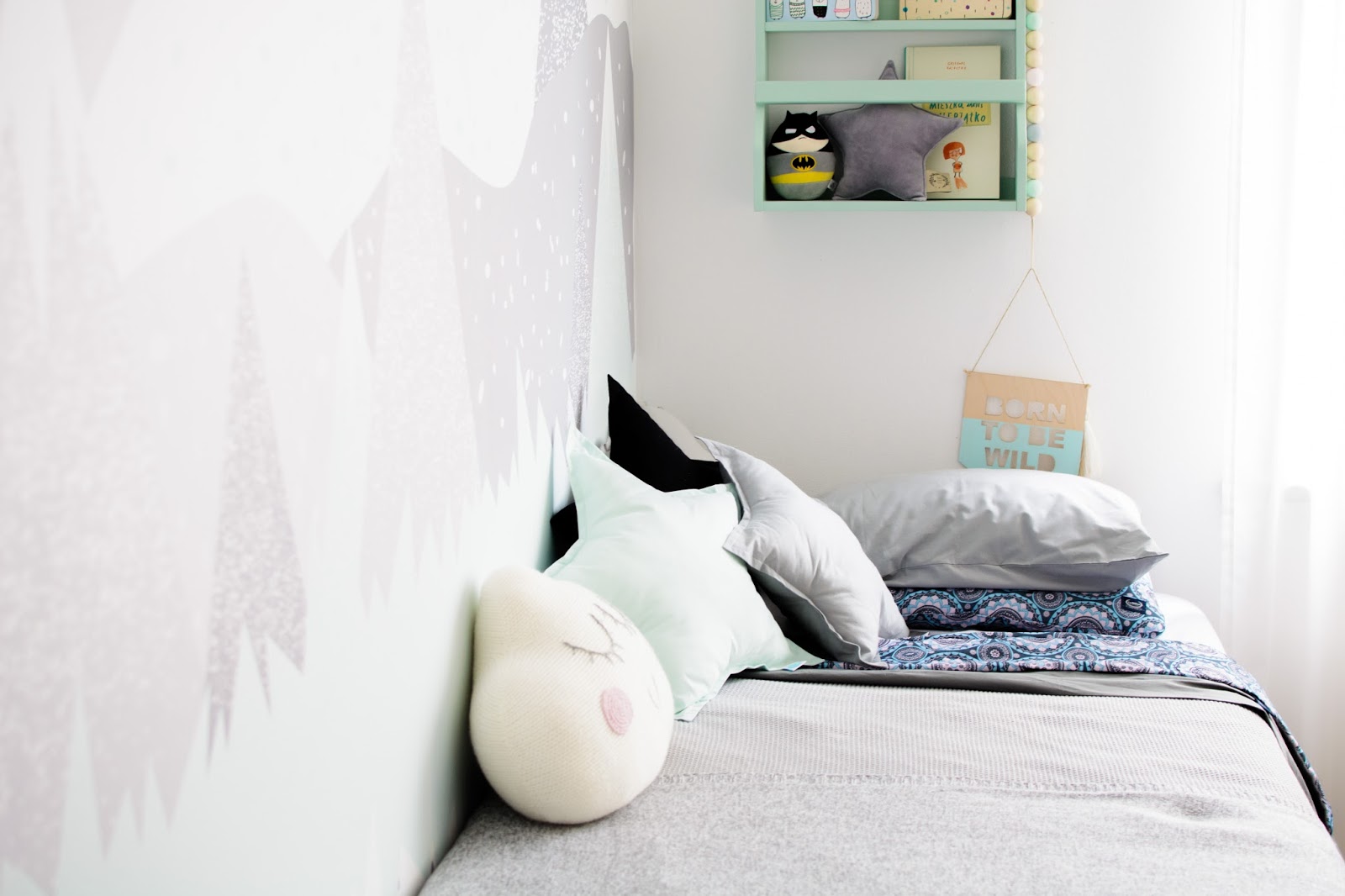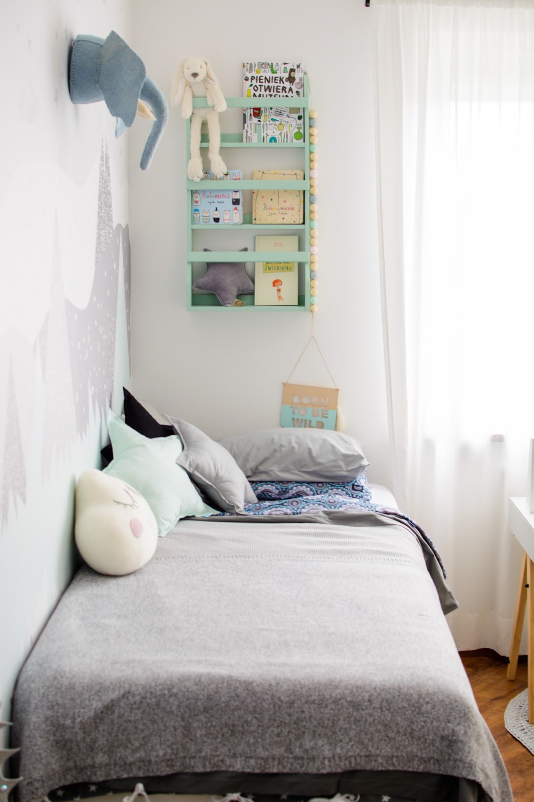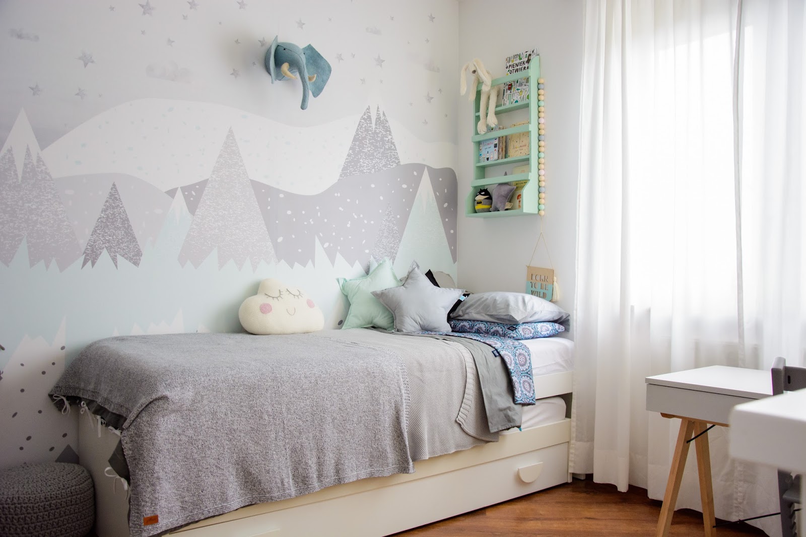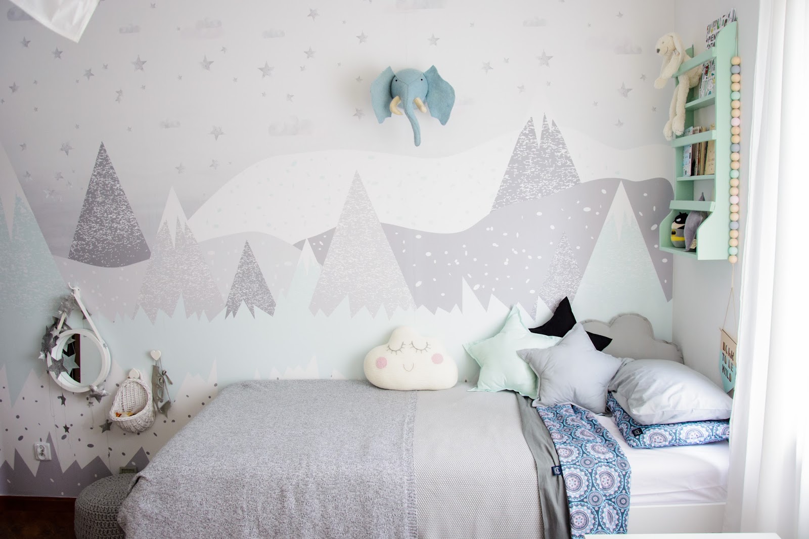 Ale najpierw zmieniły się ściany. Starą tapetę (TĘ) zerwaliśmy ze ściany niczym wielką wielorazową naklejkę. Pokazywałam ten wyczyn na Snapchacie i Instagramie. Projektem tapety zajęła się mistrzyni z Eclectic Living, to ona nadaje przestrzeni wyjątkowego charakteru. Szarą pościel pasującą odcieniem znalazłam u Dots my love. Miętę ze ściany powieliłam na drewnianej półeczce na książki i poduszeczkach na łóżku. Świeżość i chłód szarości z miętą przełamałam gdzieniegdzie niebieskimi akcentami, słoniem na ścianie czy pościelą w graficzne wzory. Znalazło się nawet miejsce dla małej damy z magicznym lusterkiem i koszyczkiem na drobiazgi. Siada sobie taka mała paniusia dwuletnia na zmotanej miękkiej pufce i stroi się zapinając jedną spinkę na drugą, komedia!