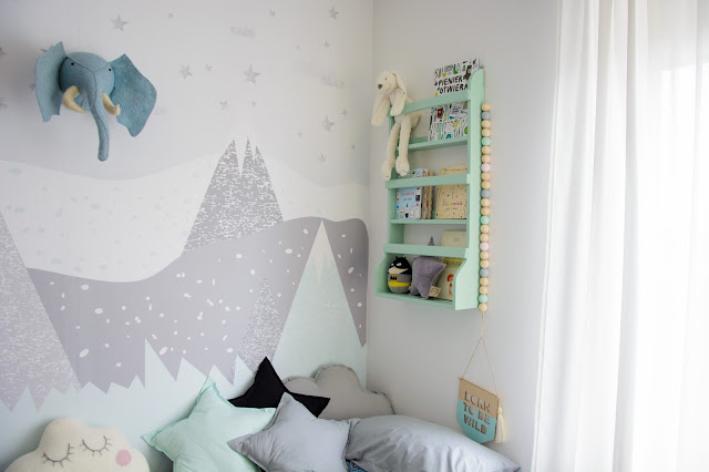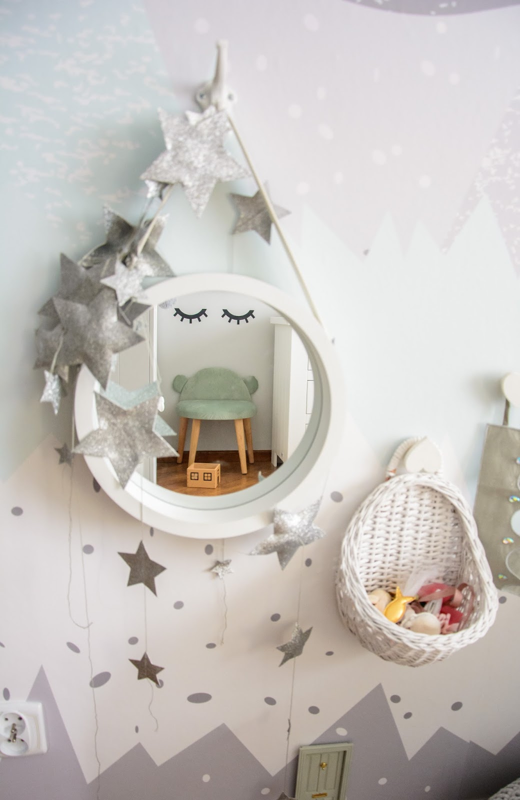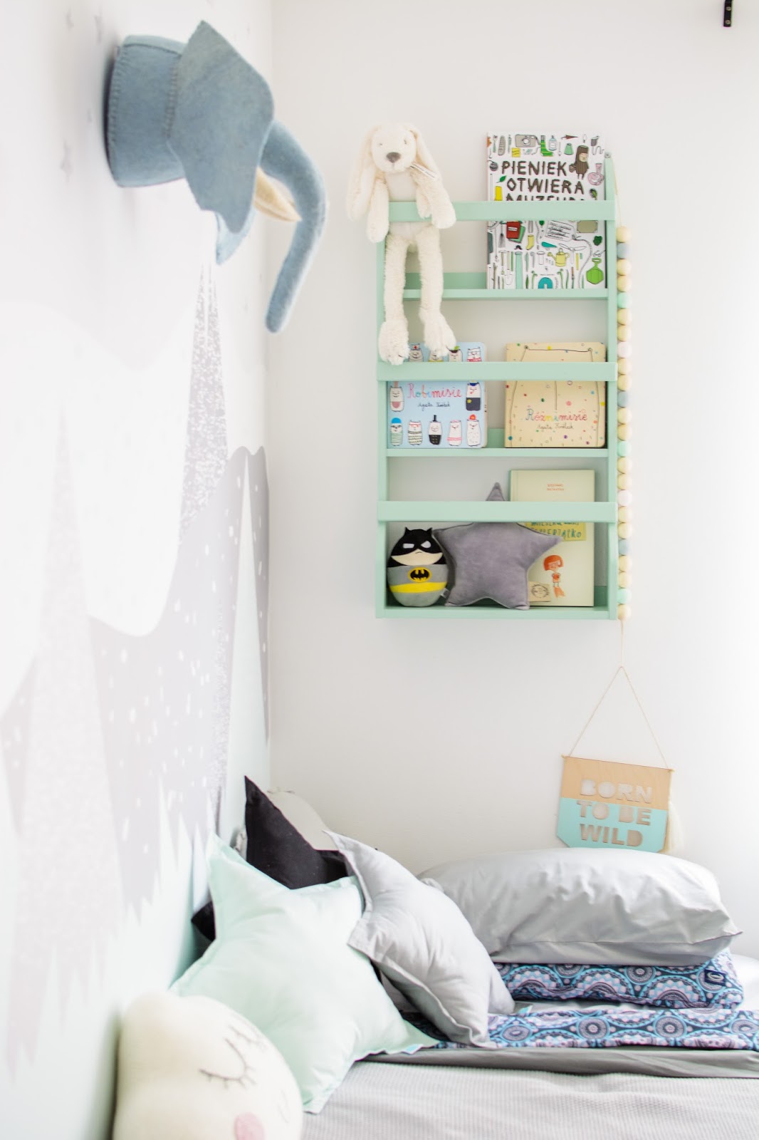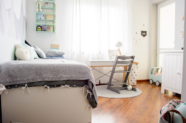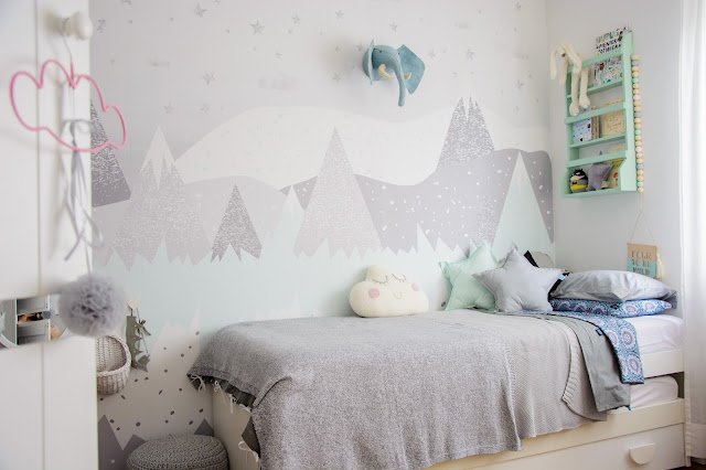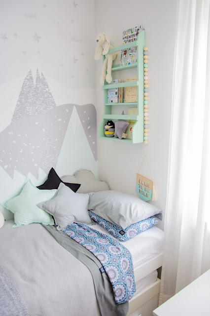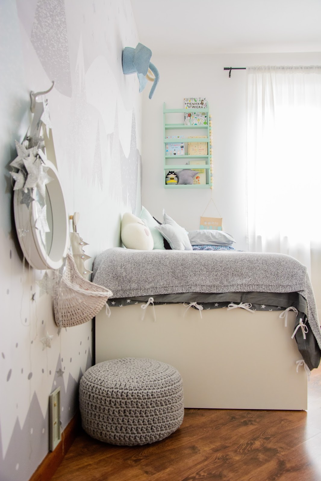 Ale najpierw zmieniły się ściany. Starą tapetę (TĘ) zerwaliśmy ze ściany niczym wielką wielorazową naklejkę. Pokazywałam ten wyczyn na Snapchacie i Instagramie. Projektem tapety zajęła się mistrzyni z Eclectic Living, to ona nadaje przestrzeni wyjątkowego charakteru. Szarą pościel pasującą odcieniem znalazłam u Dots my love. Miętę ze ściany powieliłam na drewnianej półeczce na książki i poduszeczkach na łóżku. Świeżość i chłód szarości z miętą przełamałam gdzieniegdzie niebieskimi akcentami, słoniem na ścianie czy pościelą w graficzne wzory. Znalazło się nawet miejsce dla małej damy z magicznym lusterkiem i koszyczkiem na drobiazgi. Siada sobie taka mała paniusia dwuletnia na zmotanej miękkiej pufce i stroi się zapinając jedną spinkę na drugą, komedia!