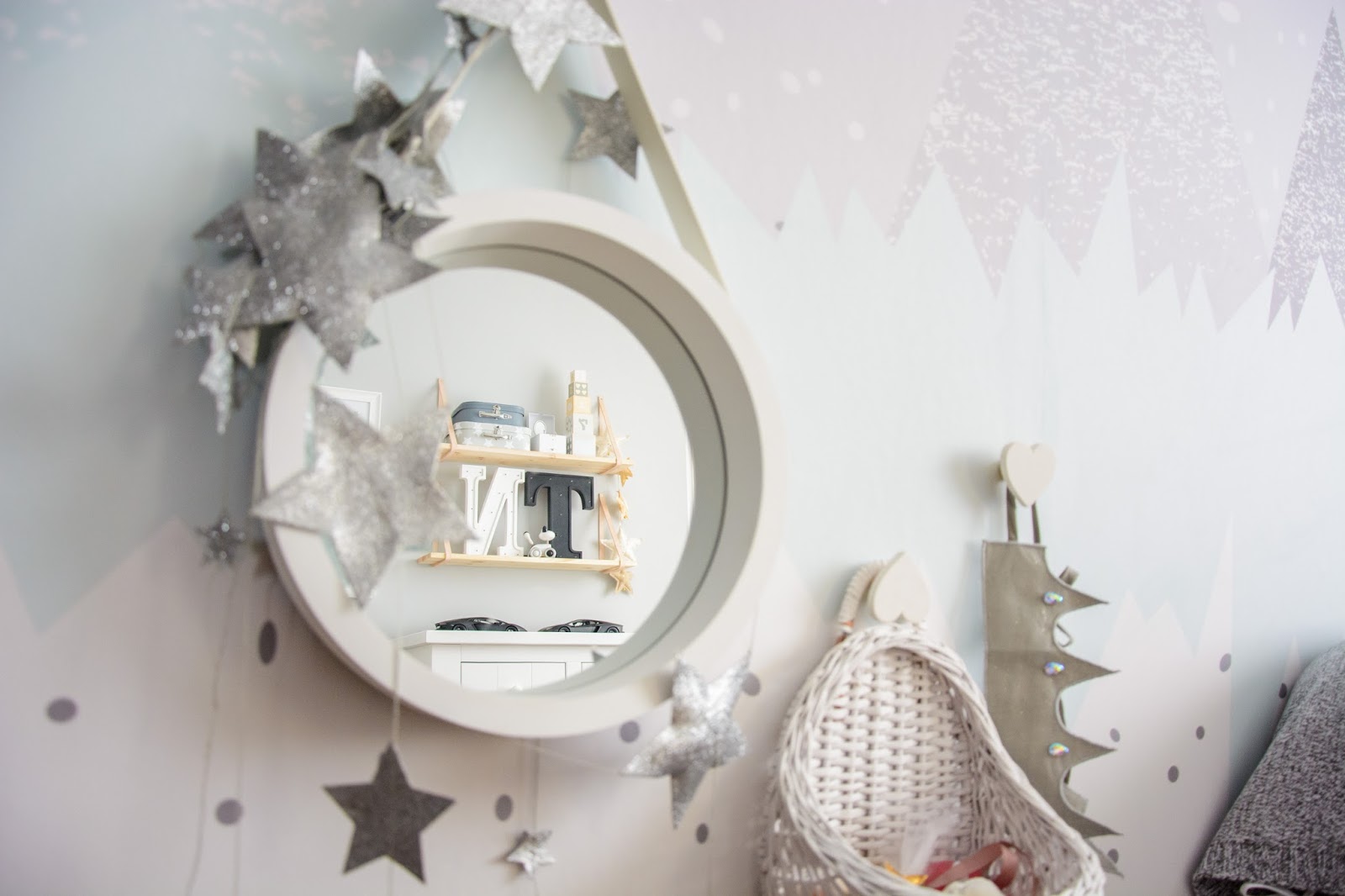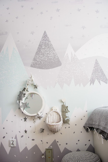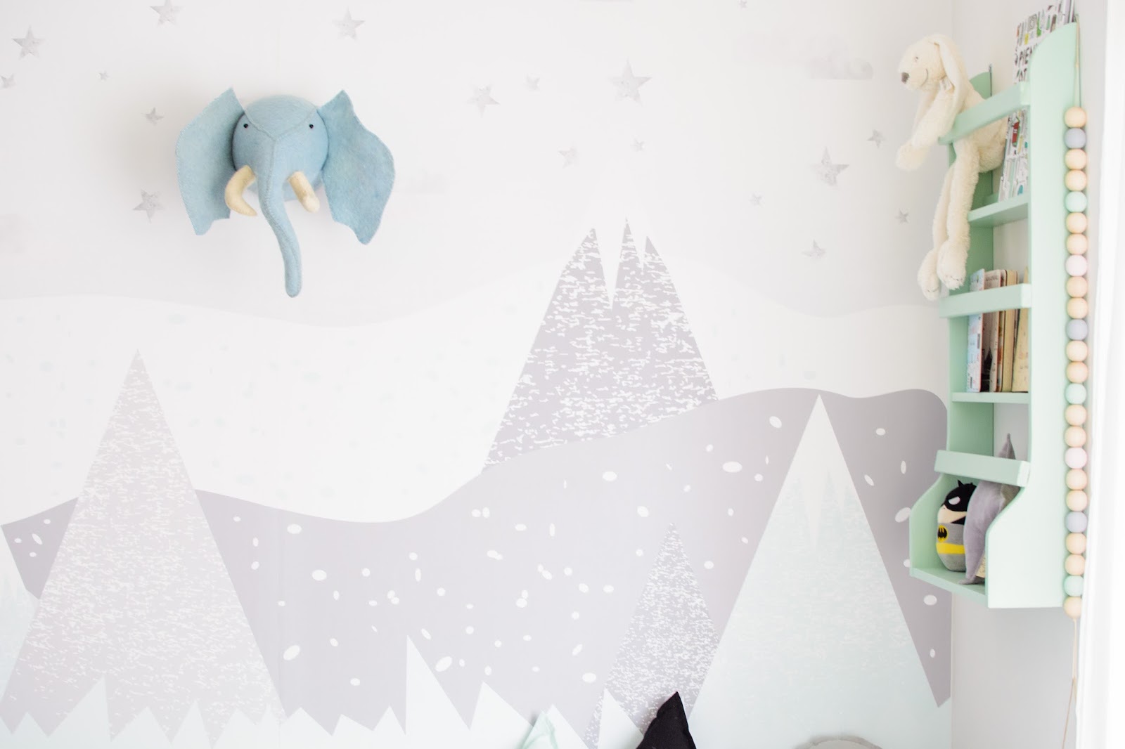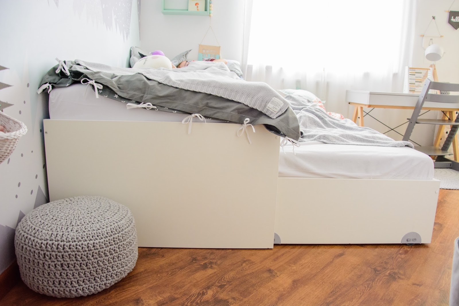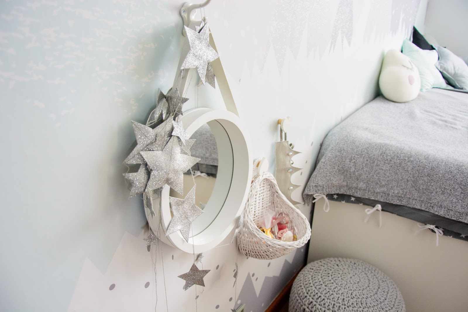 Ale najpierw zmieniły się ściany. Starą tapetę (TĘ) zerwaliśmy ze ściany niczym wielką wielorazową naklejkę. Pokazywałam ten wyczyn na Snapchacie i Instagramie. Projektem tapety zajęła się mistrzyni z Eclectic Living, to ona nadaje przestrzeni wyjątkowego charakteru. Szarą pościel pasującą odcieniem znalazłam u Dots my love. Miętę ze ściany powieliłam na drewnianej półeczce na książki i poduszeczkach na łóżku. Świeżość i chłód szarości z miętą przełamałam gdzieniegdzie niebieskimi akcentami, słoniem na ścianie czy pościelą w graficzne wzory. Znalazło się nawet miejsce dla małej damy z magicznym lusterkiem i koszyczkiem na drobiazgi. Siada sobie taka mała paniusia dwuletnia na zmotanej miękkiej pufce i stroi się zapinając jedną spinkę na drugą, komedia!