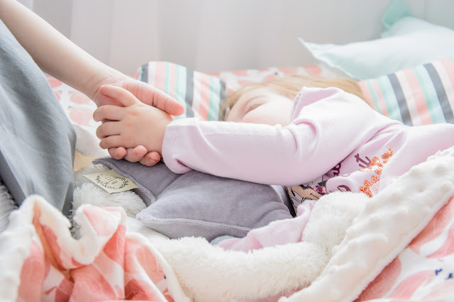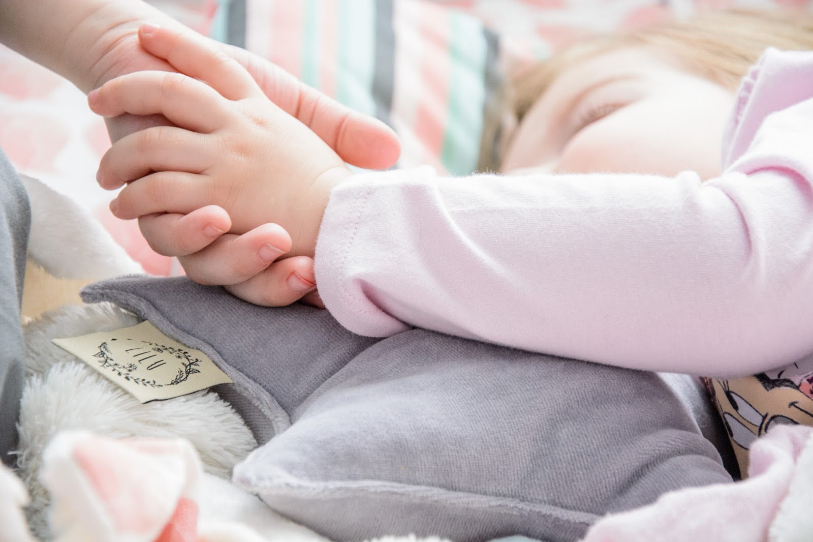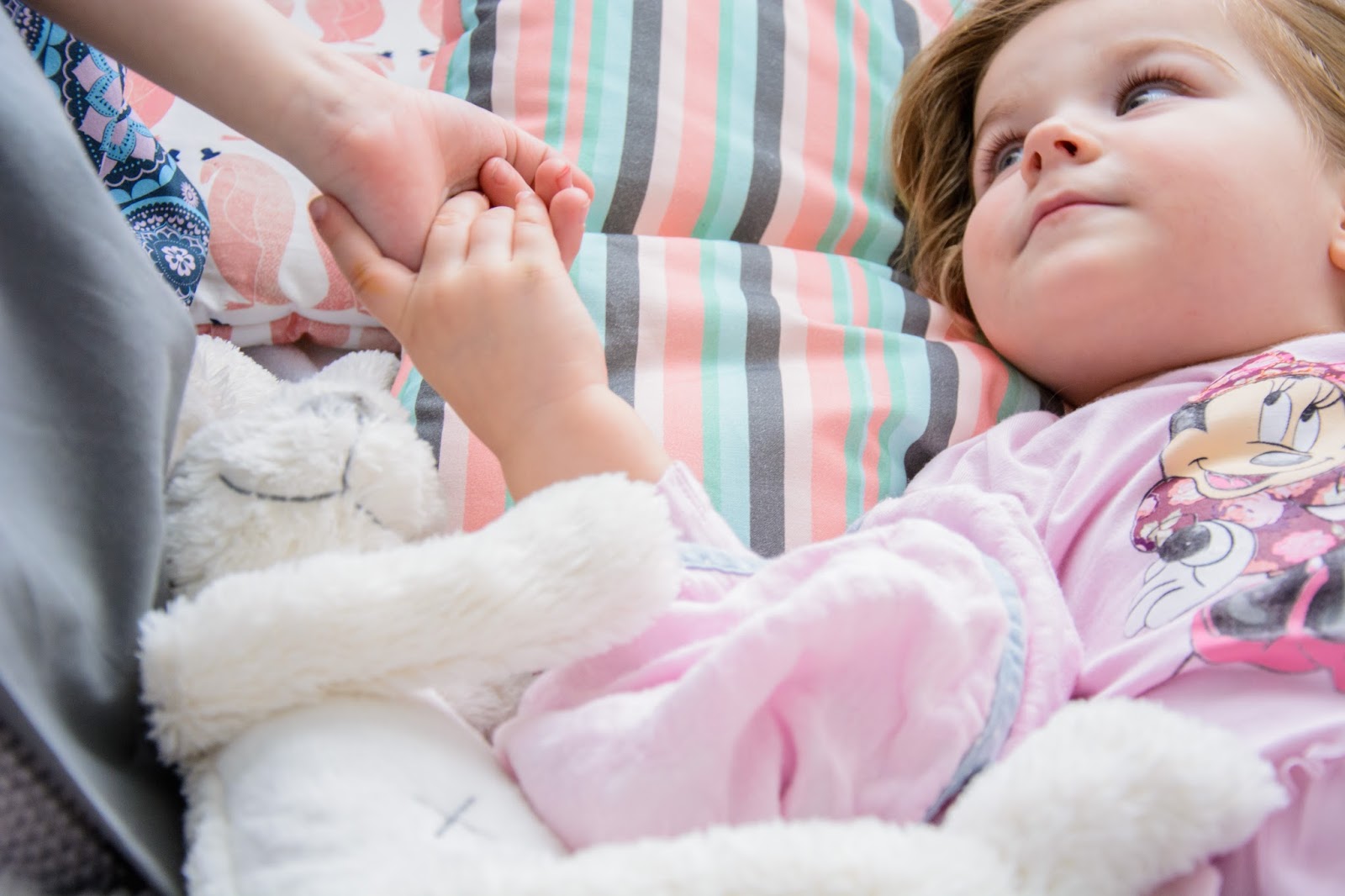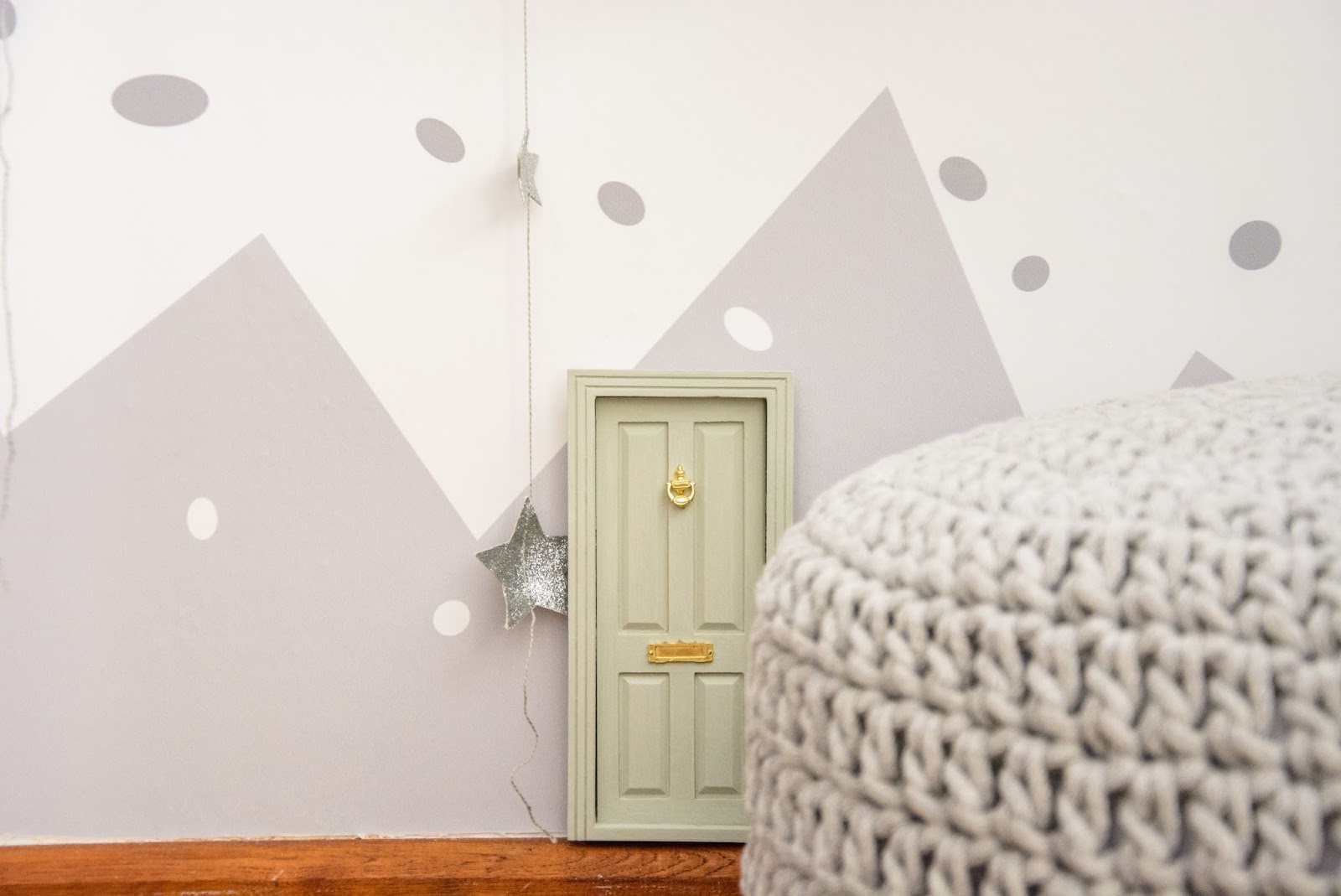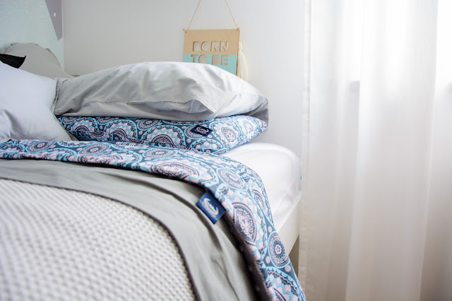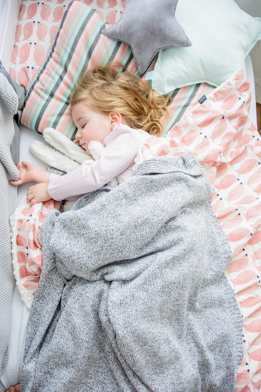 Ale najpierw zmieniły się ściany. Starą tapetę (TĘ) zerwaliśmy ze ściany niczym wielką wielorazową naklejkę. Pokazywałam ten wyczyn na Snapchacie i Instagramie. Projektem tapety zajęła się mistrzyni z Eclectic Living, to ona nadaje przestrzeni wyjątkowego charakteru. Szarą pościel pasującą odcieniem znalazłam u Dots my love. Miętę ze ściany powieliłam na drewnianej półeczce na książki i poduszeczkach na łóżku. Świeżość i chłód szarości z miętą przełamałam gdzieniegdzie niebieskimi akcentami, słoniem na ścianie czy pościelą w graficzne wzory. Znalazło się nawet miejsce dla małej damy z magicznym lusterkiem i koszyczkiem na drobiazgi. Siada sobie taka mała paniusia dwuletnia na zmotanej miękkiej pufce i stroi się zapinając jedną spinkę na drugą, komedia!
