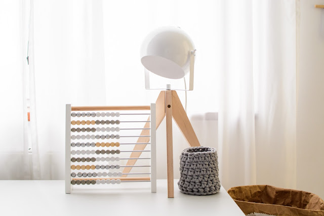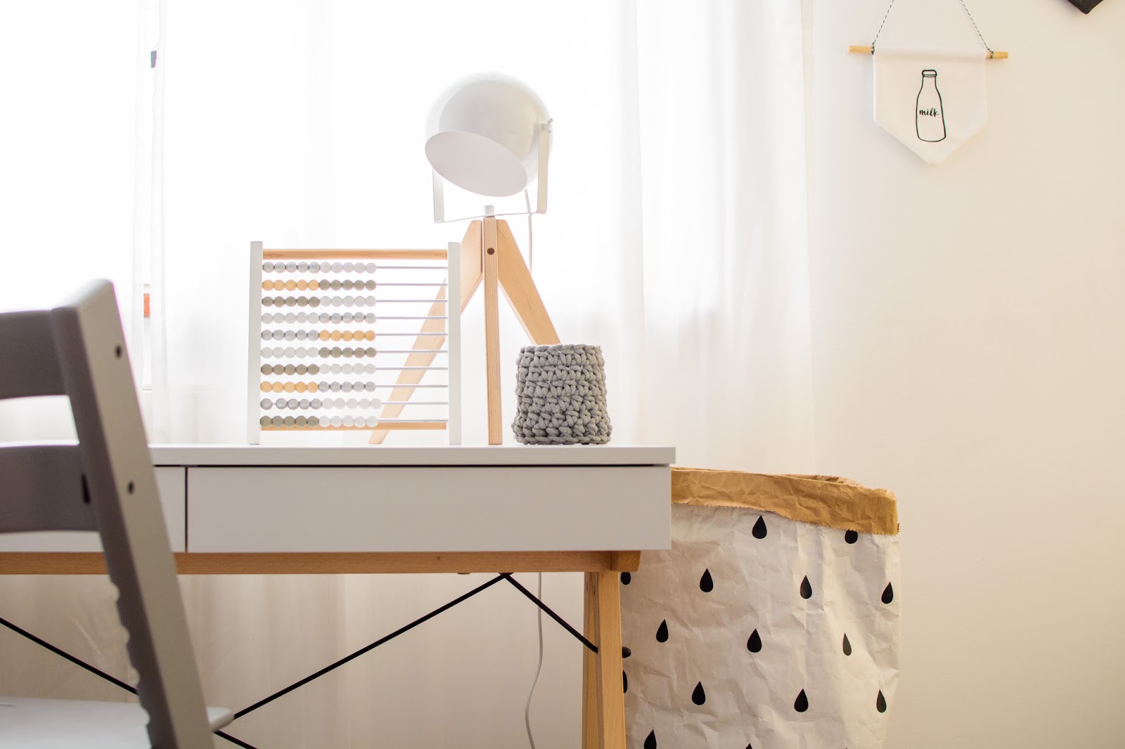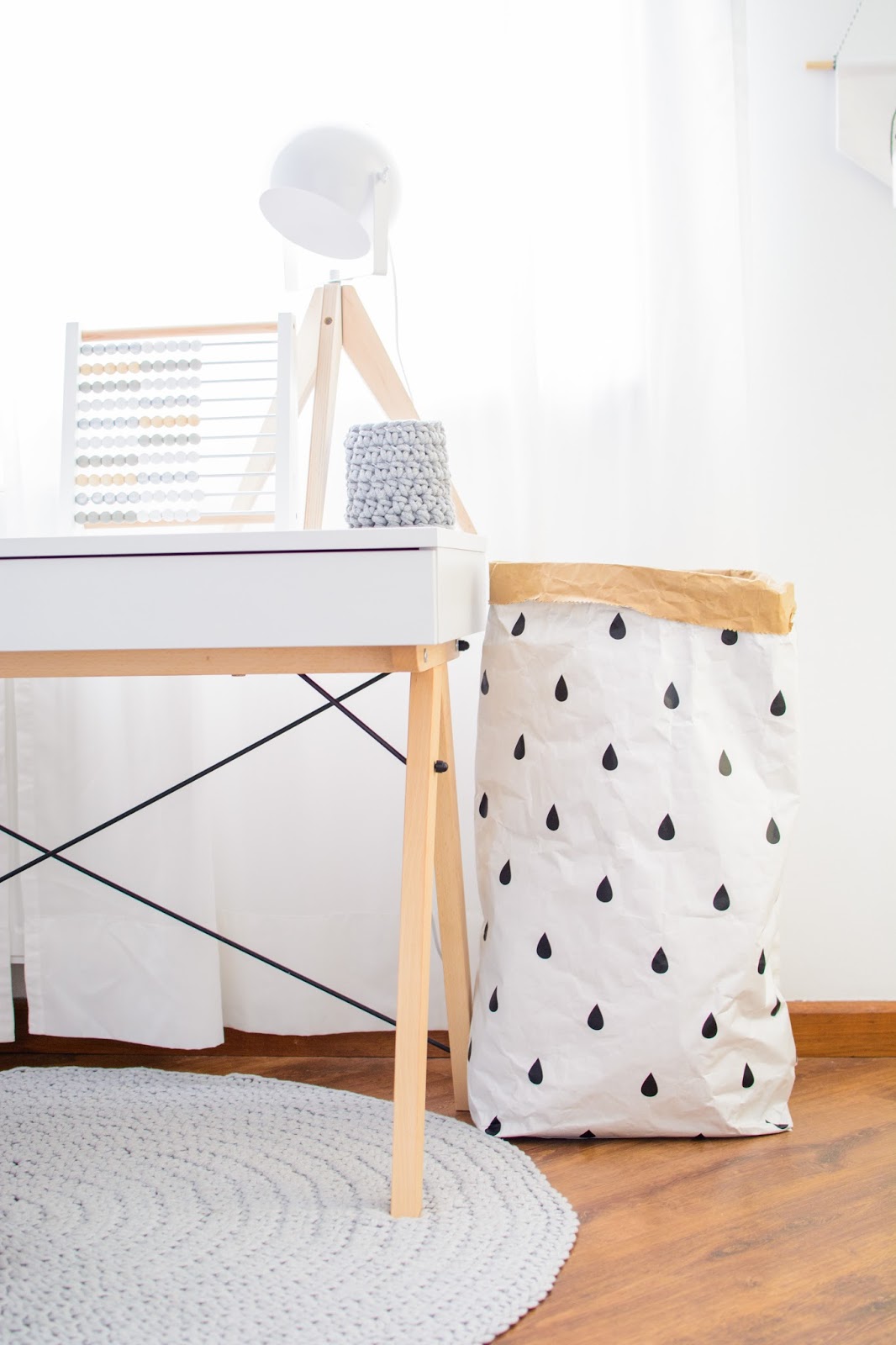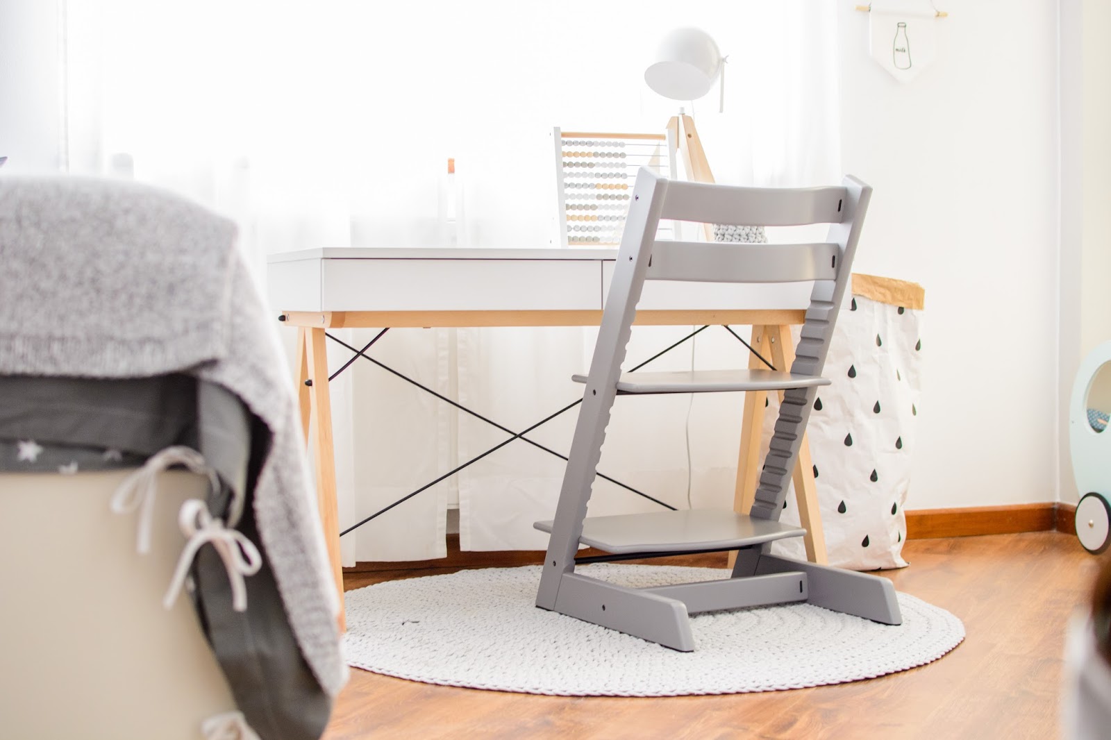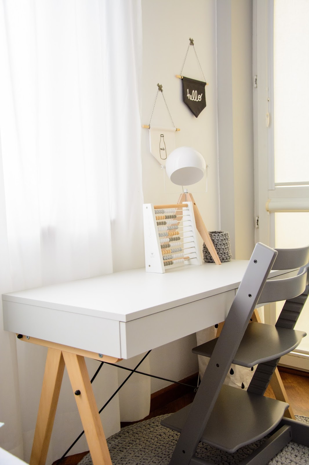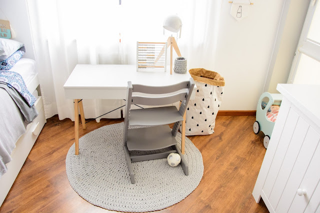 Głównym punktem zapalnym do zmian była potrzeba dorastającego chłopca, potrzeba oddzielnego biurka dokładnie. Wydzielenie przestrzeni do pracy i nauki, osobistej rzecz jasna. Do tej pory praktykowaliśmy wspólne zabawy przy stole tak jak TU i TU i TU. To jednak już nie zawsze wystarcza. Burko w wersji Kids idealnie na chwilę obecną pasuje do krzesełka Tripp Trapp. Miękki dywanik pod nogami i delikatny akcent naturalnego drewna w lampce i kącik gotowy.