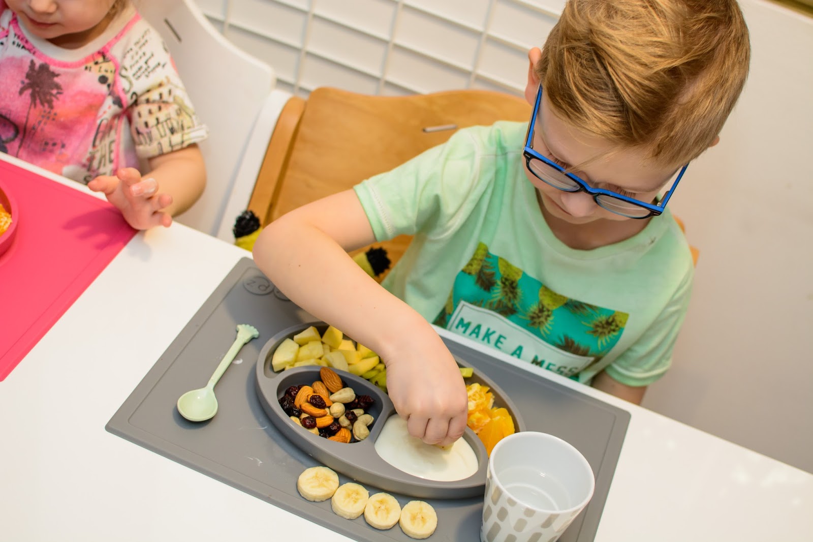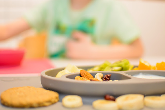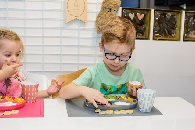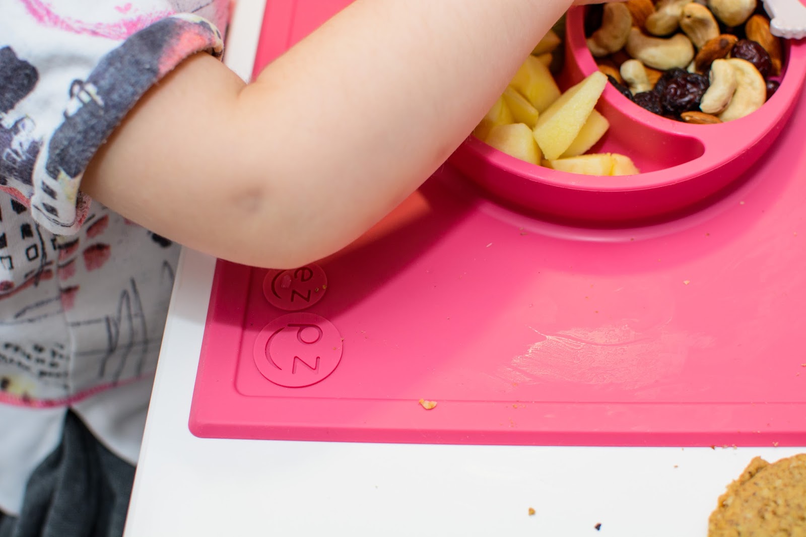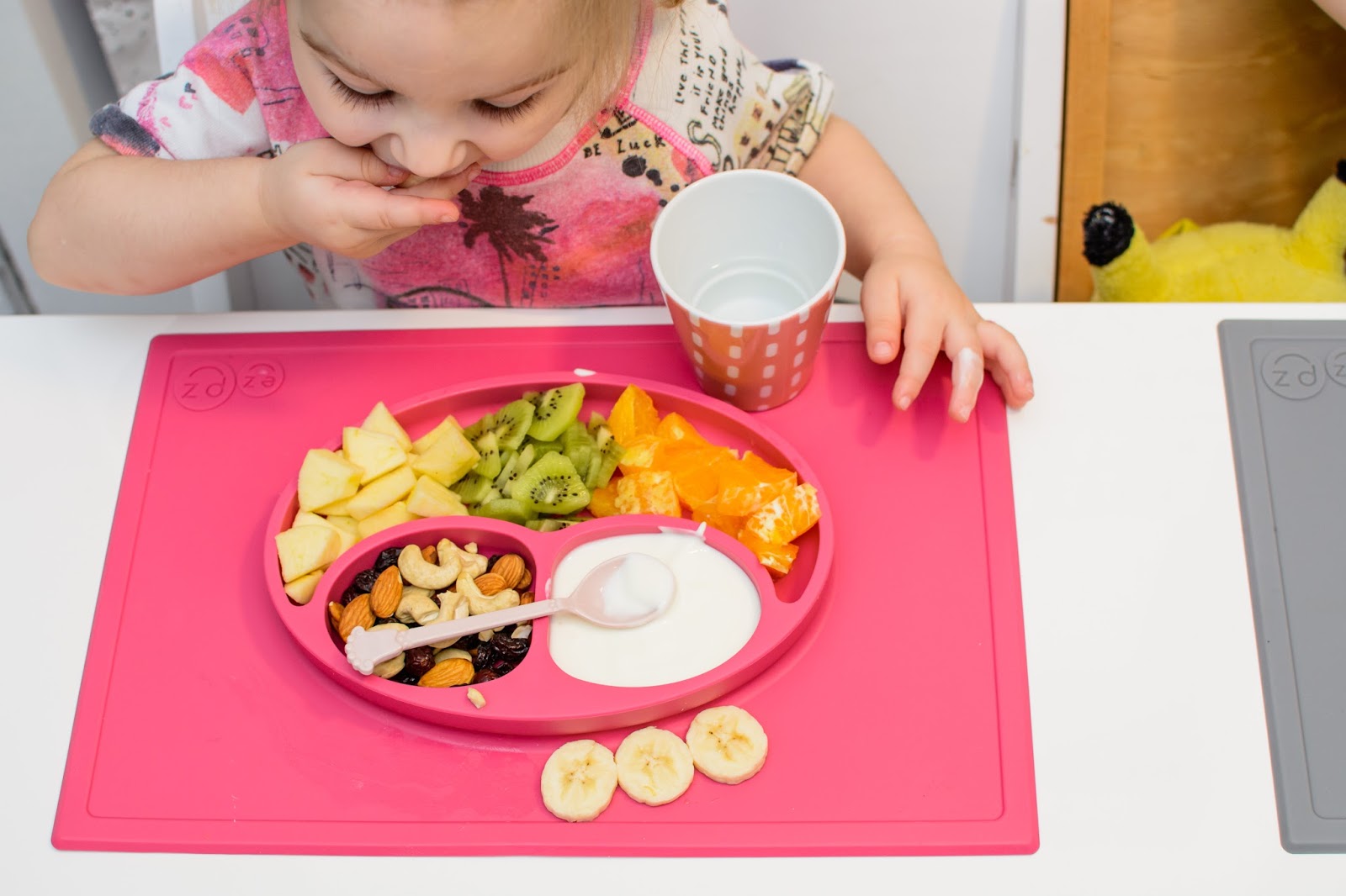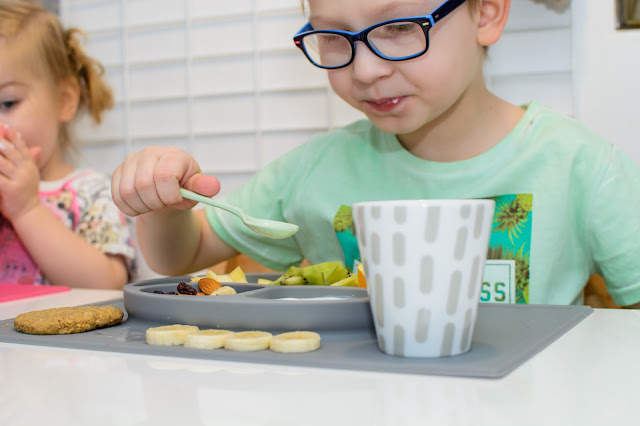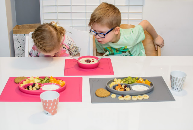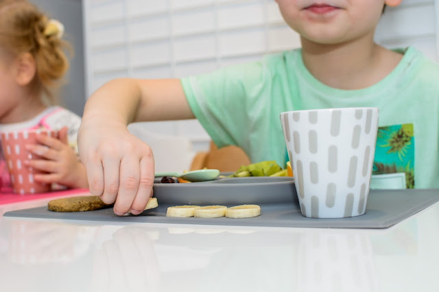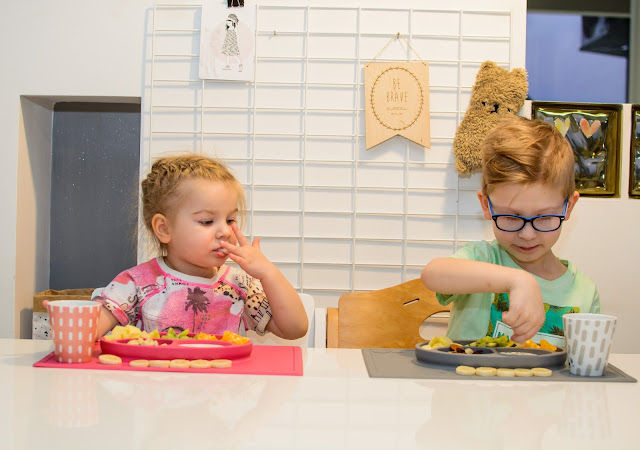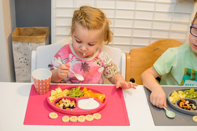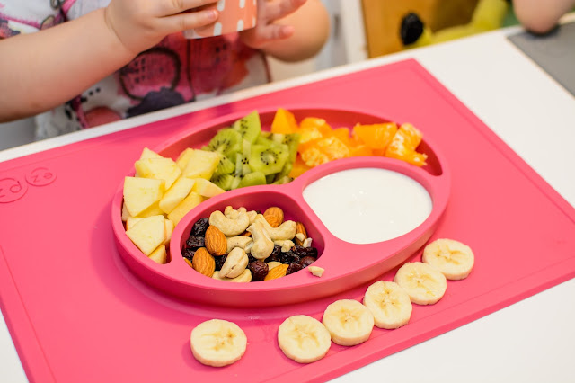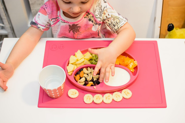 Rano wstajemy godzinę przed wyjściem do przedszkola. Mamy więc czas na ubranie się, jedzenie, mycie ząbków a czasem też na krótką zabawę. Czasami jednak w ciągu tej godziny potrafimy się nie wyrobić, to są te dni kiedy nikomu nie chce się wyjść z łóżka, szykować ubrań ani niczego jeść. W takie dni moja rola rośnie do rangi niezastąpionej w ratowaniu beznadziejnych sytuacji. Wtedy trzeba maluchy wziąć podstępem i załatwić im coś extra! Takie extra coś zafundowało nam ostatnio ezpz i bardzo chcę abyście i Wy je poznali. Wykorzystałam te maty do wielu zabaw, głównie w poznawanie nowych smaków i nazywanie nowych owoców lub rodzajów orzechów. Wracamy też dzięki nim do beztroskiego jedzenia rękami i paluszkami. Młoda uwielbia! Mata stabilnie leży na stole i nie przesuwa się, jest więc niezastąpiona do zabawy przy stole. Łączenie zabawy z jedzeniem to jeden z tych sposobów, które dają nam wygrać tyle dziecięcej radości. Fakt, że często ta radość przeradza się w (nie)czyste wariactwo. Dochodzi wtedy do tańców i śpiewów z łyżką w buzi lub zupą na kolanach. Nie zawsze zatem te wspólne posiłki wychodzą nam dobrze, posiłkujemy się więc różnymi wynalazkami, które minimalizują wypadki.