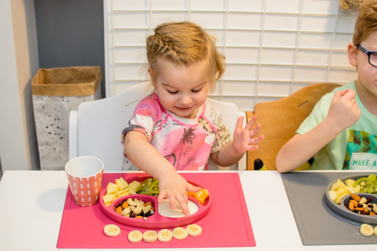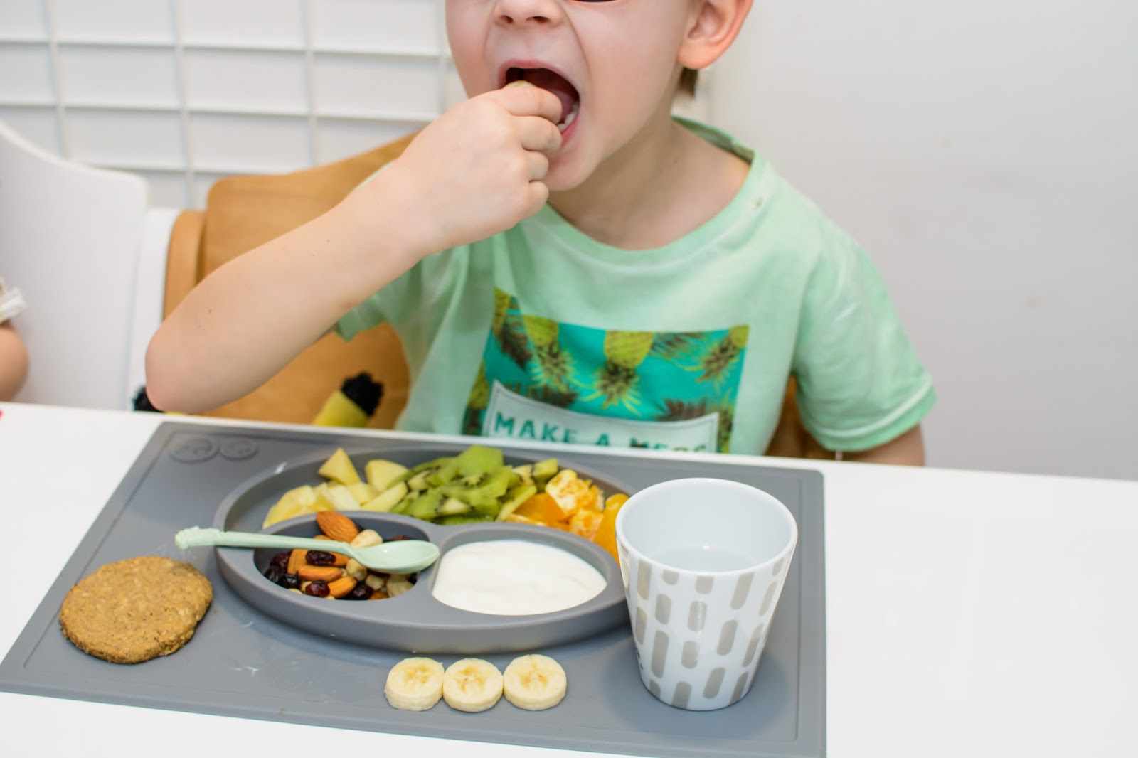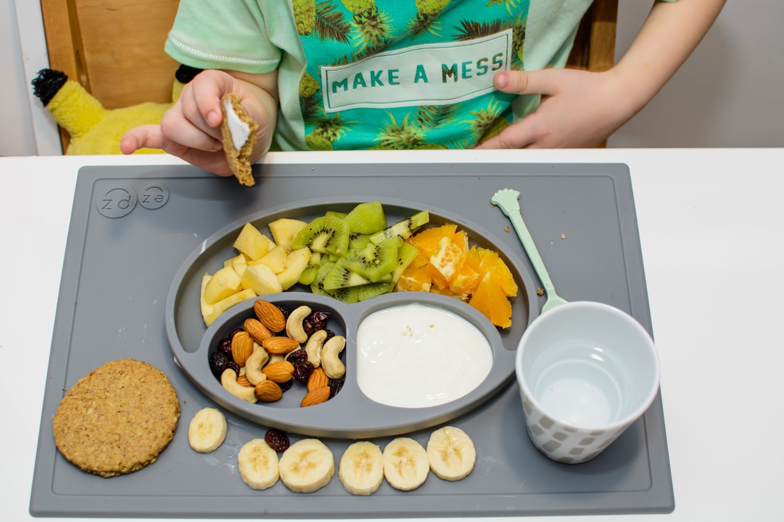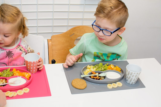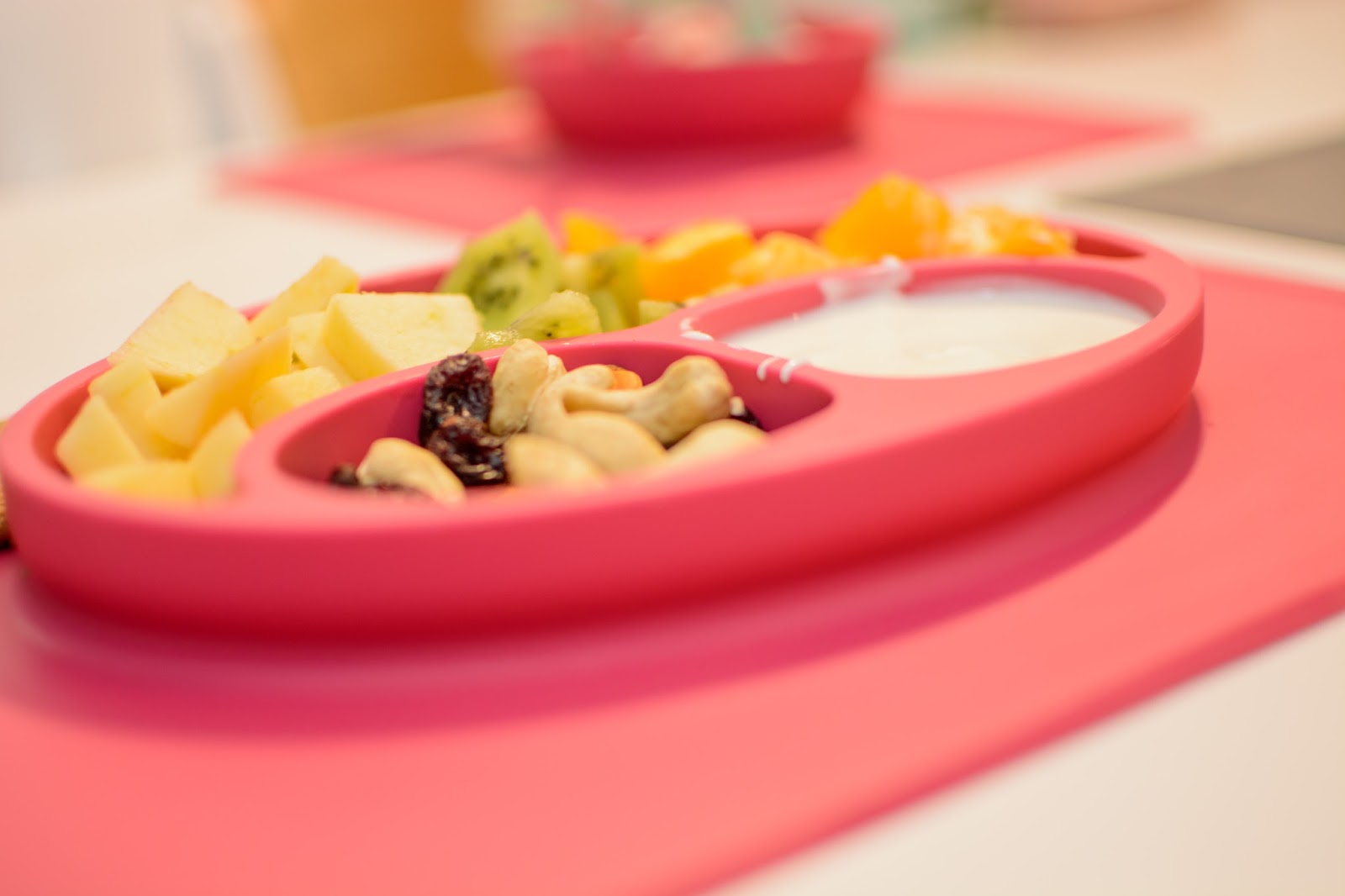 Rano wstajemy godzinę przed wyjściem do przedszkola. Mamy więc czas na ubranie się, jedzenie, mycie ząbków a czasem też na krótką zabawę. Czasami jednak w ciągu tej godziny potrafimy się nie wyrobić, to są te dni kiedy nikomu nie chce się wyjść z łóżka, szykować ubrań ani niczego jeść. W takie dni moja rola rośnie do rangi niezastąpionej w ratowaniu beznadziejnych sytuacji. Wtedy trzeba maluchy wziąć podstępem i załatwić im coś extra! Takie extra coś zafundowało nam ostatnio ezpz i bardzo chcę abyście i Wy je poznali. Wykorzystałam te maty do wielu zabaw, głównie w poznawanie nowych smaków i nazywanie nowych owoców lub rodzajów orzechów. Wracamy też dzięki nim do beztroskiego jedzenia rękami i paluszkami. Młoda uwielbia! Mata stabilnie leży na stole i nie przesuwa się, jest więc niezastąpiona do zabawy przy stole. Łączenie zabawy z jedzeniem to jeden z tych sposobów, które dają nam wygrać tyle dziecięcej radości. Fakt, że często ta radość przeradza się w (nie)czyste wariactwo. Dochodzi wtedy do tańców i śpiewów z łyżką w buzi lub zupą na kolanach. Nie zawsze zatem te wspólne posiłki wychodzą nam dobrze, posiłkujemy się więc różnymi wynalazkami, które minimalizują wypadki.