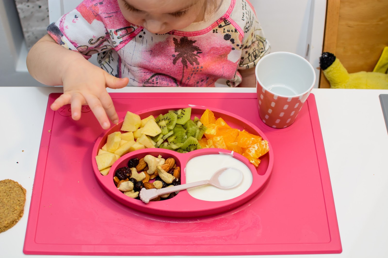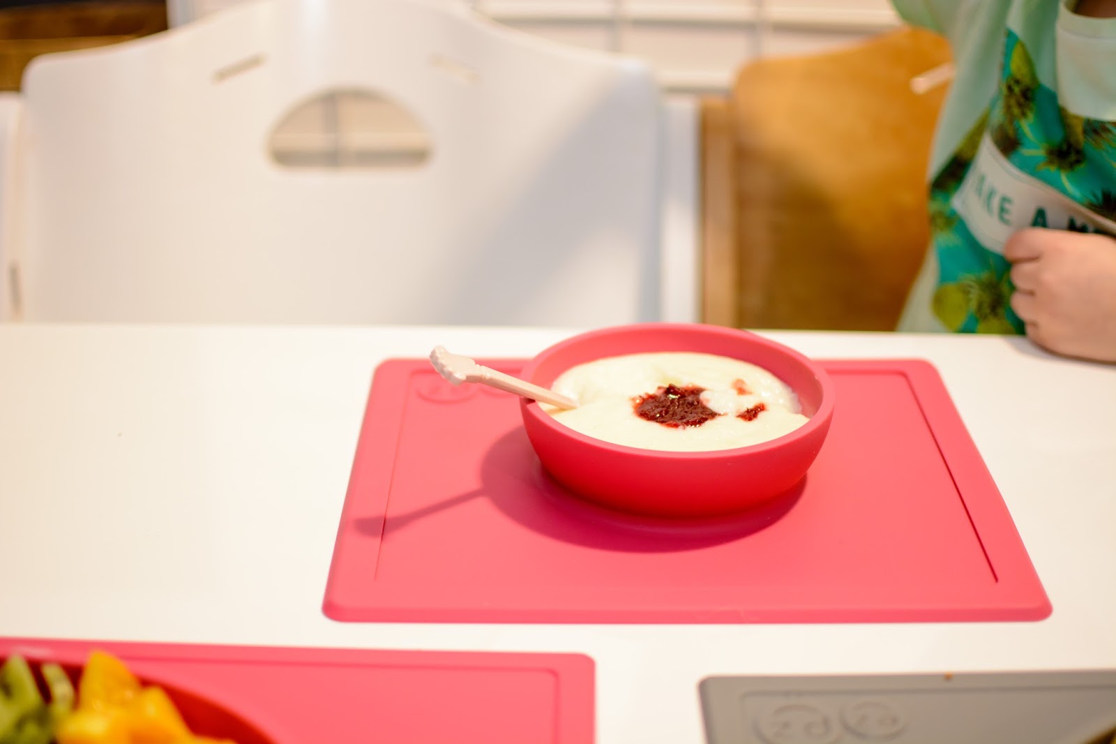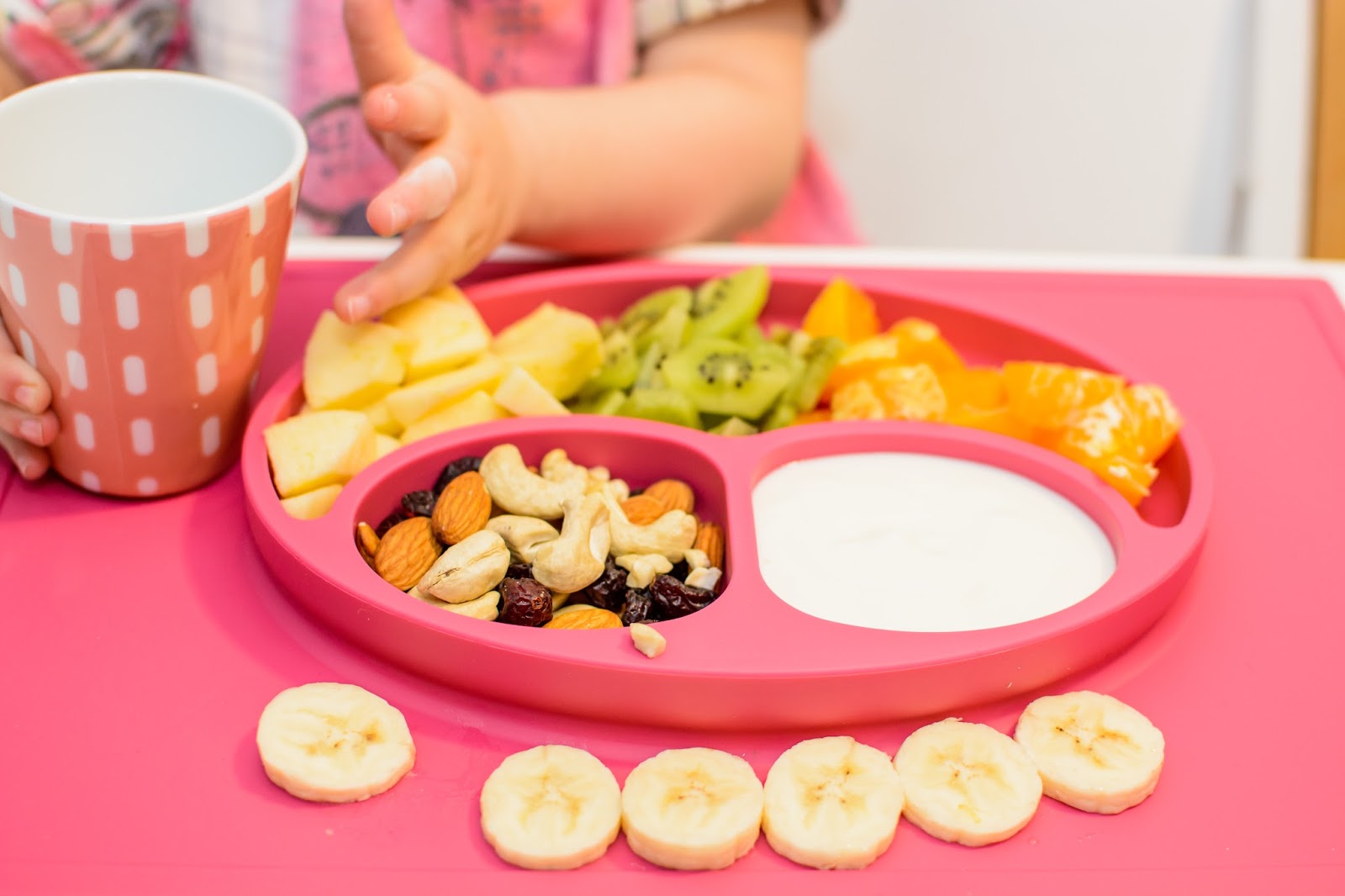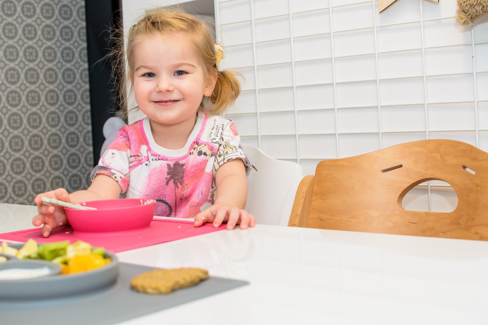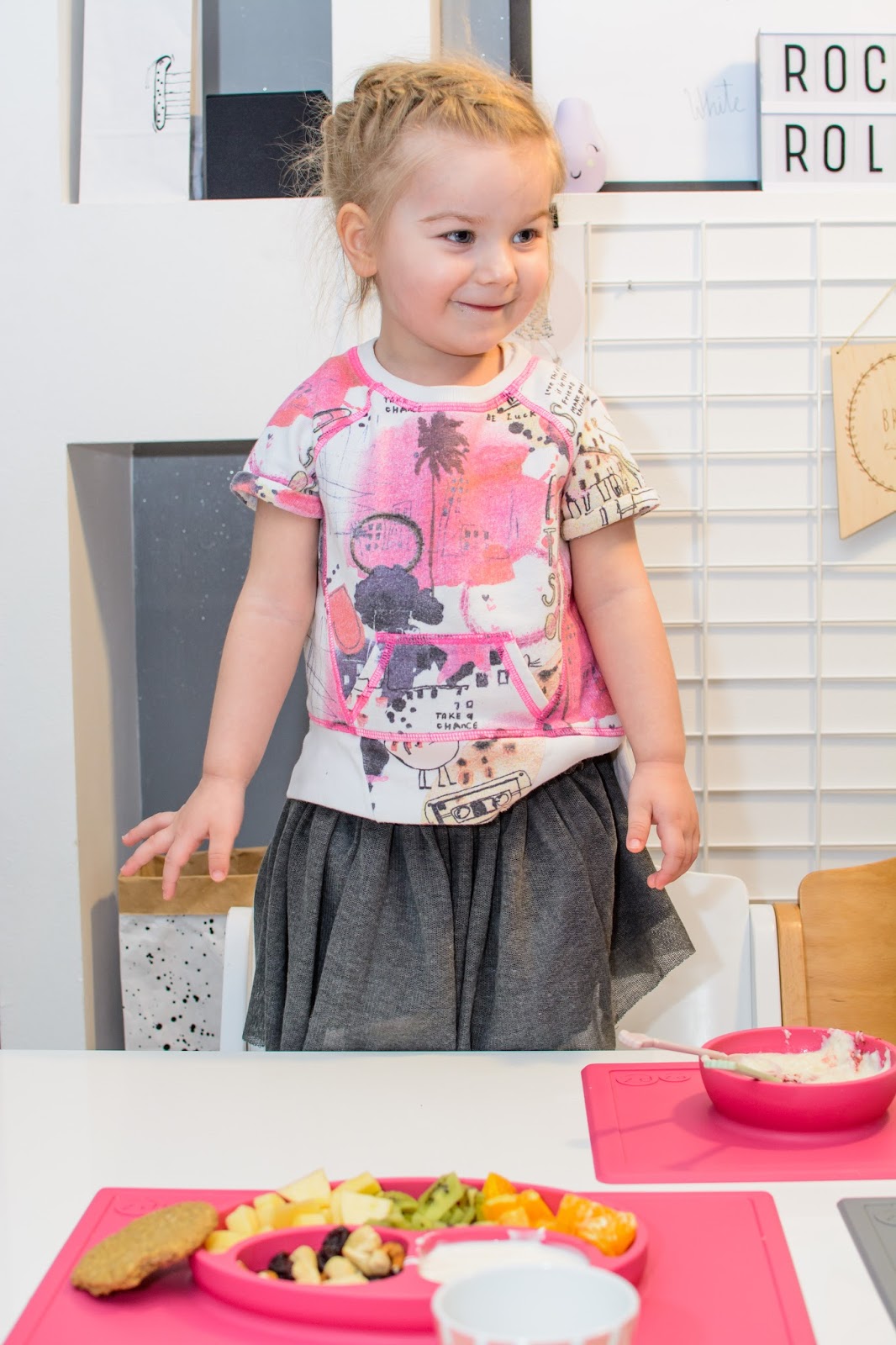 Rano wstajemy godzinę przed wyjściem do przedszkola. Mamy więc czas na ubranie się, jedzenie, mycie ząbków a czasem też na krótką zabawę. Czasami jednak w ciągu tej godziny potrafimy się nie wyrobić, to są te dni kiedy nikomu nie chce się wyjść z łóżka, szykować ubrań ani niczego jeść. W takie dni moja rola rośnie do rangi niezastąpionej w ratowaniu beznadziejnych sytuacji. Wtedy trzeba maluchy wziąć podstępem i załatwić im coś extra! Takie extra coś zafundowało nam ostatnio ezpz i bardzo chcę abyście i Wy je poznali. Wykorzystałam te maty do wielu zabaw, głównie w poznawanie nowych smaków i nazywanie nowych owoców lub rodzajów orzechów. Wracamy też dzięki nim do beztroskiego jedzenia rękami i paluszkami. Młoda uwielbia! Mata stabilnie leży na stole i nie przesuwa się, jest więc niezastąpiona do zabawy przy stole. Łączenie zabawy z jedzeniem to jeden z tych sposobów, które dają nam wygrać tyle dziecięcej radości. Fakt, że często ta radość przeradza się w (nie)czyste wariactwo. Dochodzi wtedy do tańców i śpiewów z łyżką w buzi lub zupą na kolanach. Nie zawsze zatem te wspólne posiłki wychodzą nam dobrze, posiłkujemy się więc różnymi wynalazkami, które minimalizują wypadki.