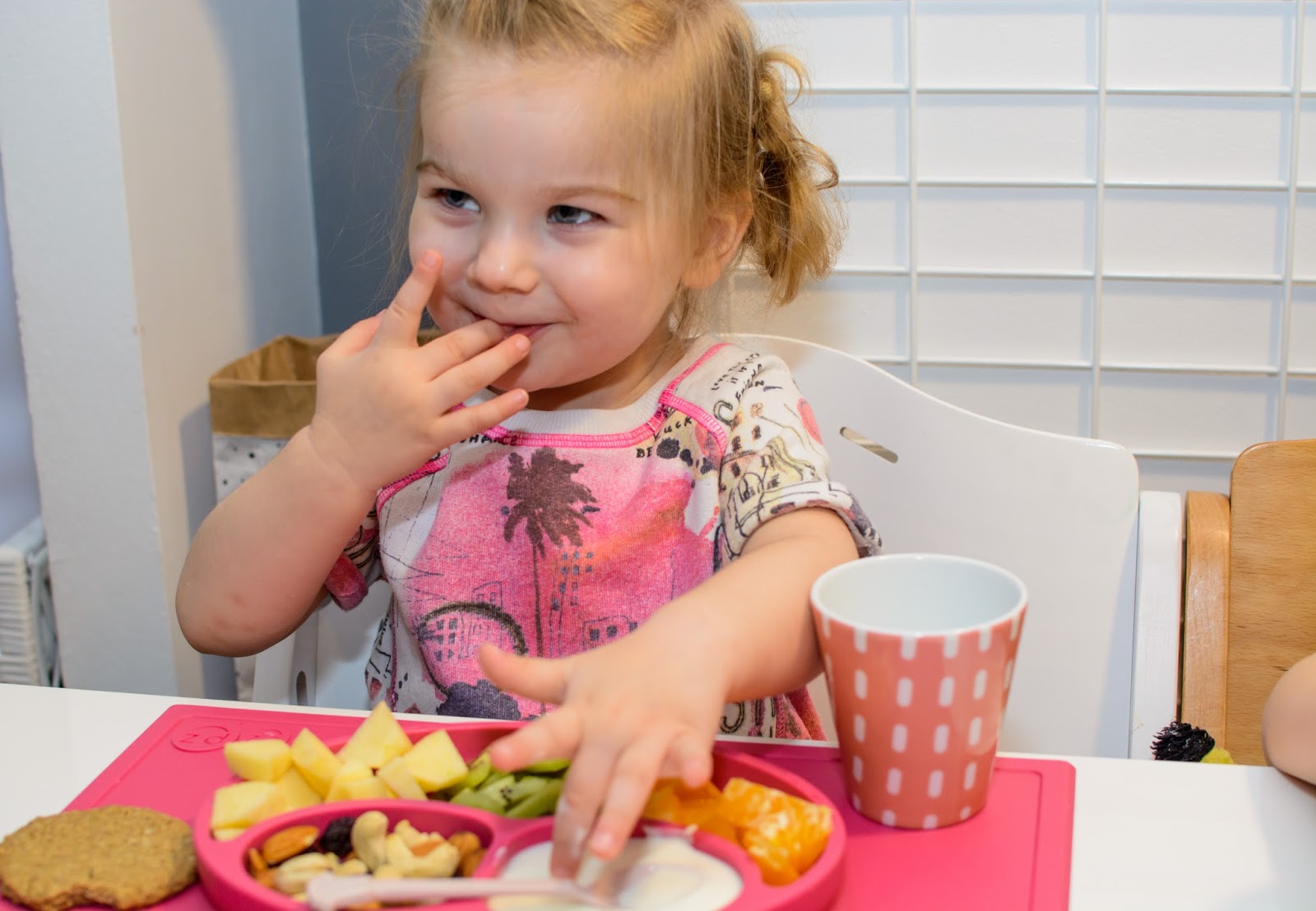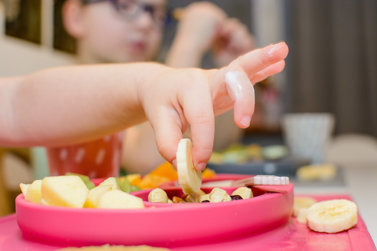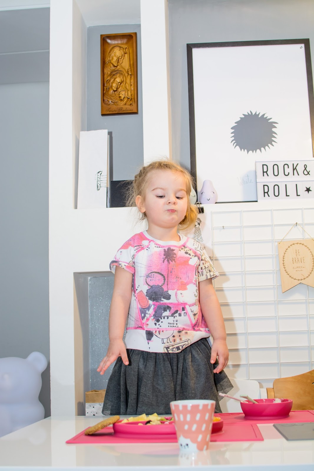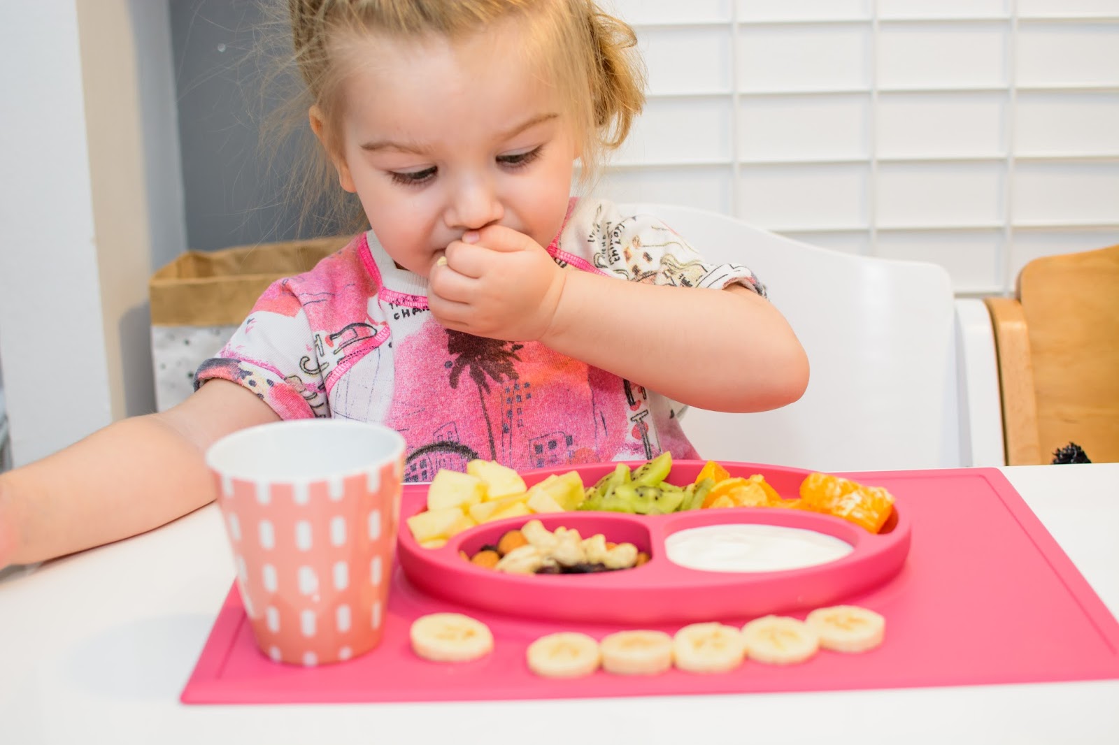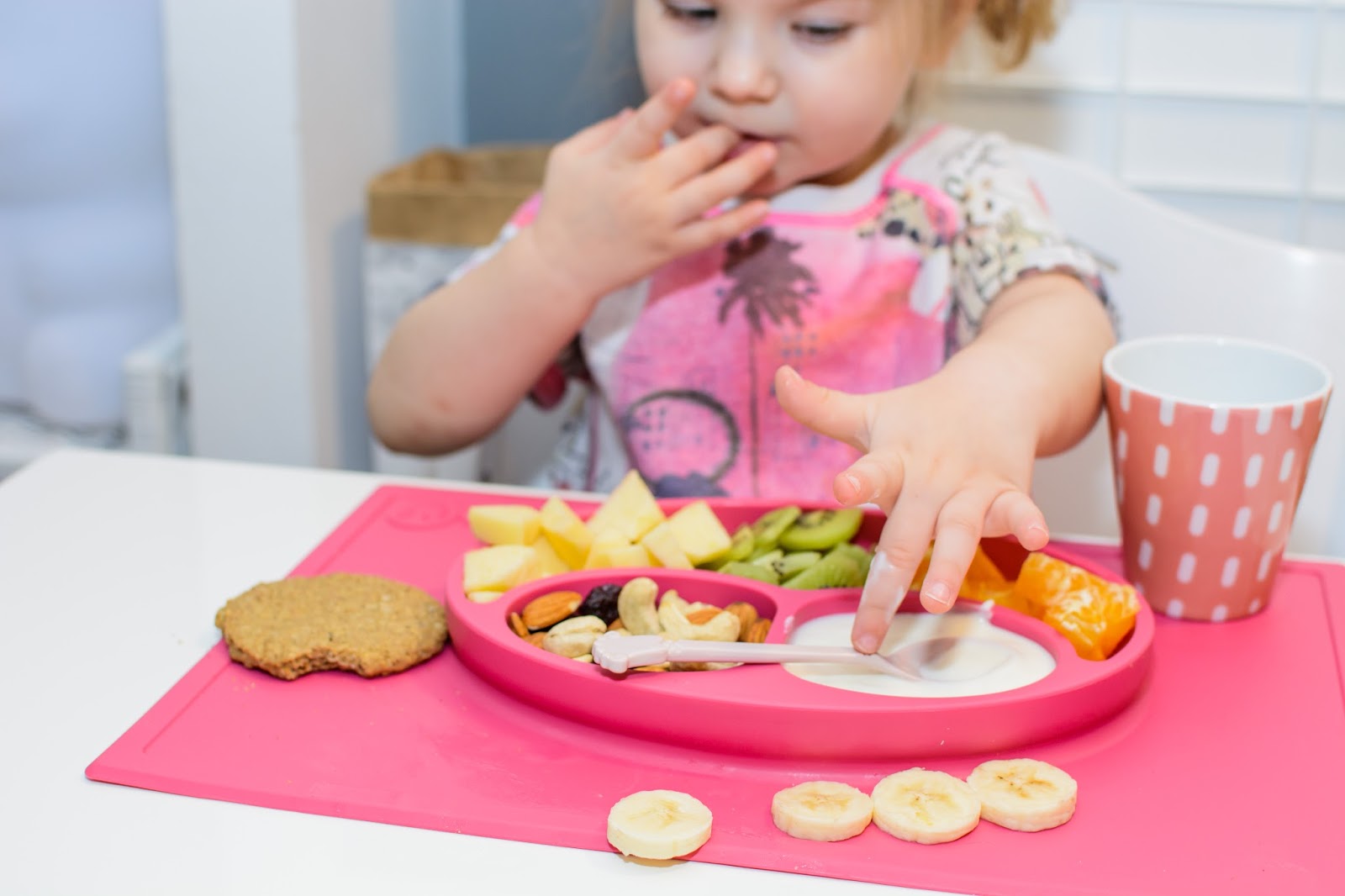 Rano wstajemy godzinę przed wyjściem do przedszkola. Mamy więc czas na ubranie się, jedzenie, mycie ząbków a czasem też na krótką zabawę. Czasami jednak w ciągu tej godziny potrafimy się nie wyrobić, to są te dni kiedy nikomu nie chce się wyjść z łóżka, szykować ubrań ani niczego jeść. W takie dni moja rola rośnie do rangi niezastąpionej w ratowaniu beznadziejnych sytuacji. Wtedy trzeba maluchy wziąć podstępem i załatwić im coś extra! Takie extra coś zafundowało nam ostatnio ezpz i bardzo chcę abyście i Wy je poznali. Wykorzystałam te maty do wielu zabaw, głównie w poznawanie nowych smaków i nazywanie nowych owoców lub rodzajów orzechów. Wracamy też dzięki nim do beztroskiego jedzenia rękami i paluszkami. Młoda uwielbia! Mata stabilnie leży na stole i nie przesuwa się, jest więc niezastąpiona do zabawy przy stole. Łączenie zabawy z jedzeniem to jeden z tych sposobów, które dają nam wygrać tyle dziecięcej radości. Fakt, że często ta radość przeradza się w (nie)czyste wariactwo. Dochodzi wtedy do tańców i śpiewów z łyżką w buzi lub zupą na kolanach. Nie zawsze zatem te wspólne posiłki wychodzą nam dobrze, posiłkujemy się więc różnymi wynalazkami, które minimalizują wypadki.