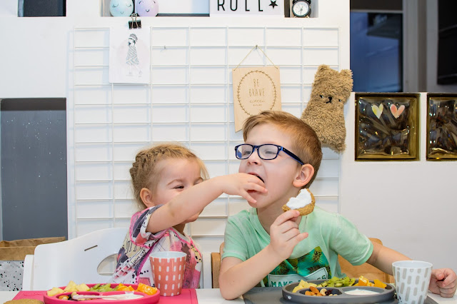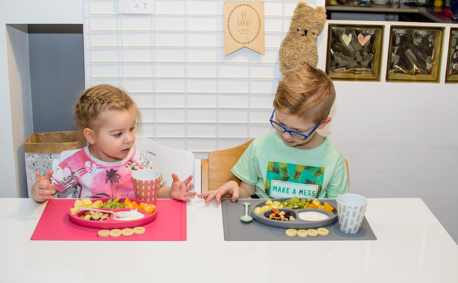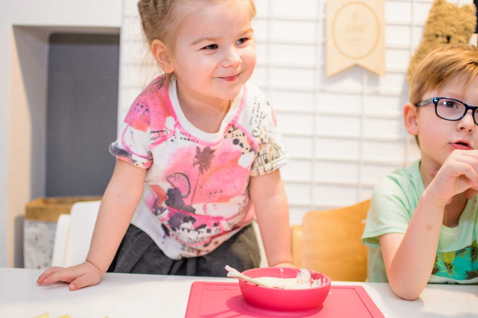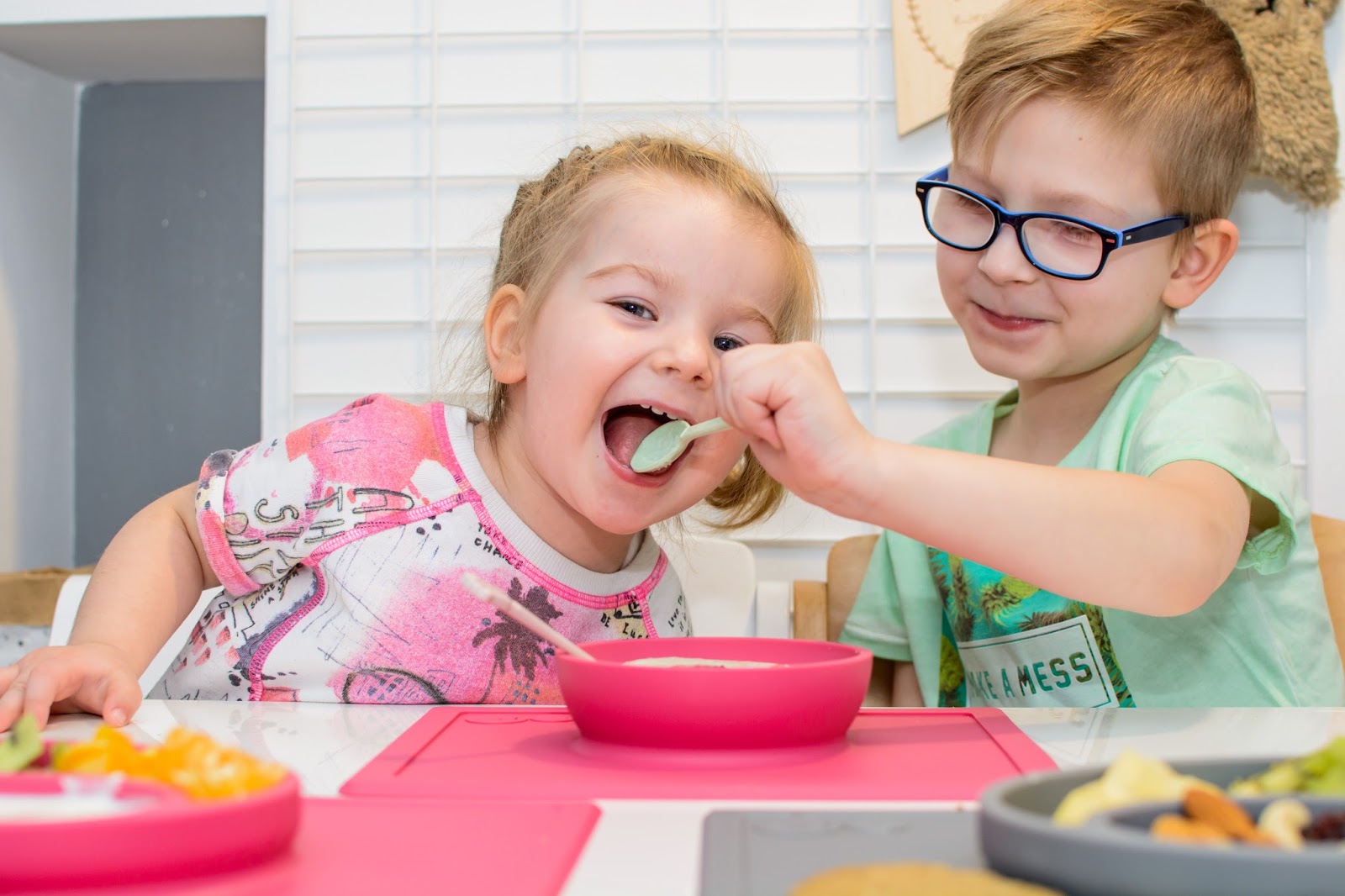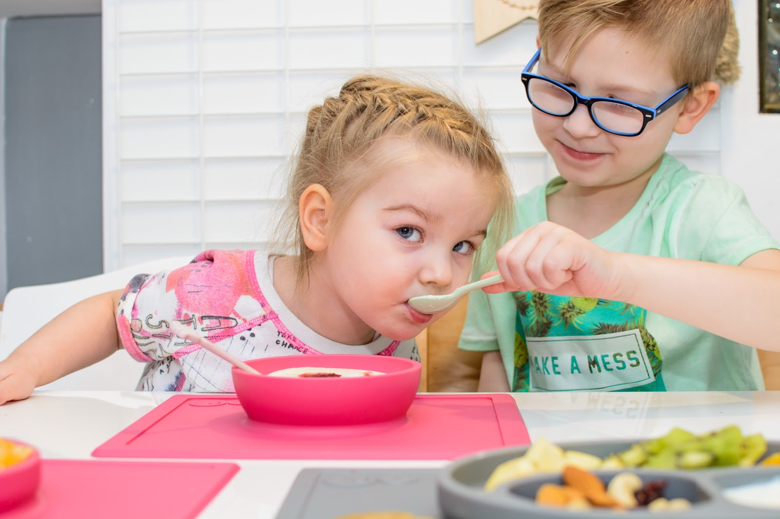 Zamieniają się łyżkami, miskami i talerzykami, często nawet jedzeniem. Jedzą z jednej miski i karmią się nawzajem wylewając zawartość talerzy na stół i ubrania mimo tego, że bardzo się starają. Podczas śniadania zazwyczaj zadają milion pytań i buzia im się nie zamyka mimo łyżki w środku, w najgorszym przypadku wszystko cieknie po brodzie. Śpiewają i mówią wierszyki a Natka potrafi nawet zatańczyć na swoim krzesełku i dzięki Bogu, że jest stabilne bo kręci się na nim dosłownie w kółko non stop.