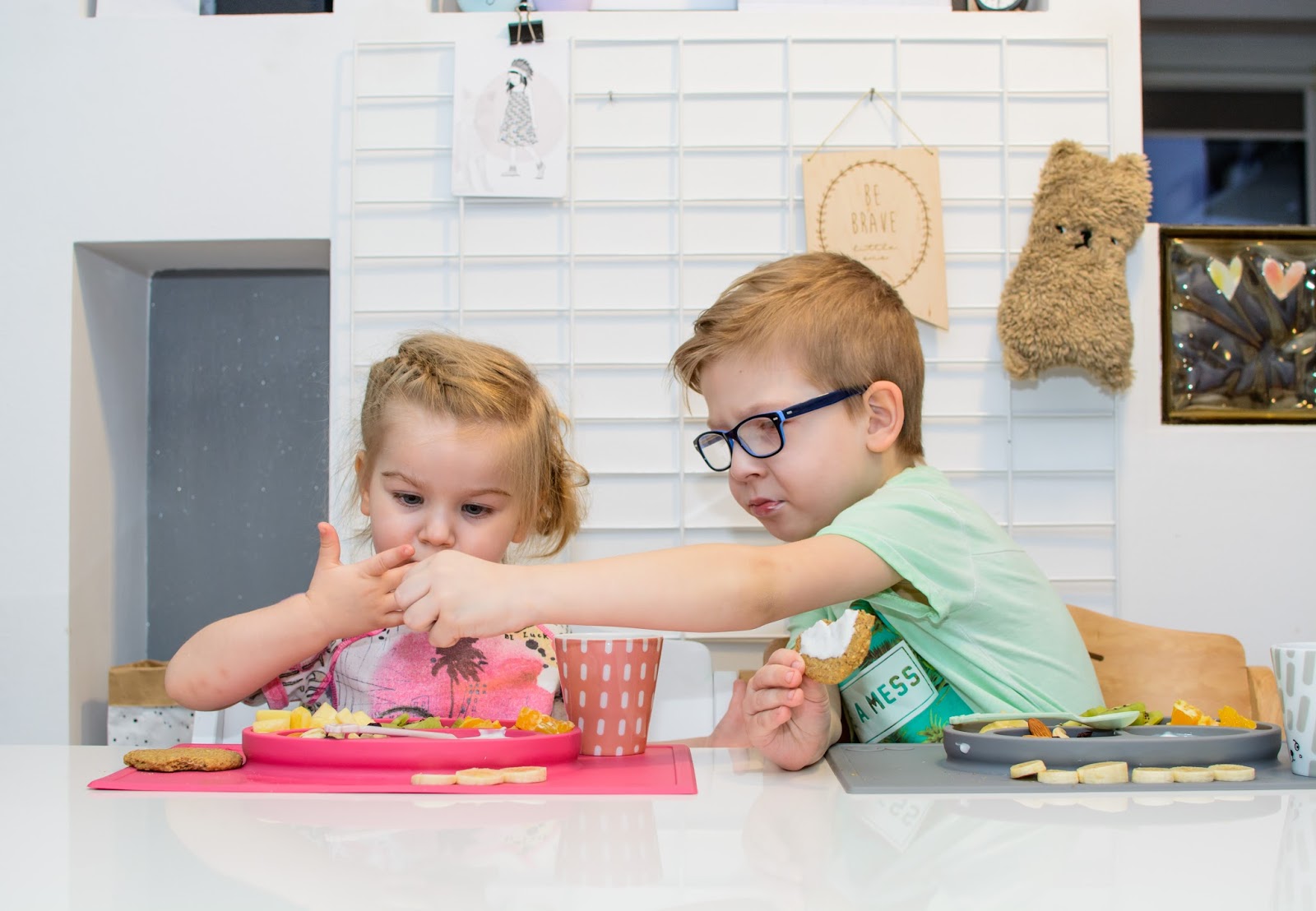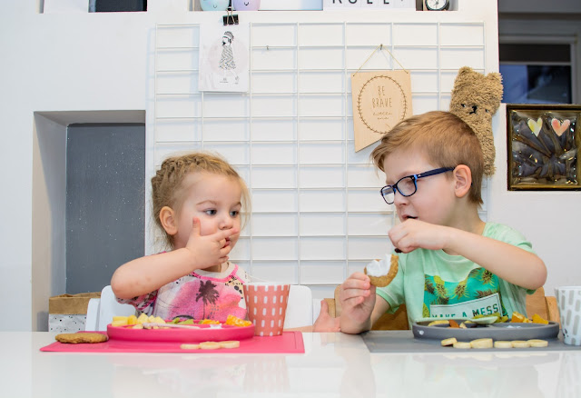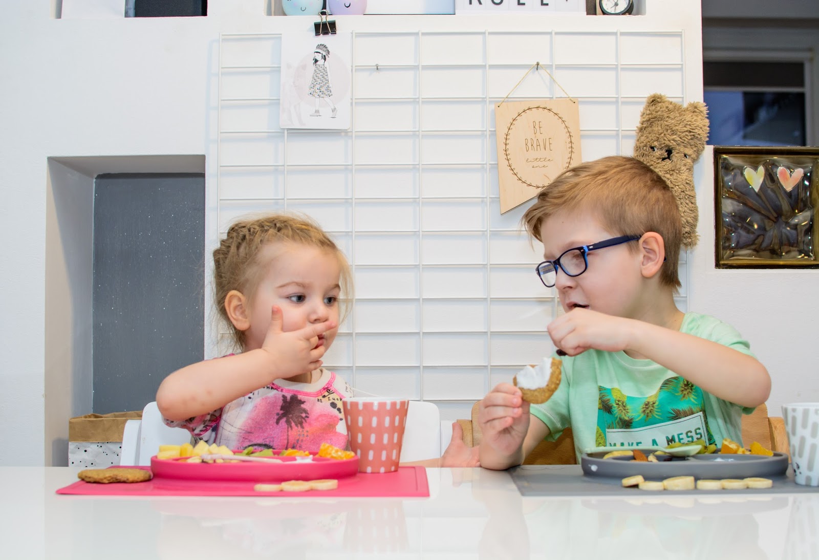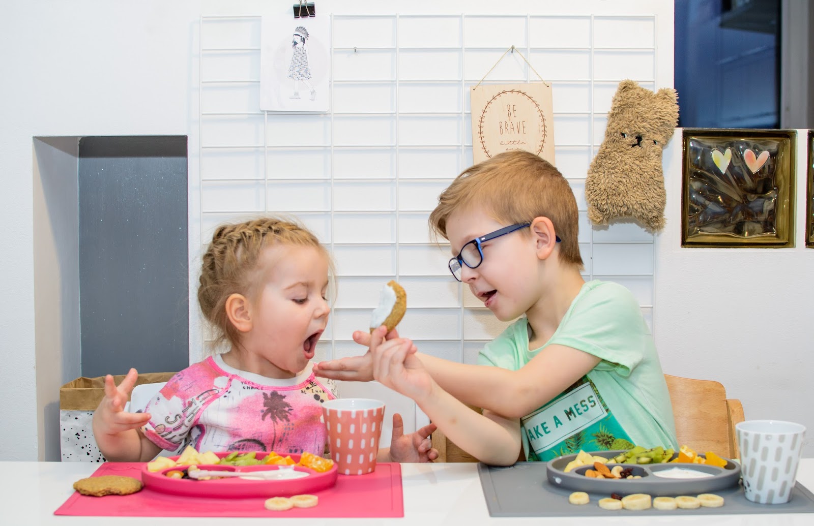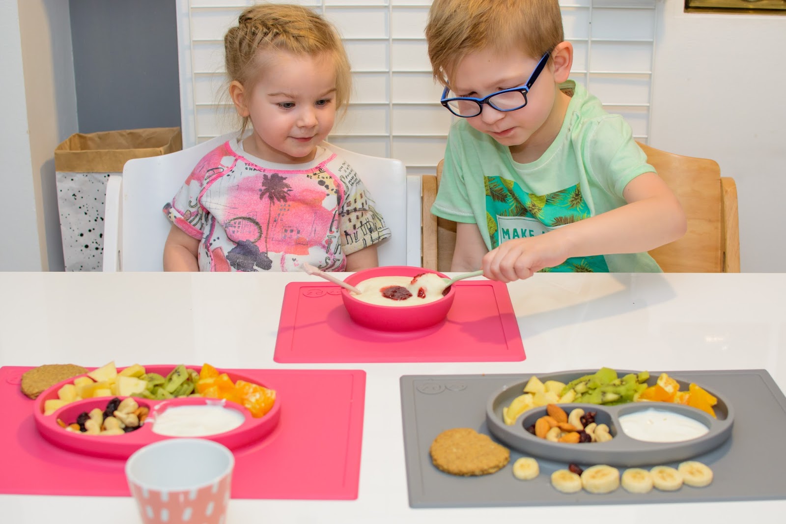 Zamieniają się łyżkami, miskami i talerzykami, często nawet jedzeniem. Jedzą z jednej miski i karmią się nawzajem wylewając zawartość talerzy na stół i ubrania mimo tego, że bardzo się starają. Podczas śniadania zazwyczaj zadają milion pytań i buzia im się nie zamyka mimo łyżki w środku, w najgorszym przypadku wszystko cieknie po brodzie. Śpiewają i mówią wierszyki a Natka potrafi nawet zatańczyć na swoim krzesełku i dzięki Bogu, że jest stabilne bo kręci się na nim dosłownie w kółko non stop.