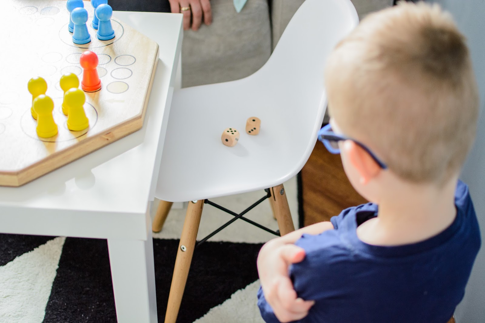 Nie da sobie przetłumaczyć, że pewne instrukcje są do przestrzegania i po prostu tak ma być, trzeba się dostosować i tyle. On wprowadza swoje, odwrotne, na opak – aby pod siebie. Weź tu graj z takim kiedy zasady zmieniają się co chwilę i zależą od losowego rzutu kostką za każdym razem. Przynajmniej za każdym razem jest ciekawie. Nową grę poznał a już się wymądrza, na dodatek oszukuje. Dwie kostki rzuca zamiast jednej i wyznacza odwrotny kierunek ruchów kpiąc sobie z zegarowych wskazówek. Rozhisteryzowany opuszcza stół kiedy nie wyrzuci szóstki i wraca kiedy humor mu się poprawi. Wkurza mnie i rozbawia do łez zarazem.