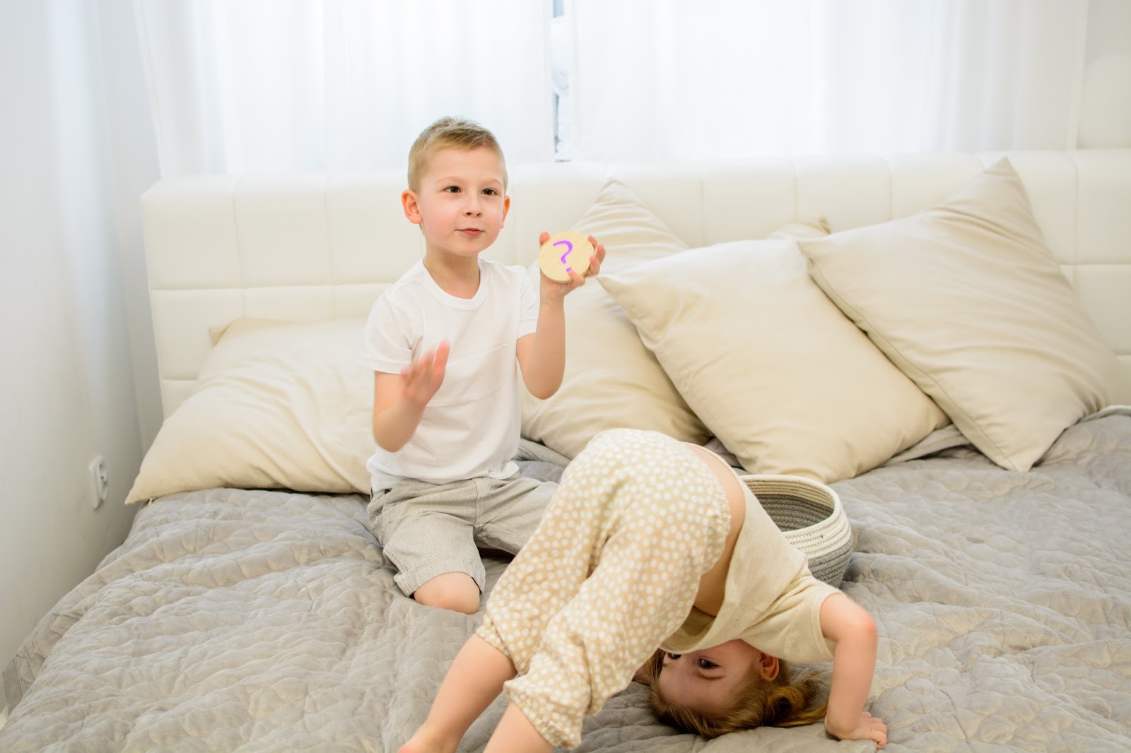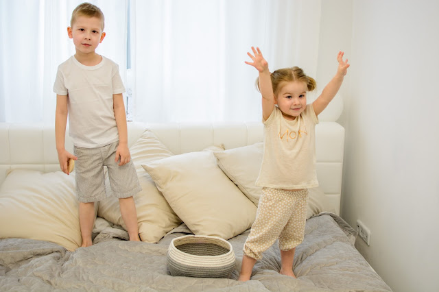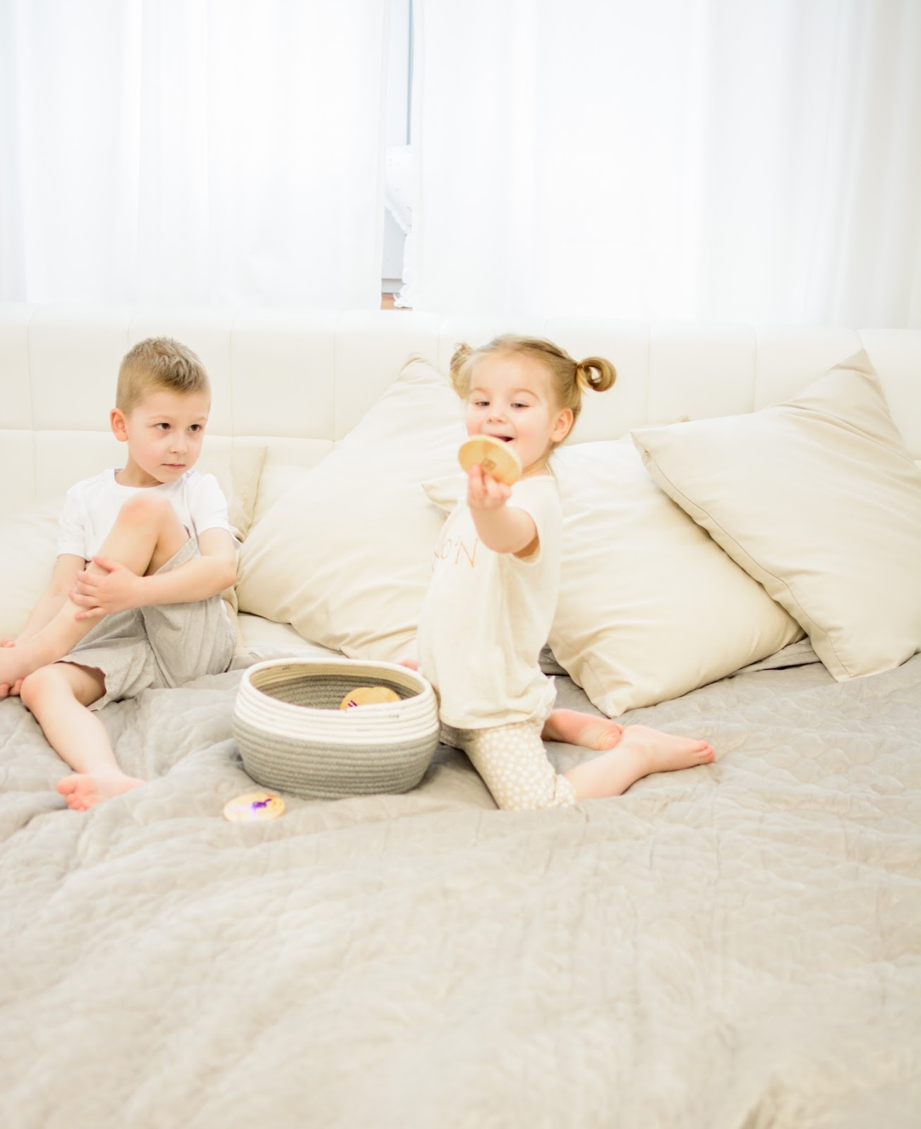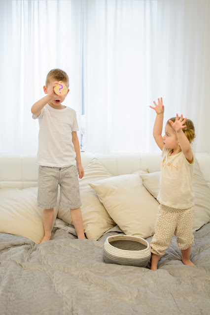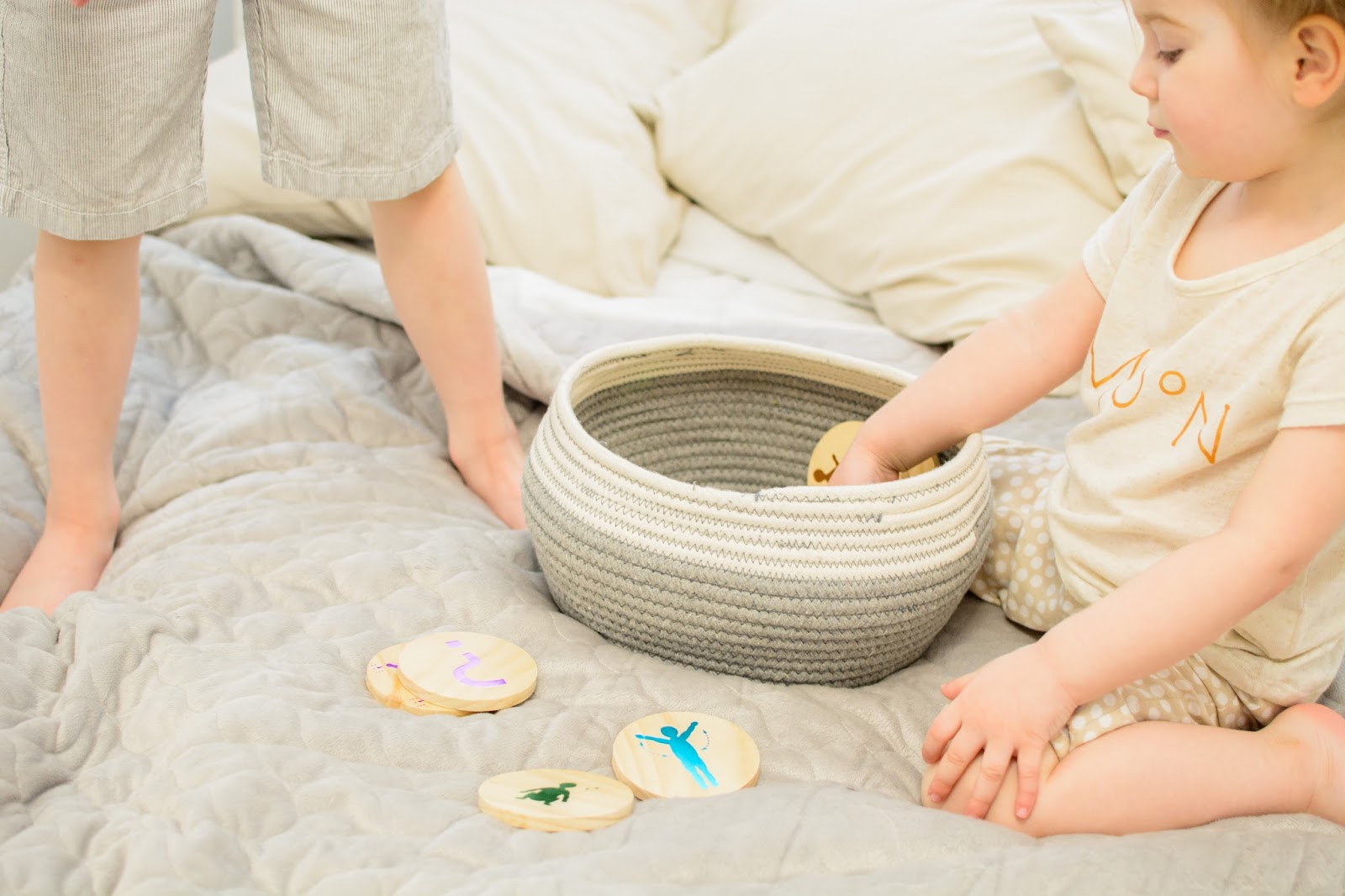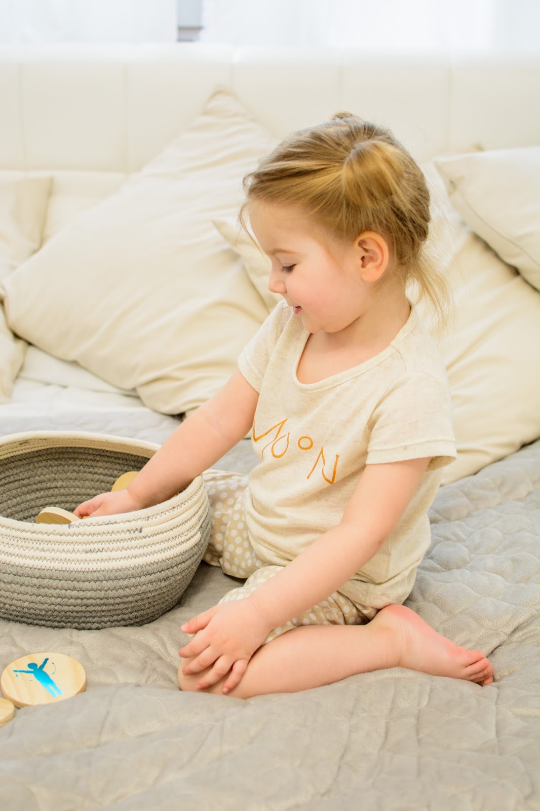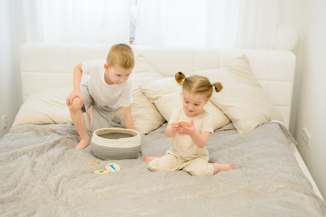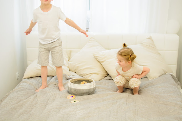 Co z tego, że mają swój pokój. Co z tego, że mają spory pokój dzienny, do którego ciągle znoszą zabawki ( Tak jak TU). Już dawno rozpoczęli ekspansję dodatkowo na nasz osobisty sypialniany teren. Zagarnęli wszystko bez skrupułów a my się im poddajemy. Budząc się rano z obcą nogą na głowie i małymi paluszkami w oku nie zawsze dobrze się wstaje. Kiedy właściciel tej nogi i tych paluszków równocześnie bezlitośnie ściąga z Ciebie cieplutką kołdrę krzycząc „mamoooooo nie śpij już!” nie wiesz czy to nadal zły sen czy już poranna rzeczywistość. Zanim młoda zacznie spać do 10tej tak jak Tomik minie jeszcze kilka lat. Tymczasem mimo tego, że jedno jeszcze śpi trzeba się zrywać do drugiego. Oczywiście zrywa się mama kiedy tata słodko jeszcze śpi. idąc dalej tym tropem im bardziej wolny jest dzień tym zrywam się wcześniej. I wtedy się zaczyna.. co tu zrobić żeby ukraść dla siebie jeszcze pięć minutek z zamkniętymi oczami, chociaż 4 poleżeć jeszcze taka niewidoczna pod kołdrą? Marzę o tym, żeby ją czymś zająć a kiedy obudzi już brata żeby zająć obydwoje. Zbyt długo myśleć nie mogę bo dość szybko pojawia się okrzyk „mamo włącz mi youtube!” dlatego próbuję coraz to czegoś nowego. Ostatnio znalazłam sposób na zajęcie porannych ptaszków – grę Moves! Drewniane koła kryją przeróżne pozy ludzików, które należy naśladować. Tylko tyle, już koniec – to im wystarcza a zajęcie mają co najmniej na pół godzinki. Skaczą na jednej nodze, robią skłony i wymachują rękami – śmiechu mają po pachy i ćwiczenia z rana zaliczone. To dla mnie gra na wagę złota. Taka, która zajmie dzieci bez konieczności uczestnictwa rodziców. Czasem tak niewiele daje wielki efekt a to, że są razem umożliwia im tysiące możliwości. Jedno zachęca drugie, pojawia się rywalizacja i oczywiście naśladowanie. Gra uczy tego, że ćwiczenia to zabawa i radość i przemyca masę zdrowego ruchu.