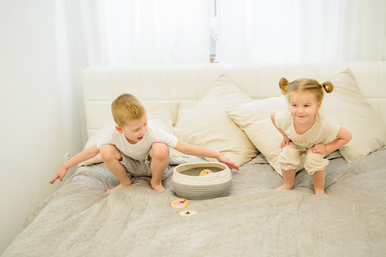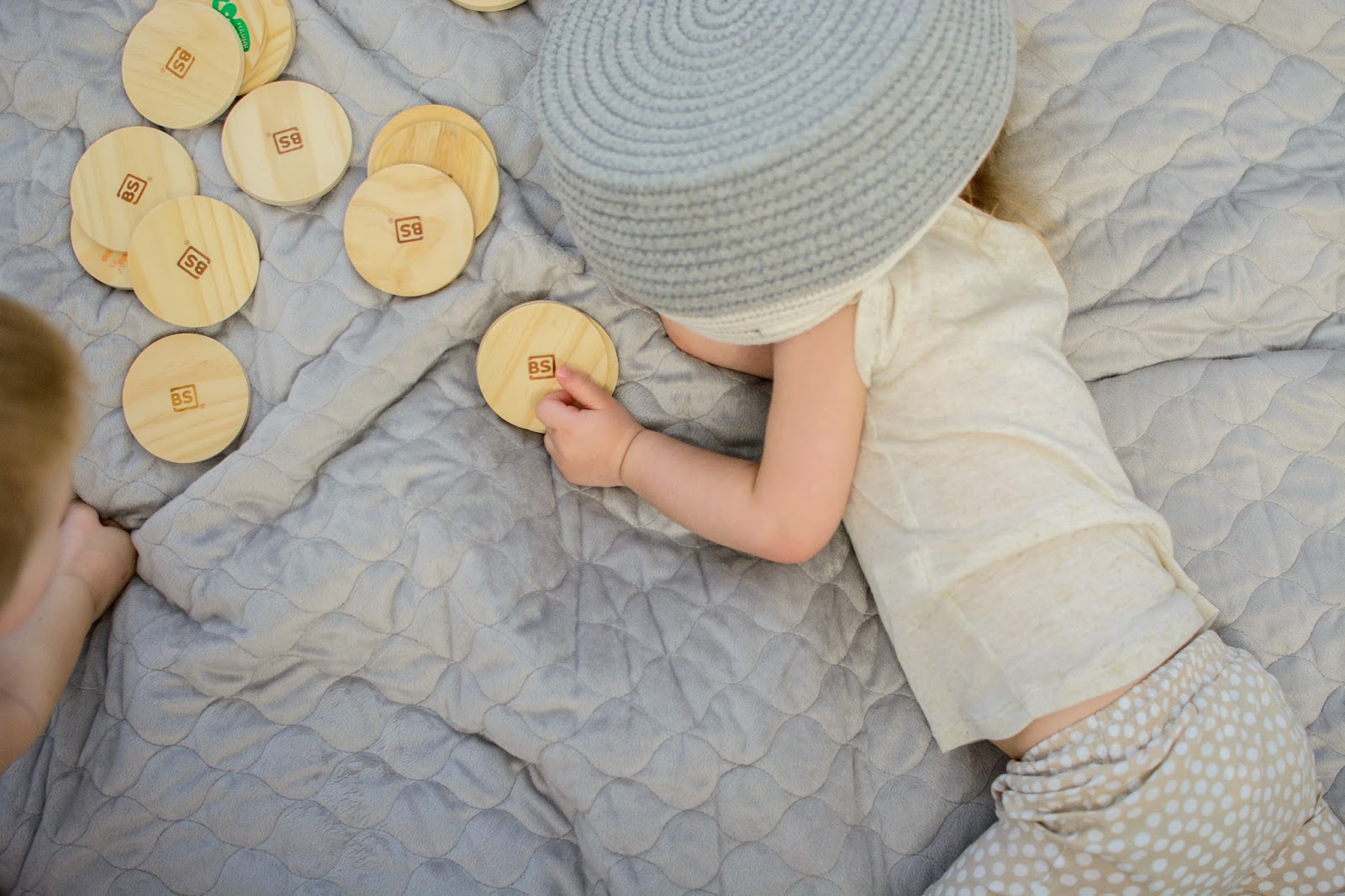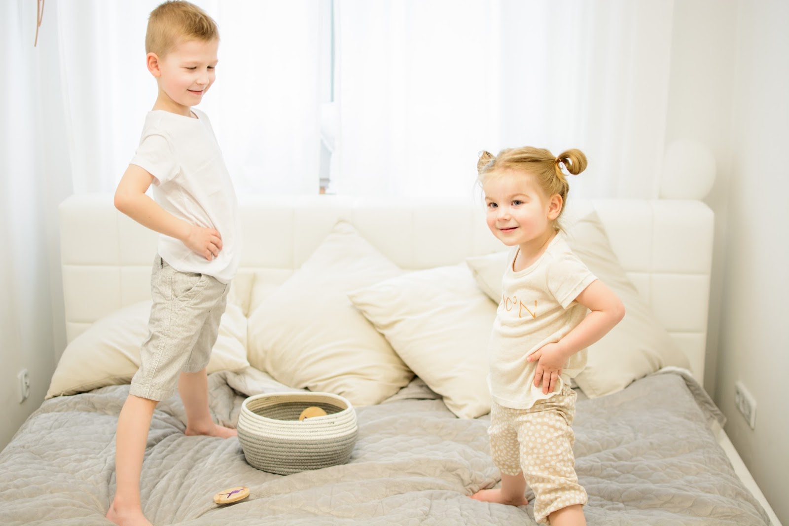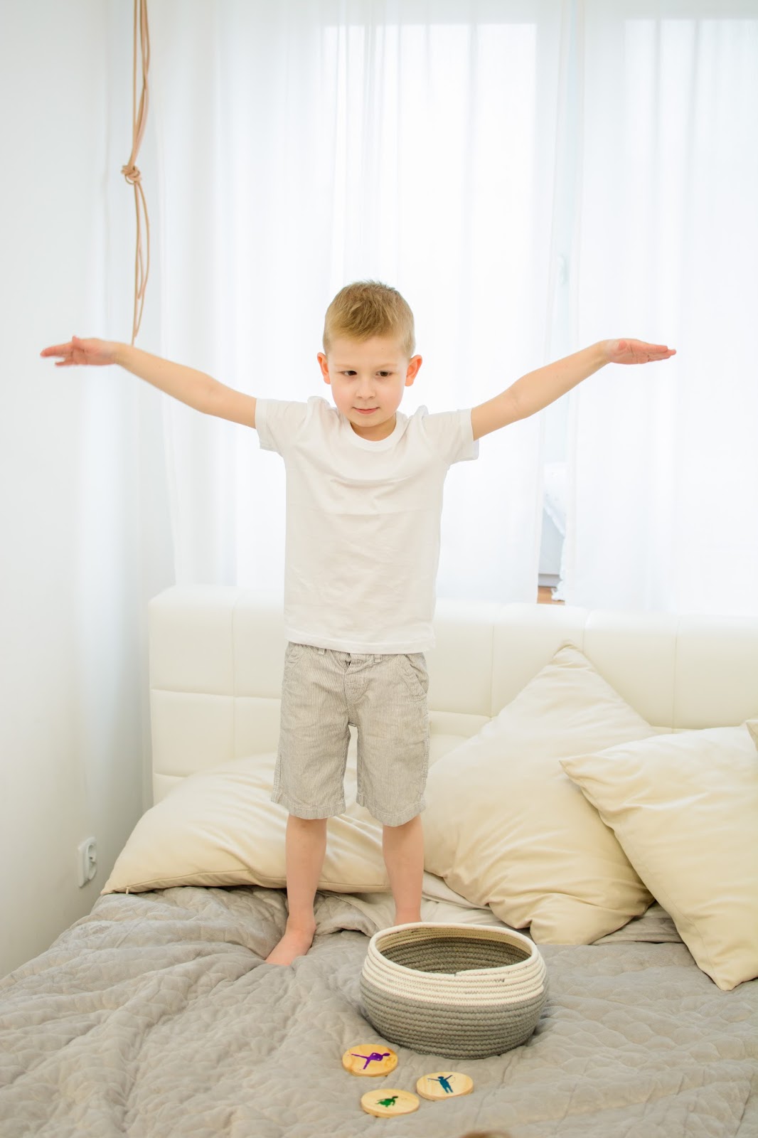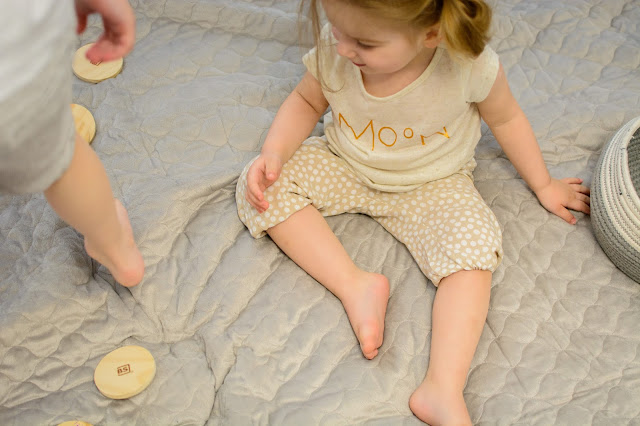 Co z tego, że mają swój pokój. Co z tego, że mają spory pokój dzienny, do którego ciągle znoszą zabawki ( Tak jak TU). Już dawno rozpoczęli ekspansję dodatkowo na nasz osobisty sypialniany teren. Zagarnęli wszystko bez skrupułów a my się im poddajemy. Budząc się rano z obcą nogą na głowie i małymi paluszkami w oku nie zawsze dobrze się wstaje. Kiedy właściciel tej nogi i tych paluszków równocześnie bezlitośnie ściąga z Ciebie cieplutką kołdrę krzycząc „mamoooooo nie śpij już!” nie wiesz czy to nadal zły sen czy już poranna rzeczywistość. Zanim młoda zacznie spać do 10tej tak jak Tomik minie jeszcze kilka lat. Tymczasem mimo tego, że jedno jeszcze śpi trzeba się zrywać do drugiego. Oczywiście zrywa się mama kiedy tata słodko jeszcze śpi. idąc dalej tym tropem im bardziej wolny jest dzień tym zrywam się wcześniej. I wtedy się zaczyna.. co tu zrobić żeby ukraść dla siebie jeszcze pięć minutek z zamkniętymi oczami, chociaż 4 poleżeć jeszcze taka niewidoczna pod kołdrą? Marzę o tym, żeby ją czymś zająć a kiedy obudzi już brata żeby zająć obydwoje. Zbyt długo myśleć nie mogę bo dość szybko pojawia się okrzyk „mamo włącz mi youtube!” dlatego próbuję coraz to czegoś nowego. Ostatnio znalazłam sposób na zajęcie porannych ptaszków – grę Moves! Drewniane koła kryją przeróżne pozy ludzików, które należy naśladować. Tylko tyle, już koniec – to im wystarcza a zajęcie mają co najmniej na pół godzinki. Skaczą na jednej nodze, robią skłony i wymachują rękami – śmiechu mają po pachy i ćwiczenia z rana zaliczone. To dla mnie gra na wagę złota. Taka, która zajmie dzieci bez konieczności uczestnictwa rodziców. Czasem tak niewiele daje wielki efekt a to, że są razem umożliwia im tysiące możliwości. Jedno zachęca drugie, pojawia się rywalizacja i oczywiście naśladowanie. Gra uczy tego, że ćwiczenia to zabawa i radość i przemyca masę zdrowego ruchu.