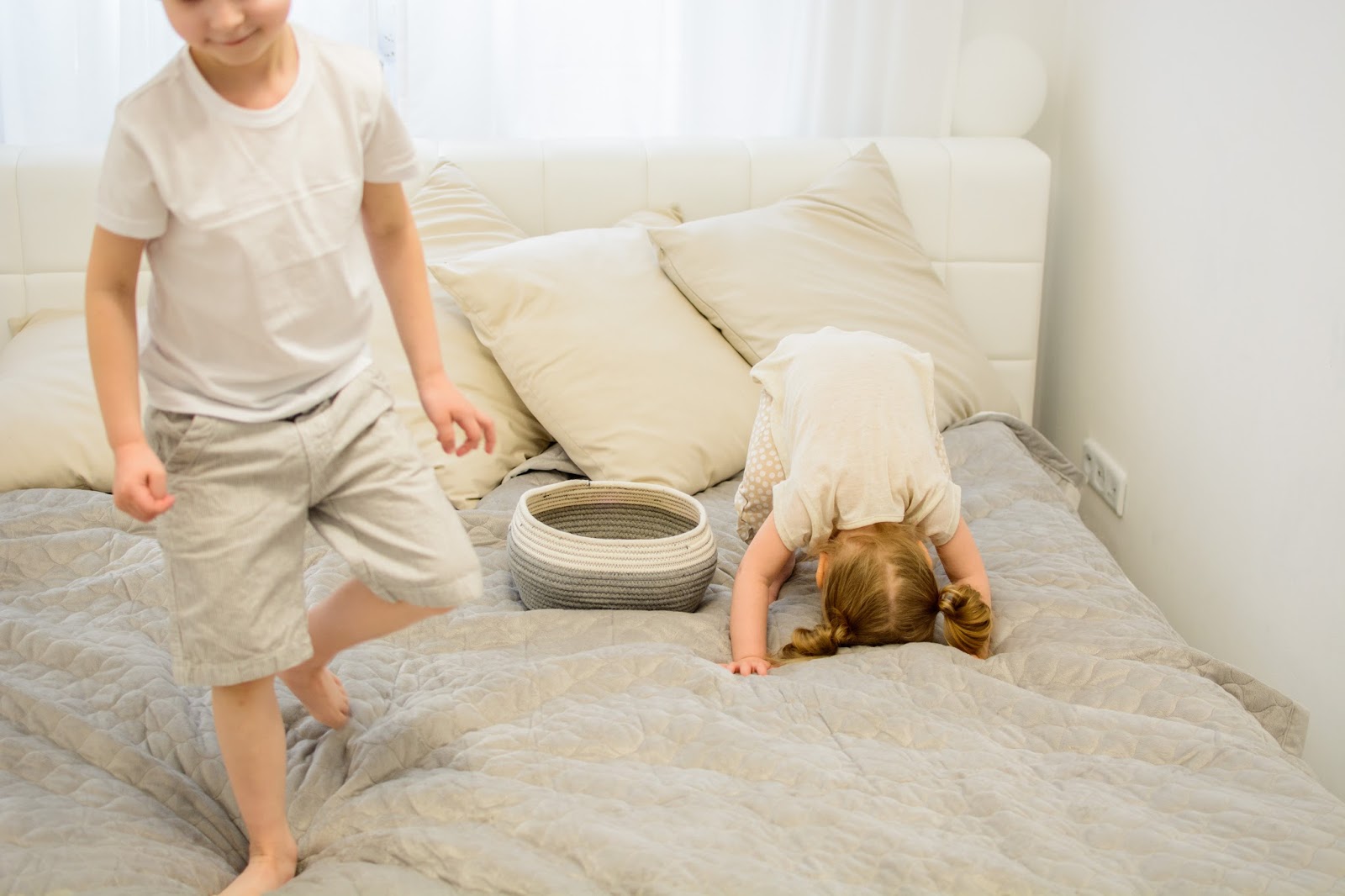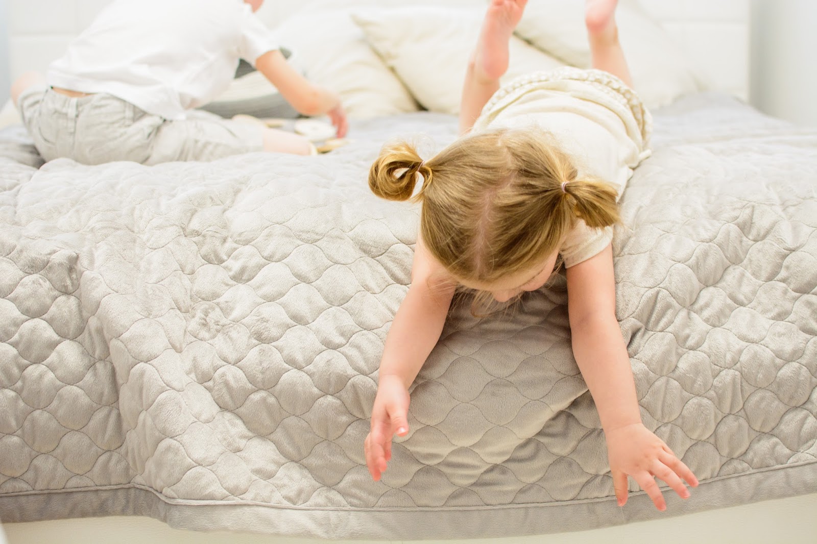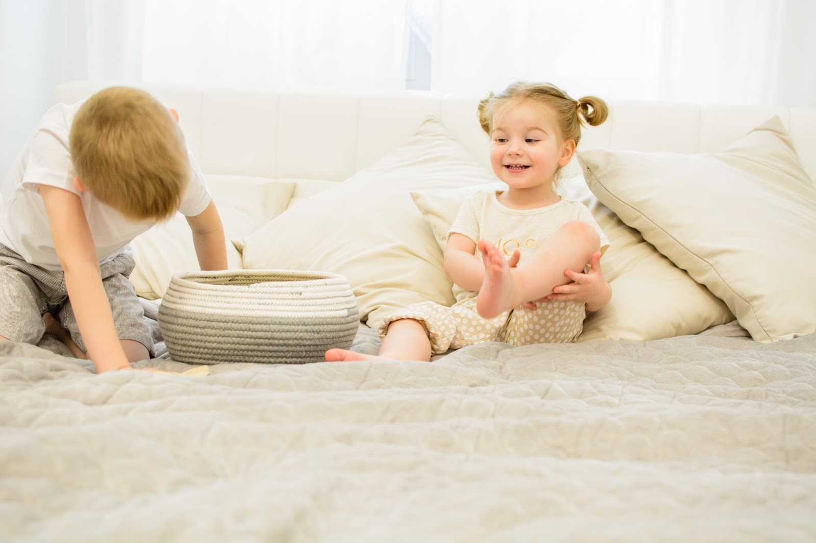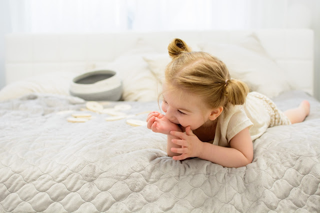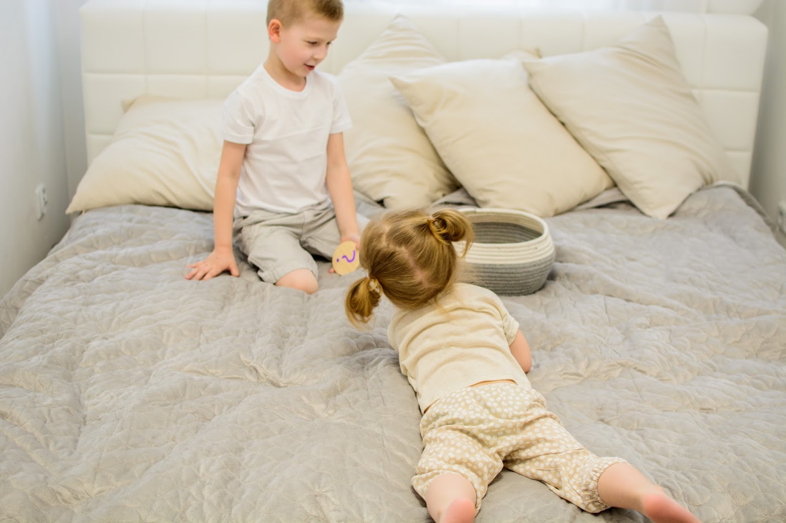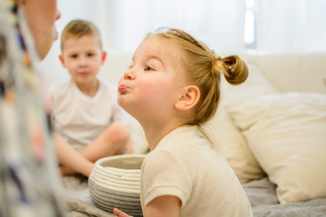 Co z tego, że mają swój pokój. Co z tego, że mają spory pokój dzienny, do którego ciągle znoszą zabawki ( Tak jak TU). Już dawno rozpoczęli ekspansję dodatkowo na nasz osobisty sypialniany teren. Zagarnęli wszystko bez skrupułów a my się im poddajemy. Budząc się rano z obcą nogą na głowie i małymi paluszkami w oku nie zawsze dobrze się wstaje. Kiedy właściciel tej nogi i tych paluszków równocześnie bezlitośnie ściąga z Ciebie cieplutką kołdrę krzycząc „mamoooooo nie śpij już!” nie wiesz czy to nadal zły sen czy już poranna rzeczywistość. Zanim młoda zacznie spać do 10tej tak jak Tomik minie jeszcze kilka lat. Tymczasem mimo tego, że jedno jeszcze śpi trzeba się zrywać do drugiego. Oczywiście zrywa się mama kiedy tata słodko jeszcze śpi. idąc dalej tym tropem im bardziej wolny jest dzień tym zrywam się wcześniej. I wtedy się zaczyna.. co tu zrobić żeby ukraść dla siebie jeszcze pięć minutek z zamkniętymi oczami, chociaż 4 poleżeć jeszcze taka niewidoczna pod kołdrą? Marzę o tym, żeby ją czymś zająć a kiedy obudzi już brata żeby zająć obydwoje. Zbyt długo myśleć nie mogę bo dość szybko pojawia się okrzyk „mamo włącz mi youtube!” dlatego próbuję coraz to czegoś nowego. Ostatnio znalazłam sposób na zajęcie porannych ptaszków – grę Moves! Drewniane koła kryją przeróżne pozy ludzików, które należy naśladować. Tylko tyle, już koniec – to im wystarcza a zajęcie mają co najmniej na pół godzinki. Skaczą na jednej nodze, robią skłony i wymachują rękami – śmiechu mają po pachy i ćwiczenia z rana zaliczone. To dla mnie gra na wagę złota. Taka, która zajmie dzieci bez konieczności uczestnictwa rodziców. Czasem tak niewiele daje wielki efekt a to, że są razem umożliwia im tysiące możliwości. Jedno zachęca drugie, pojawia się rywalizacja i oczywiście naśladowanie. Gra uczy tego, że ćwiczenia to zabawa i radość i przemyca masę zdrowego ruchu.